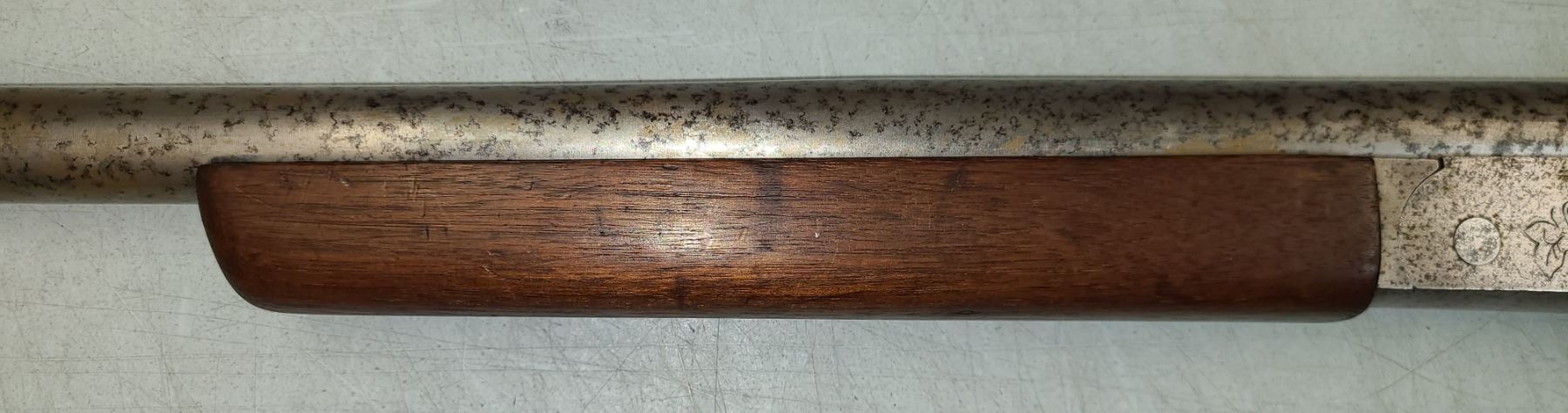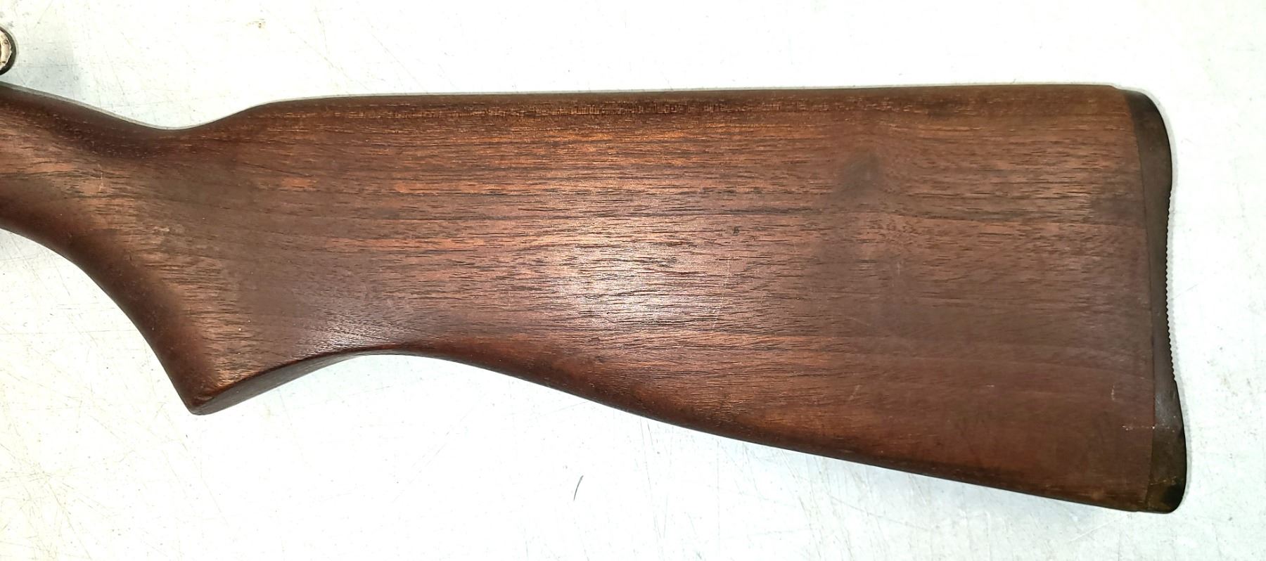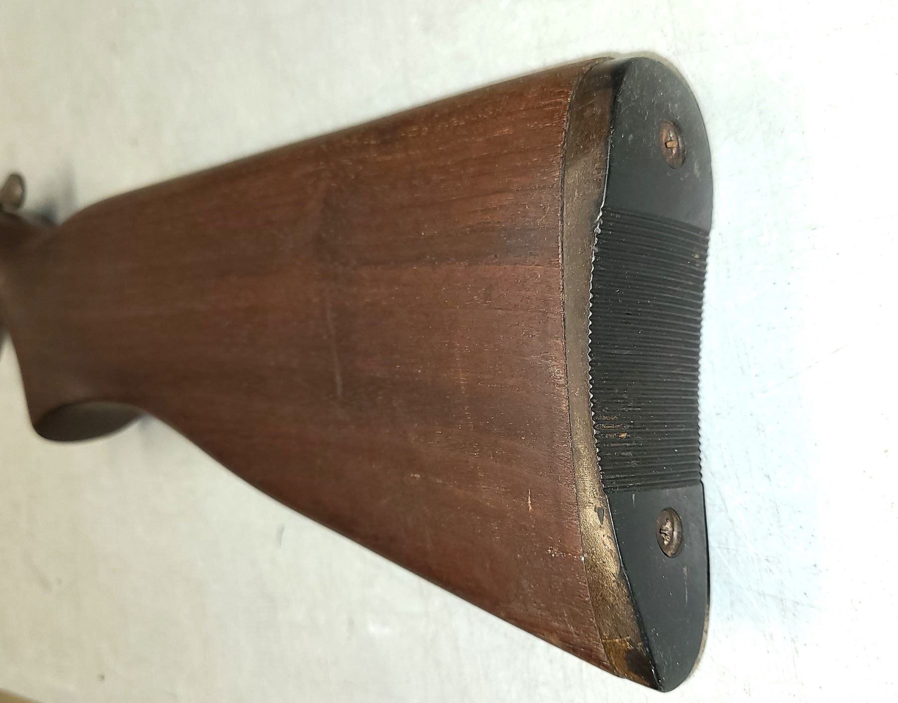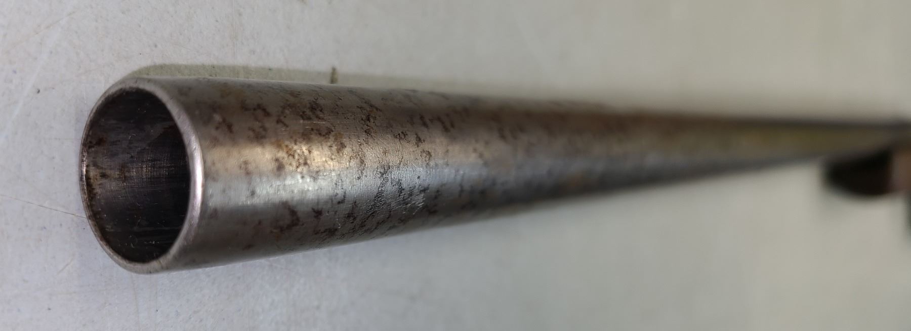 The bluing has a mottled pattern all over. The bore is fair. Front bead sight is missing.
