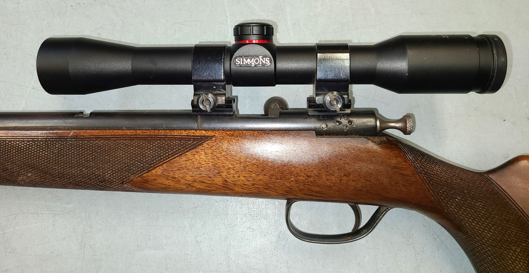 Scope is a 4 power Simmons - Has a bit of damage to front edge but does not affect function.