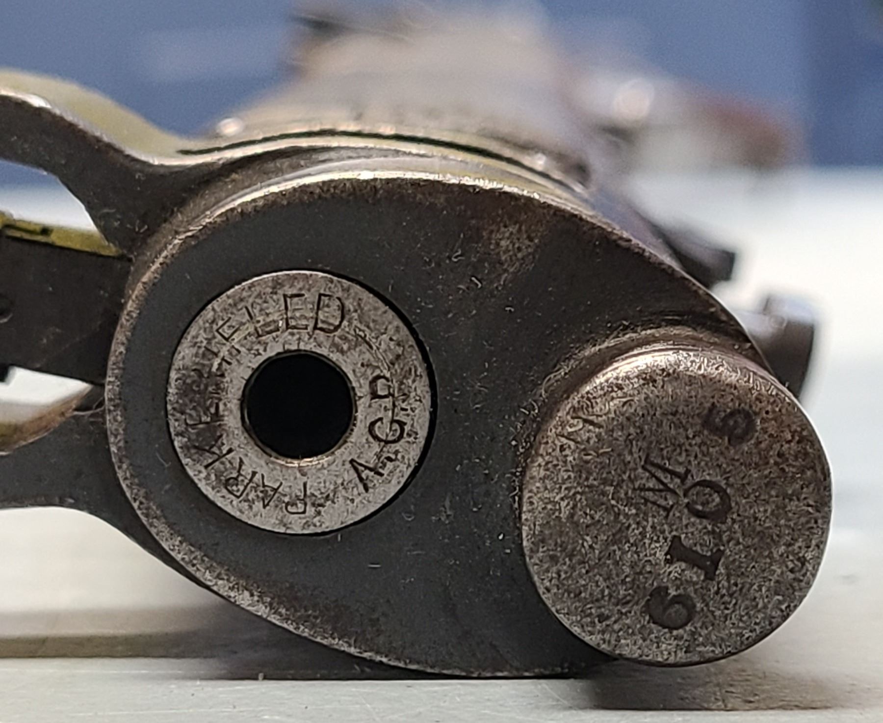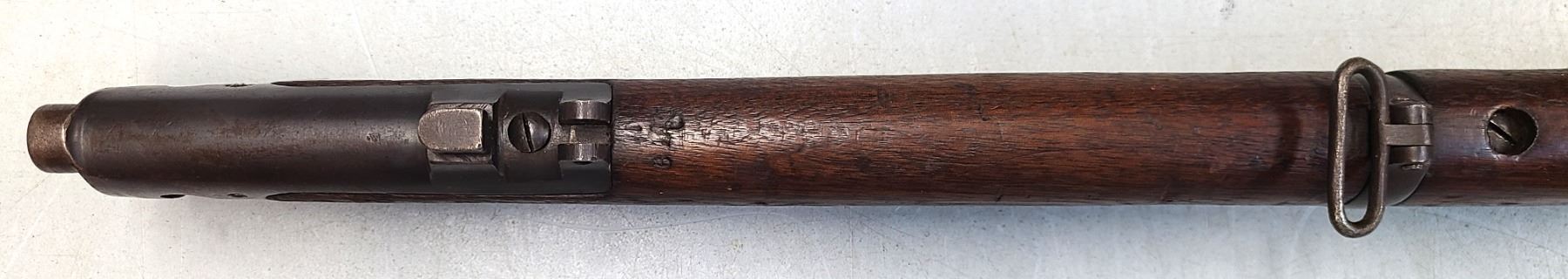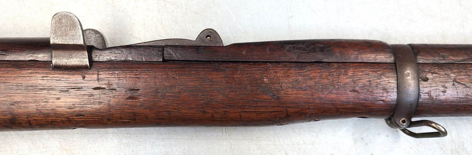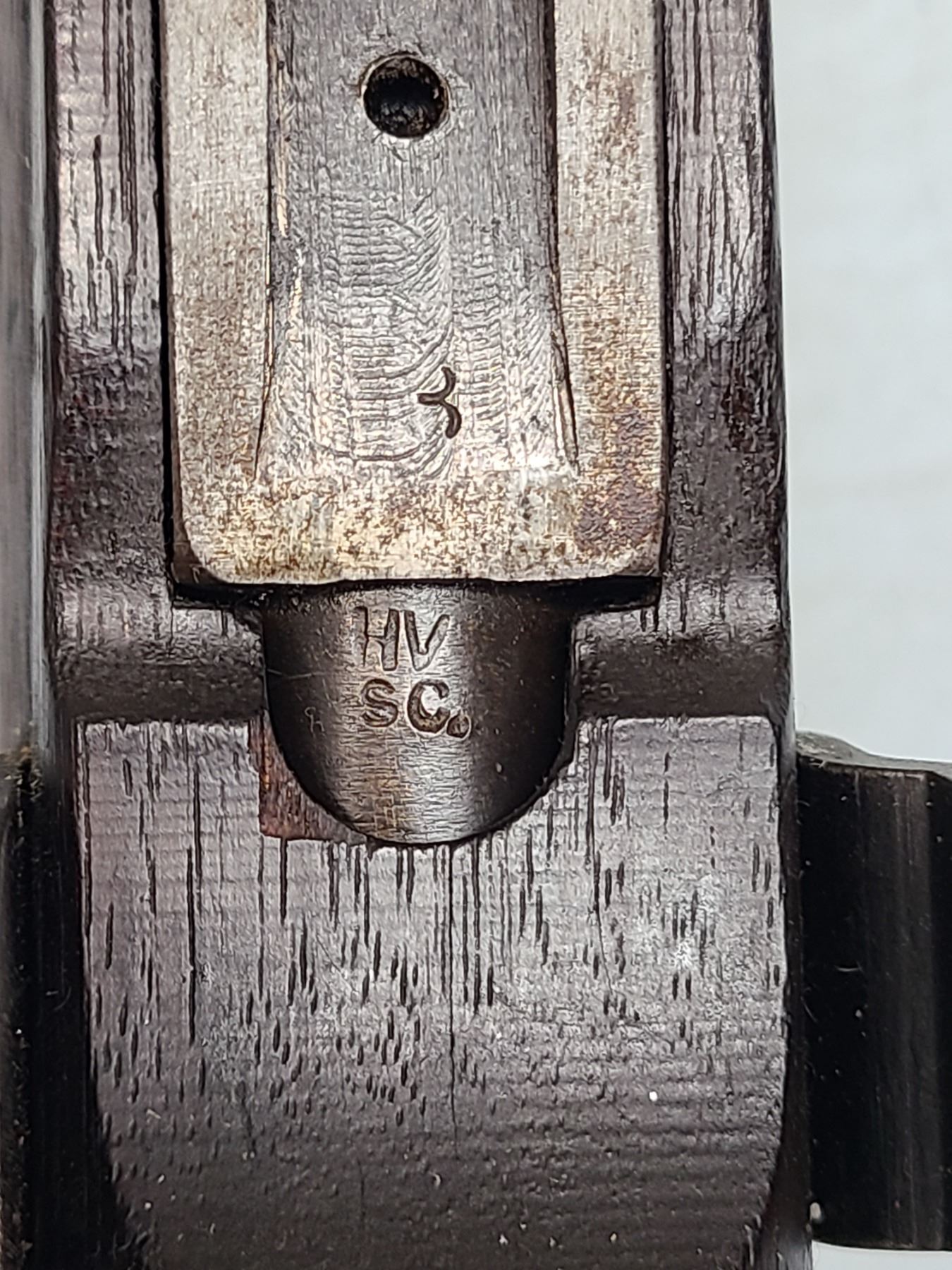Original rear sight is removed and a rudimentary peep style sight has been installed.