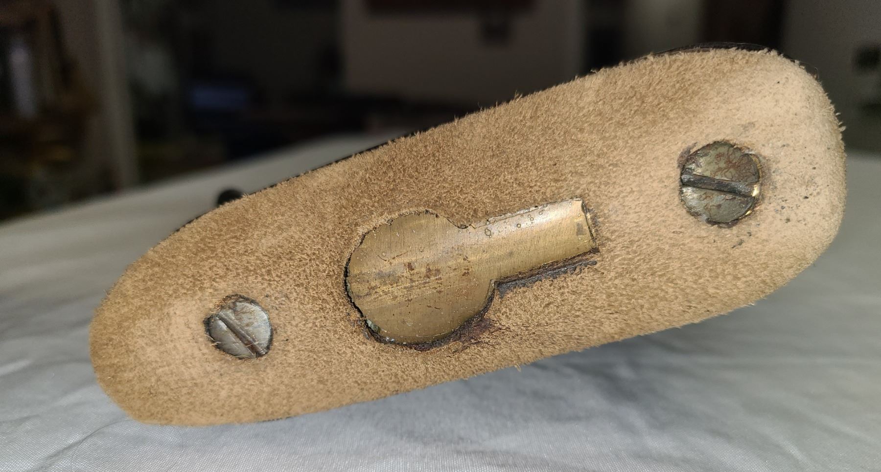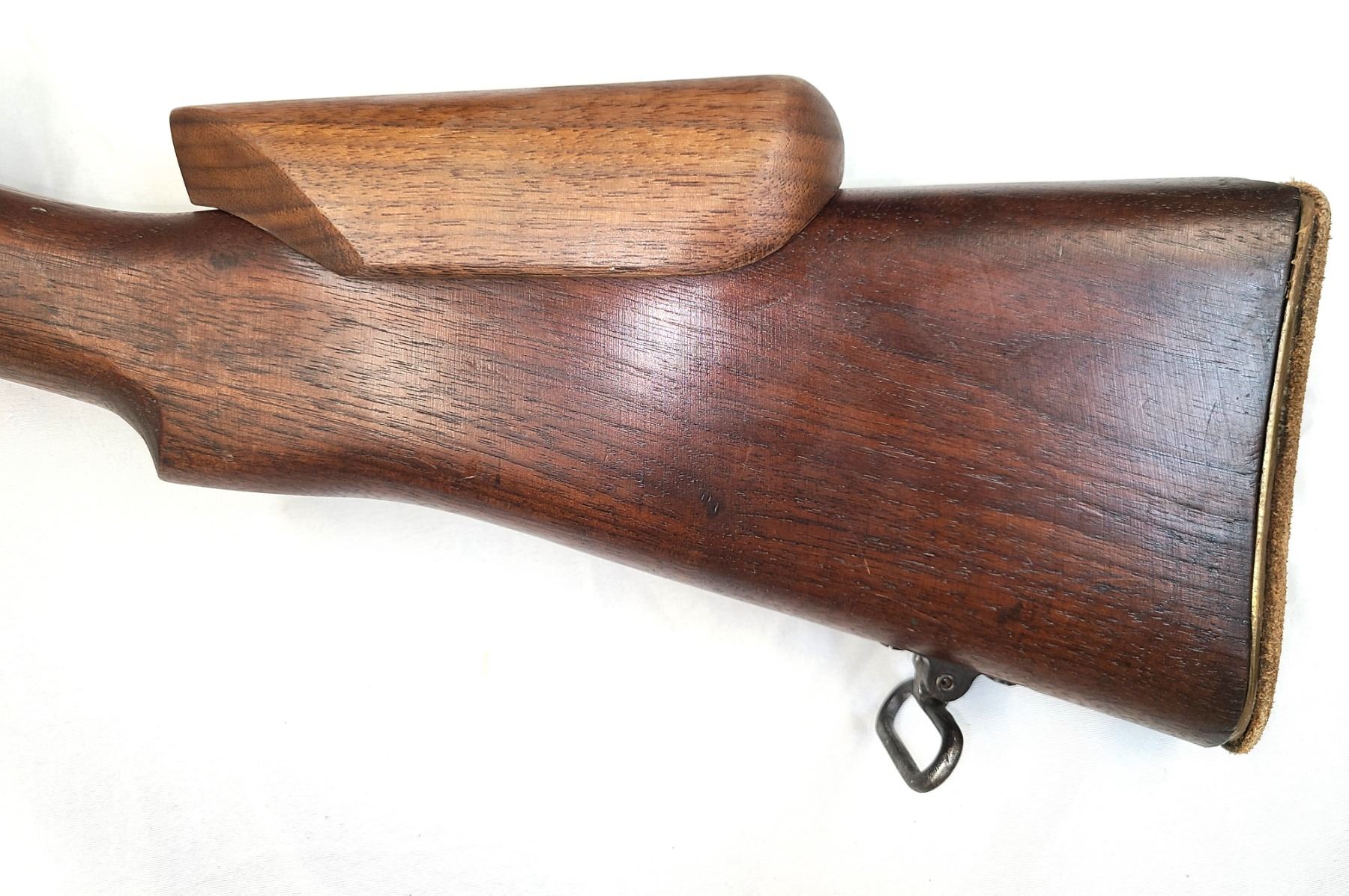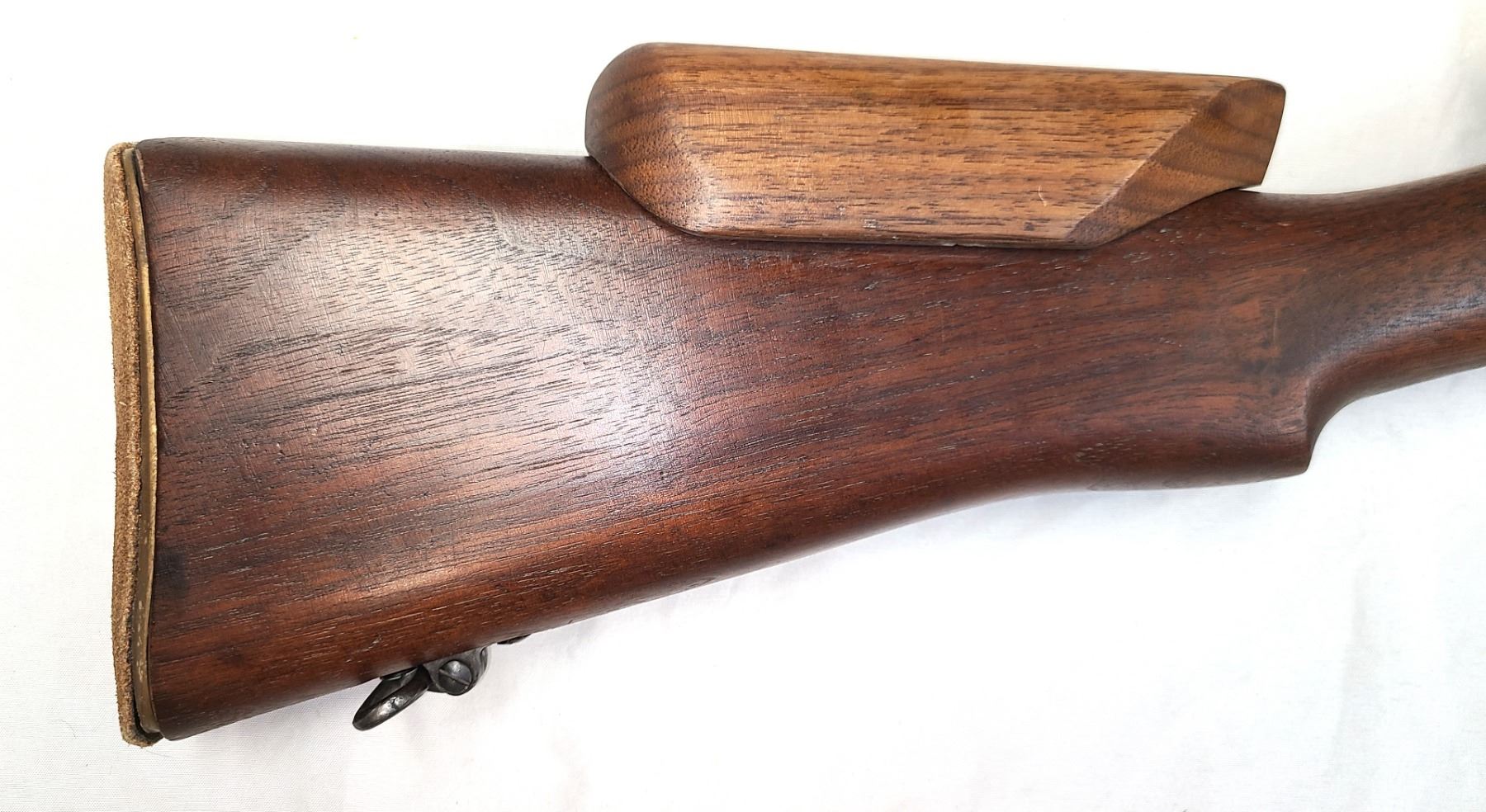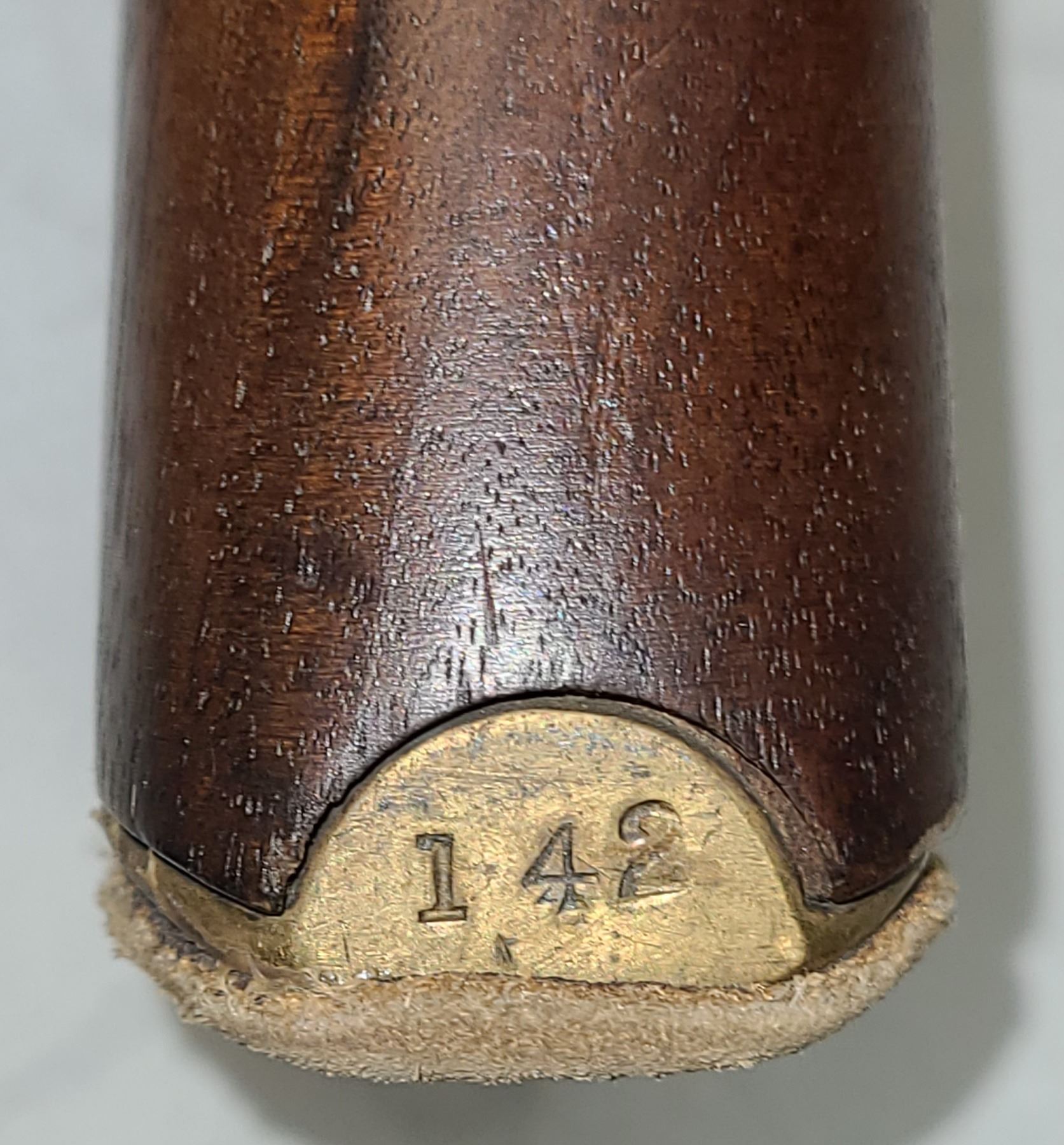 Has leather pad glued to brass butt plate.
