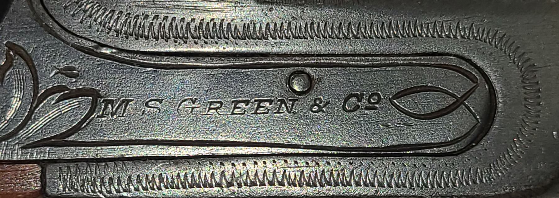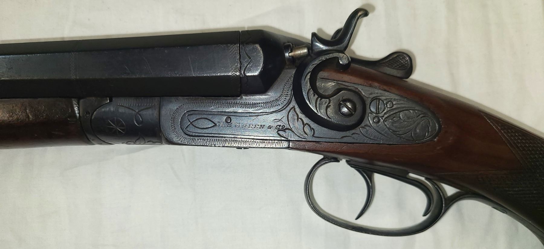 This 12ga. side-by-side exposed hammer shotgun is marked M S Green on both