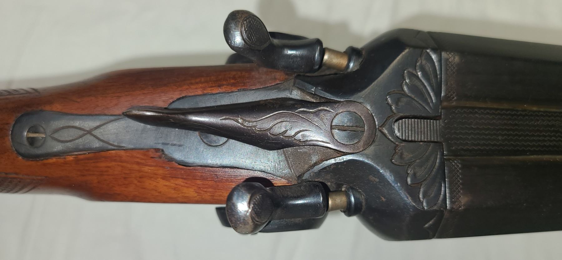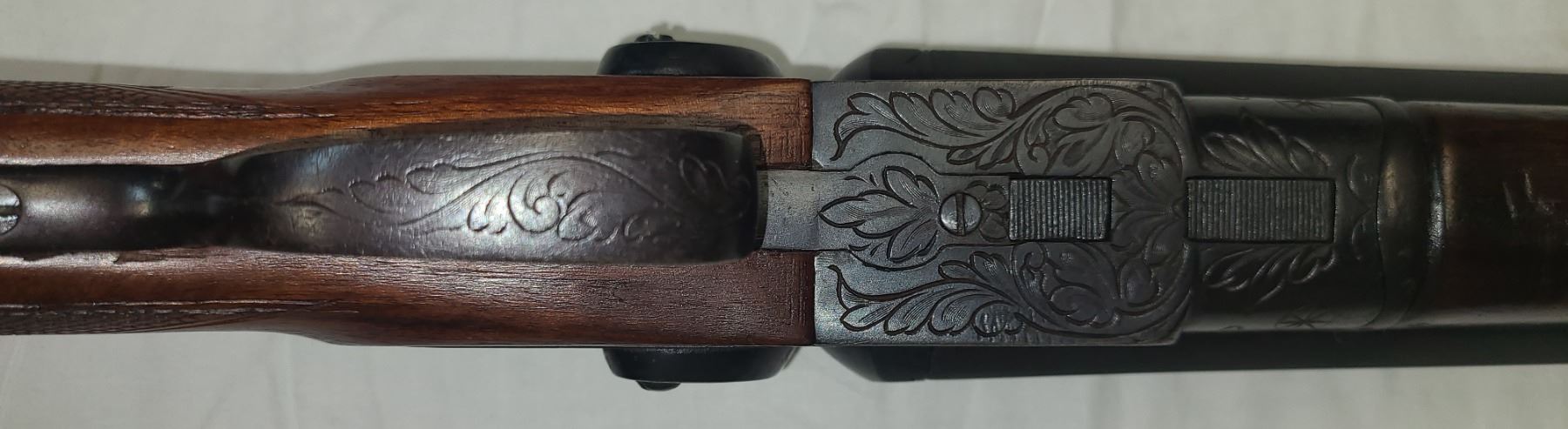 Scroll high releif engraved action. Straight grip with 12 1/2 and 13 1/2 inch pulls.