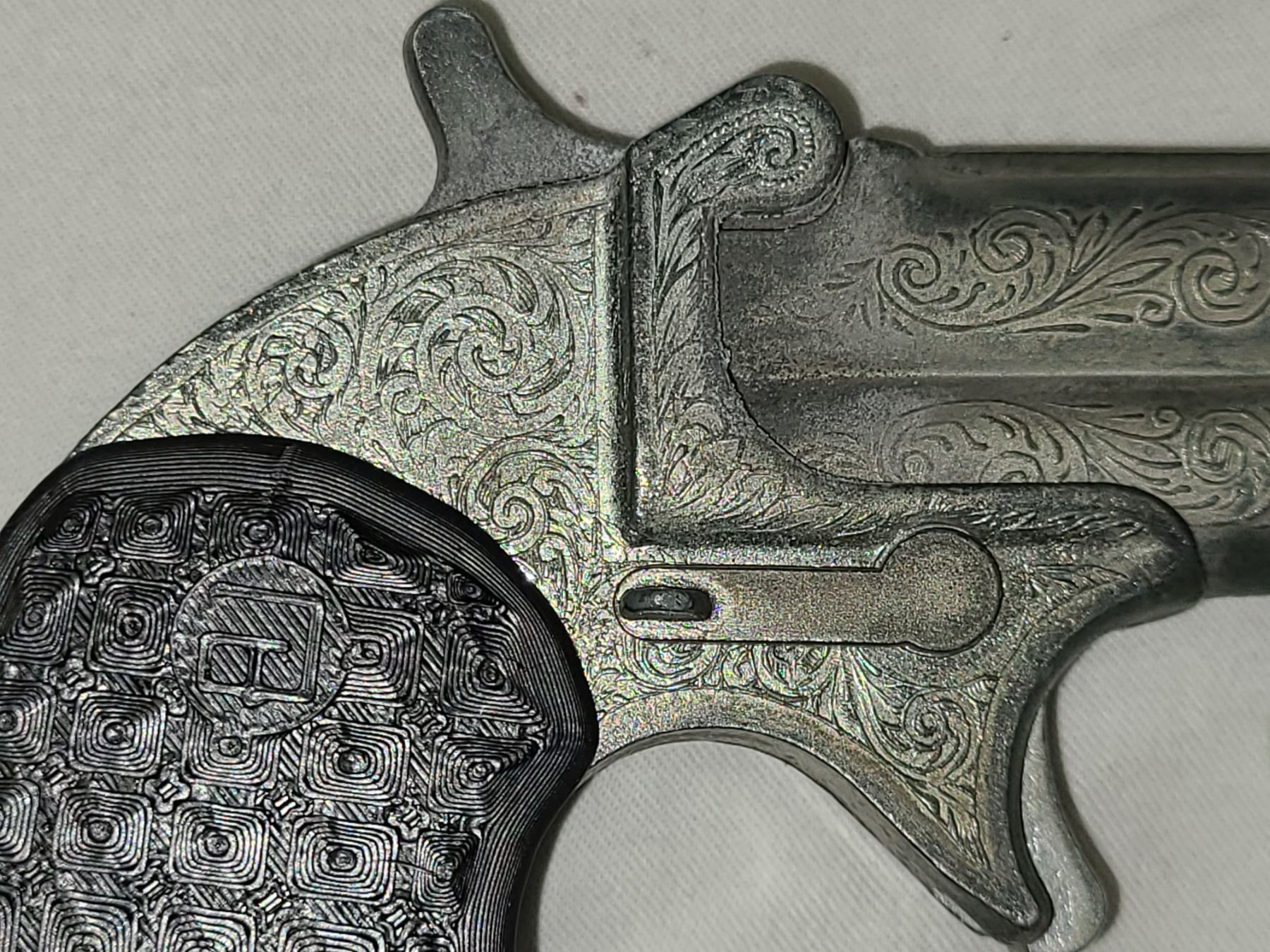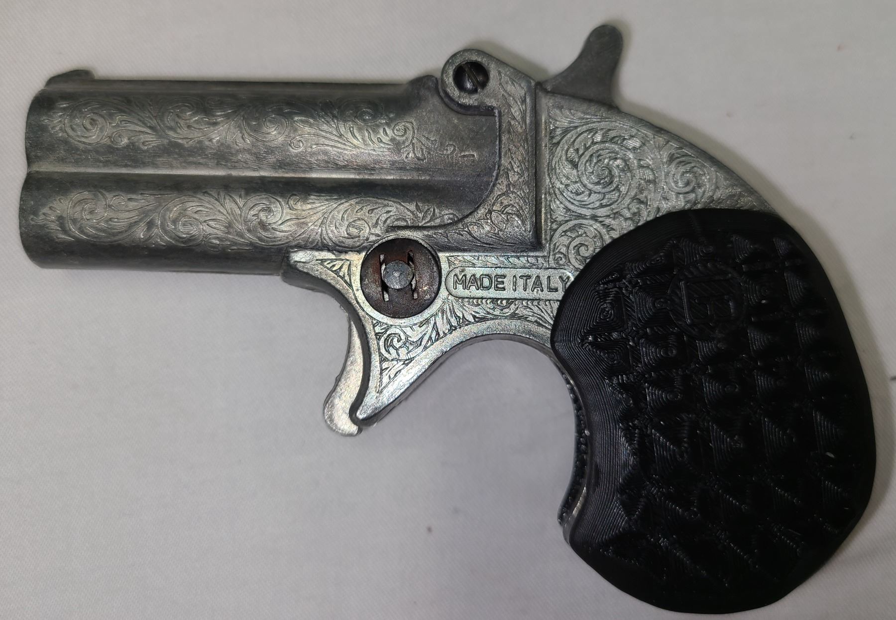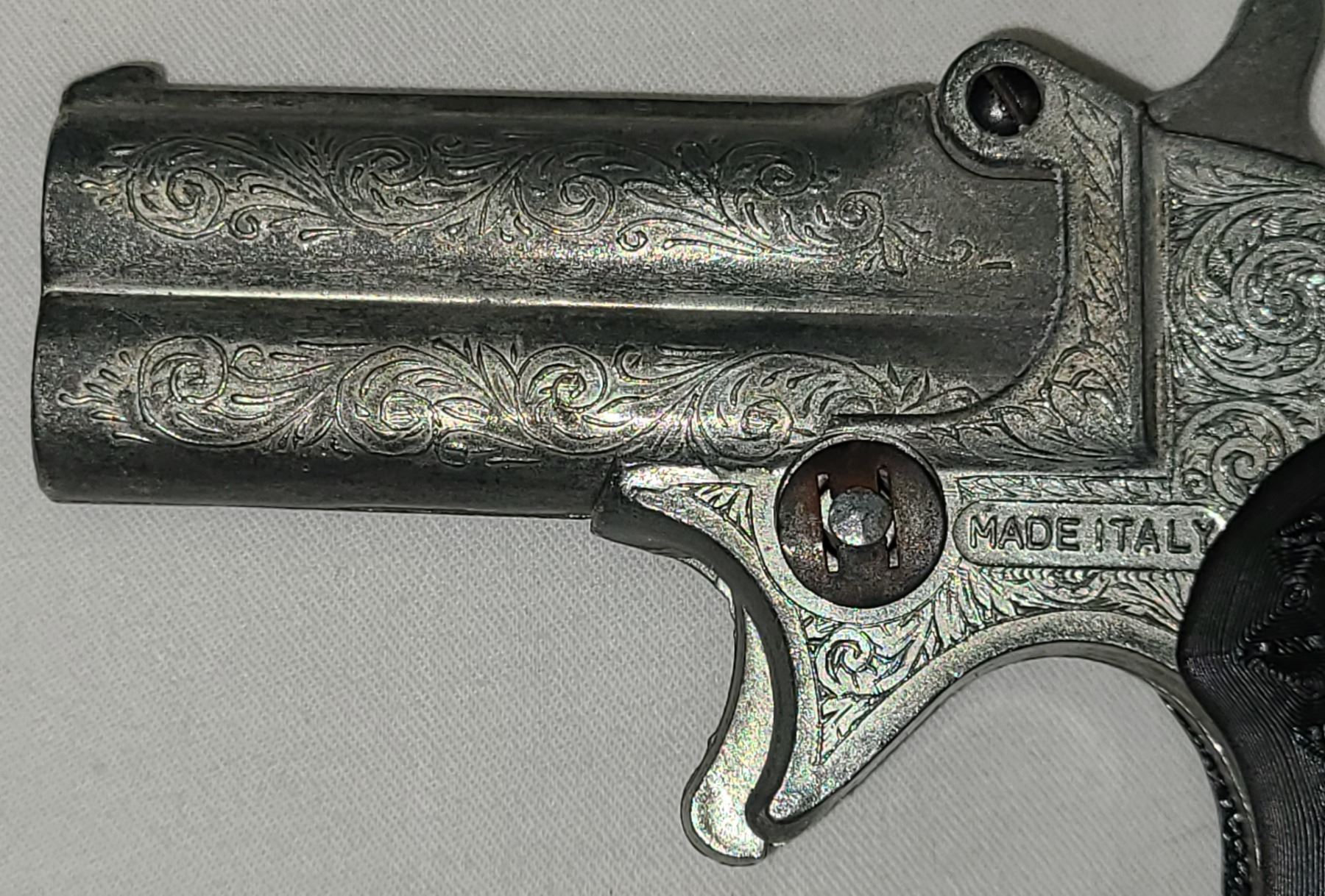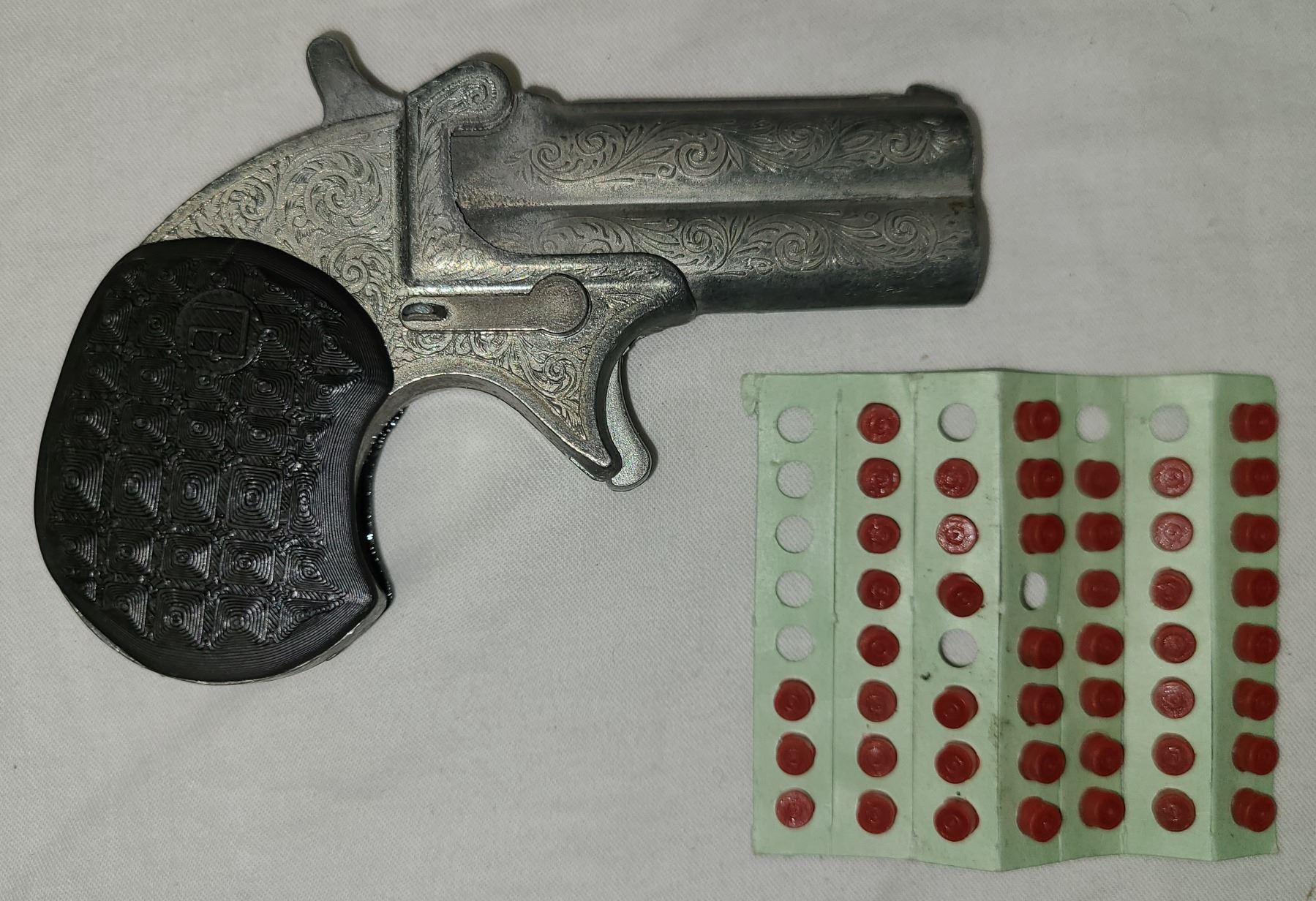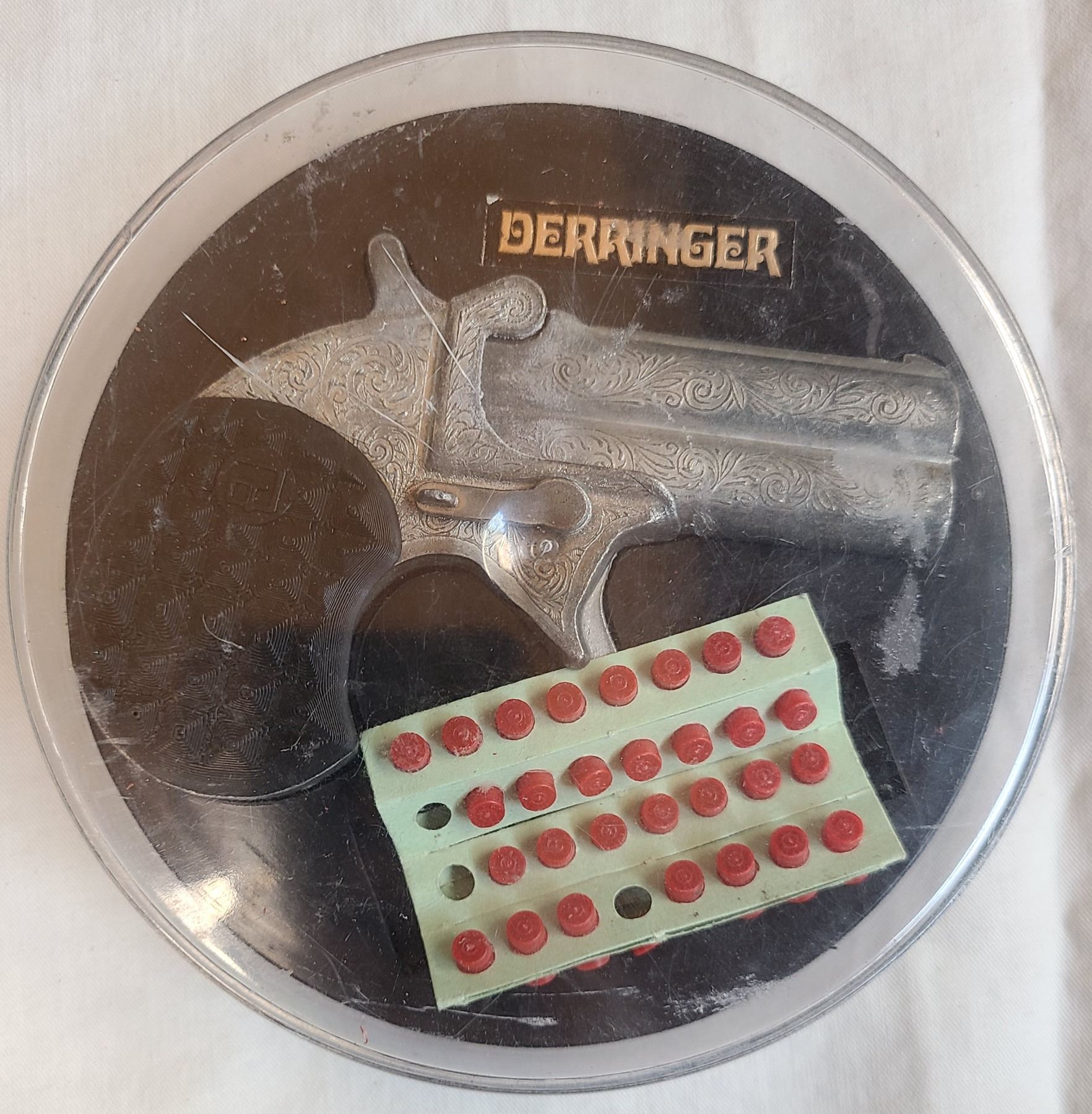 This is an Italian made Derringer cap gun. It does not shoot projectiles!