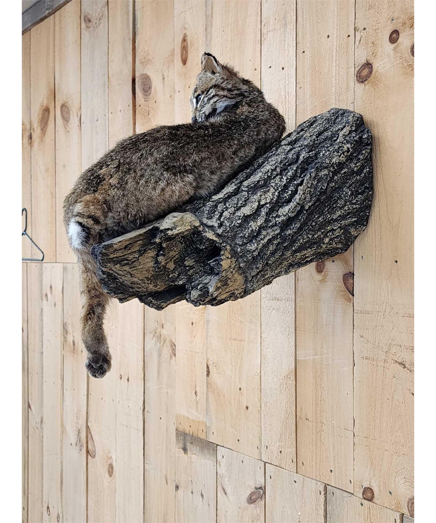 147.1 Cute pose relaxing on a log looking over his shoulder thick prime fur great markings ol light weight artificial log hanging base overall dimensions 26" long x 27" tall x 18" wide