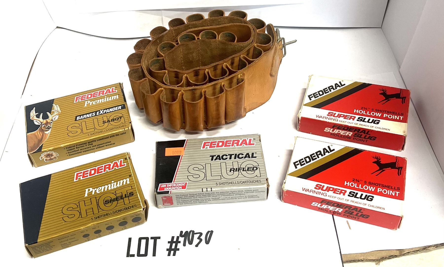 LOT 4030 - COLLECTIBLE 12GA SHOTGUN AMMO – 25 SLUGS & VINTAGE BELT