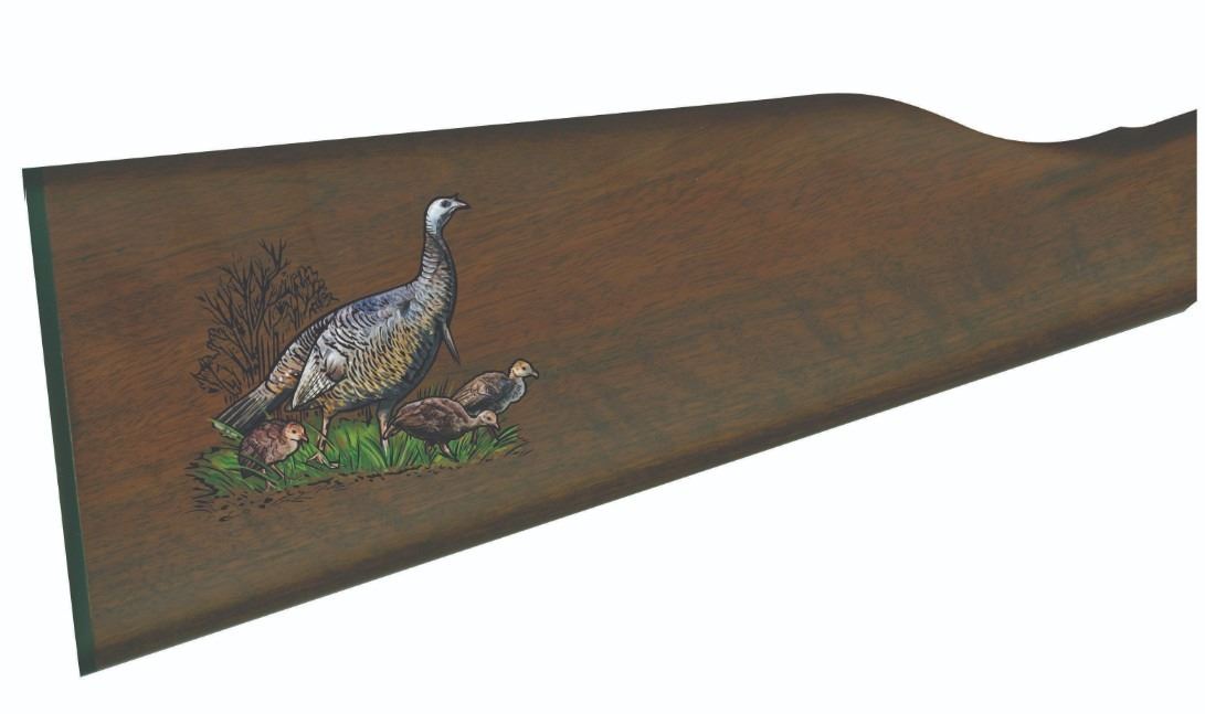 🔹 Custom Engraving: Showcases a beautifully detailed bearded hen with poults on the butt stock—an homage to wildlife heritage and family bonds in nature.