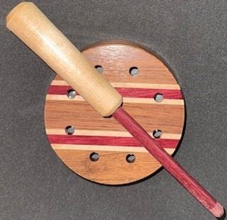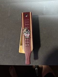 Bob Bahn - Double Sided Pot Call- Double sided with the pot being cherry with purpleheart stripes and the surface is blasted copper with a slate sound board. Striker is Hickory with maple top and purple heart stripes.