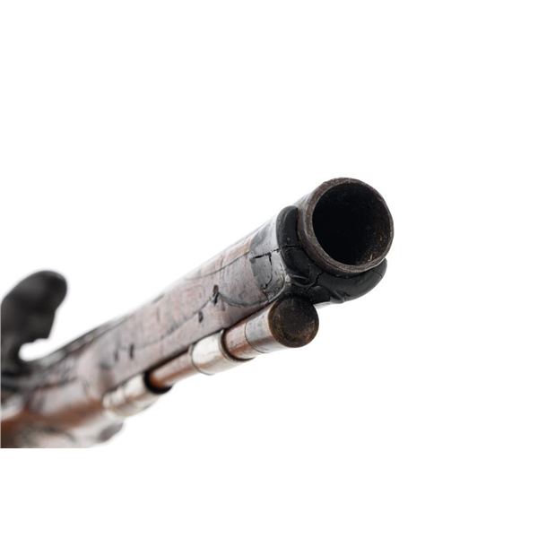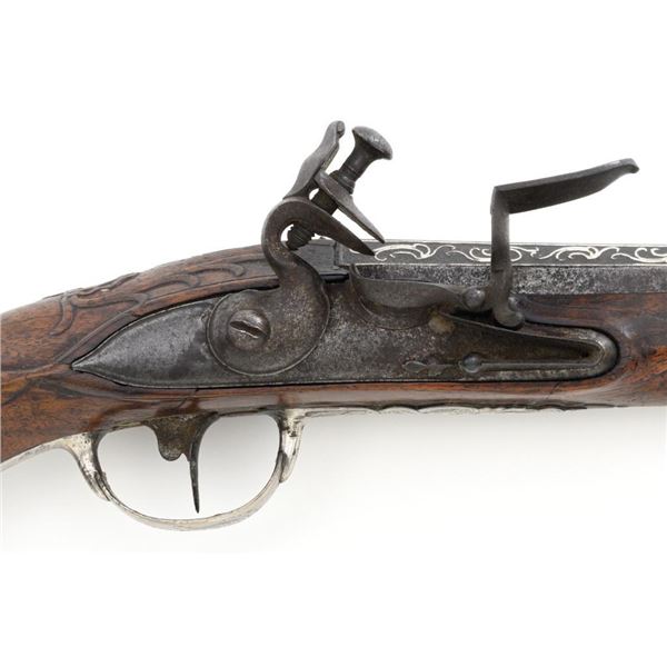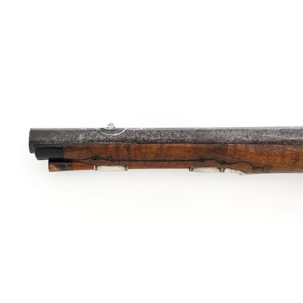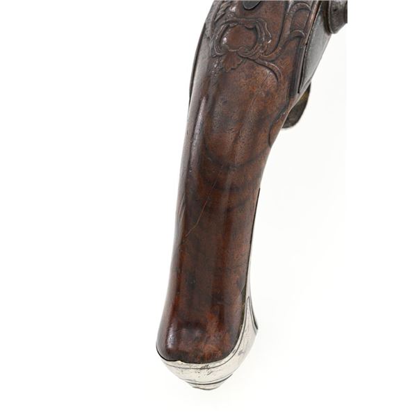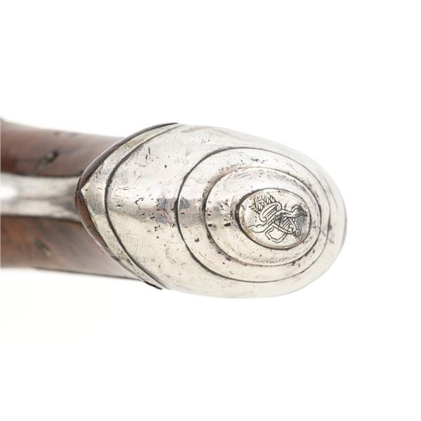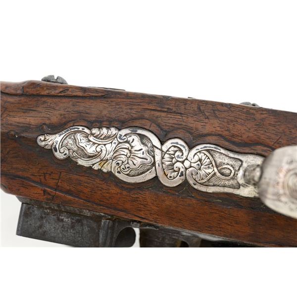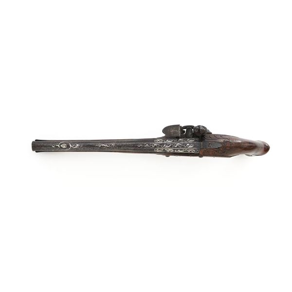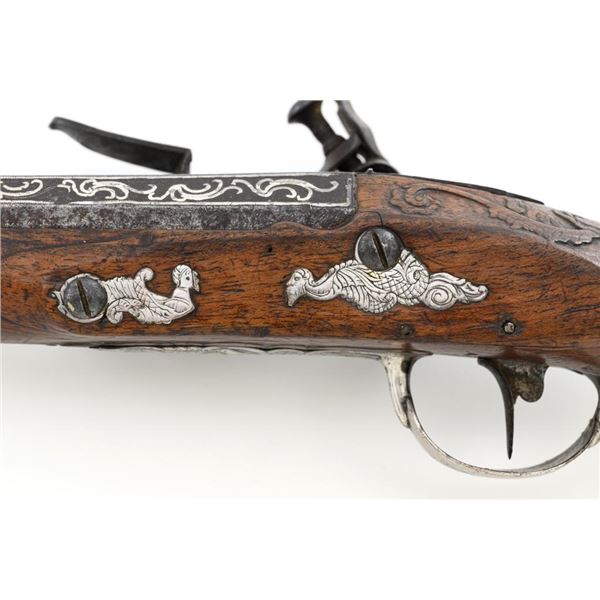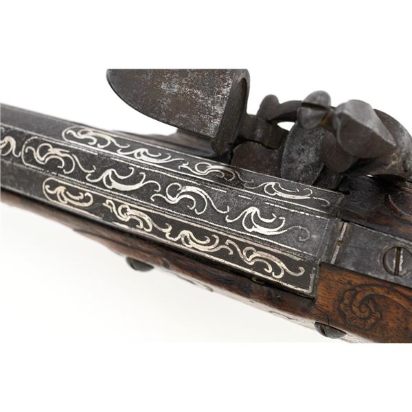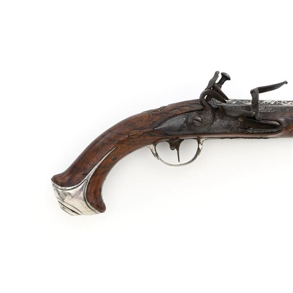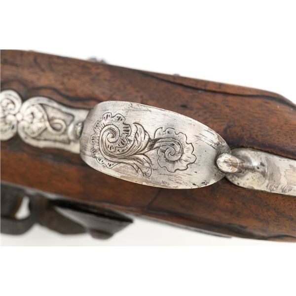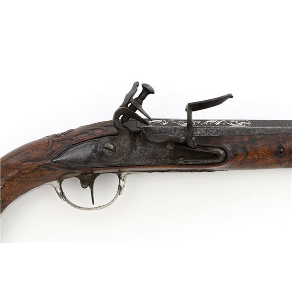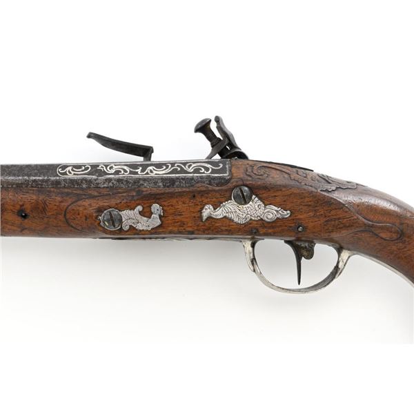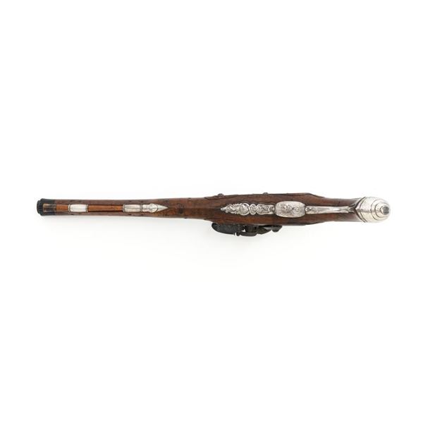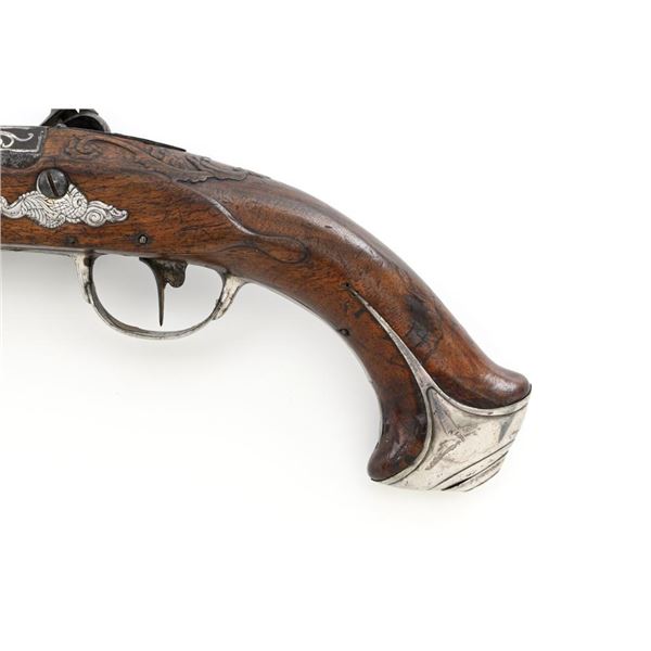 Antique German Silver Mounted Flintlock Pistol, #NVSN, .65 cal., 12.5" barrel, dark gray patina to the metal surfaces. Barrel with fancy silver scroll inlays on approx. 5" at the rear three flats, plus another at near mid-barrel, and another silver inlay circling the front fixed blade silver sight. Pistol also features fancy silver trigger guard/base, butt cap, two ramrod thimbles, and two sideplates. Stock is carved hardwood. There are no markings on the lockplate. Mfgd circa early 1800s. Overall condition is good with a black/gray patina to the barrel, lockplate, hammer, trigger, pan, striker mechanism & misc. securing screws, with the balance of parts silver as noted above. Action is crisp, bore shows even moderate erosion. Est.: $1,800-$2,400 (Antique)