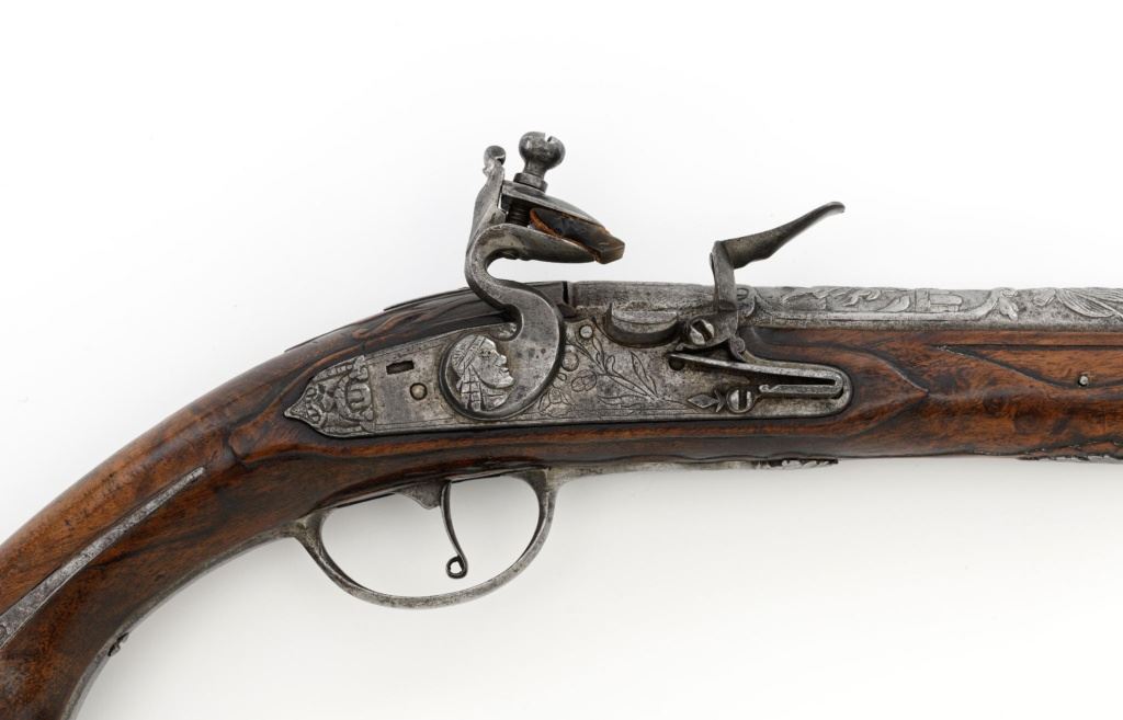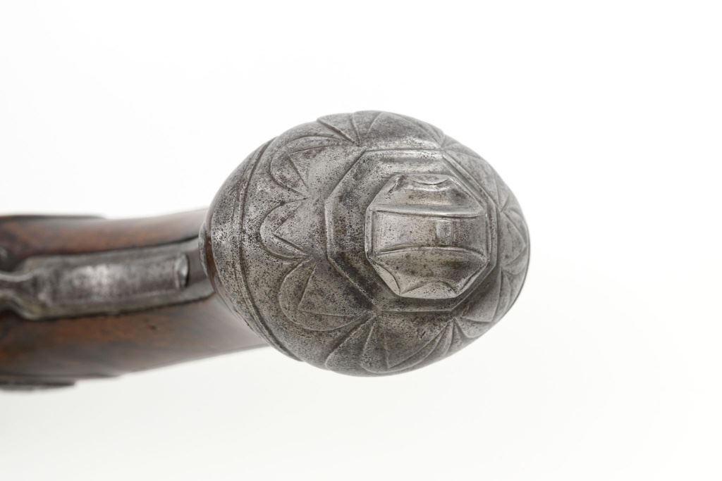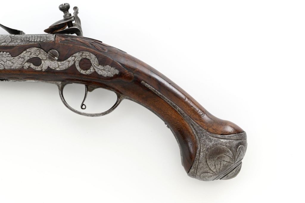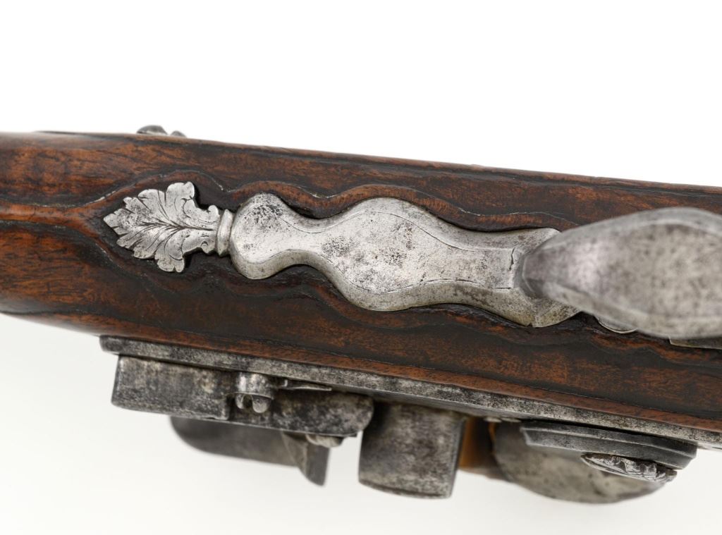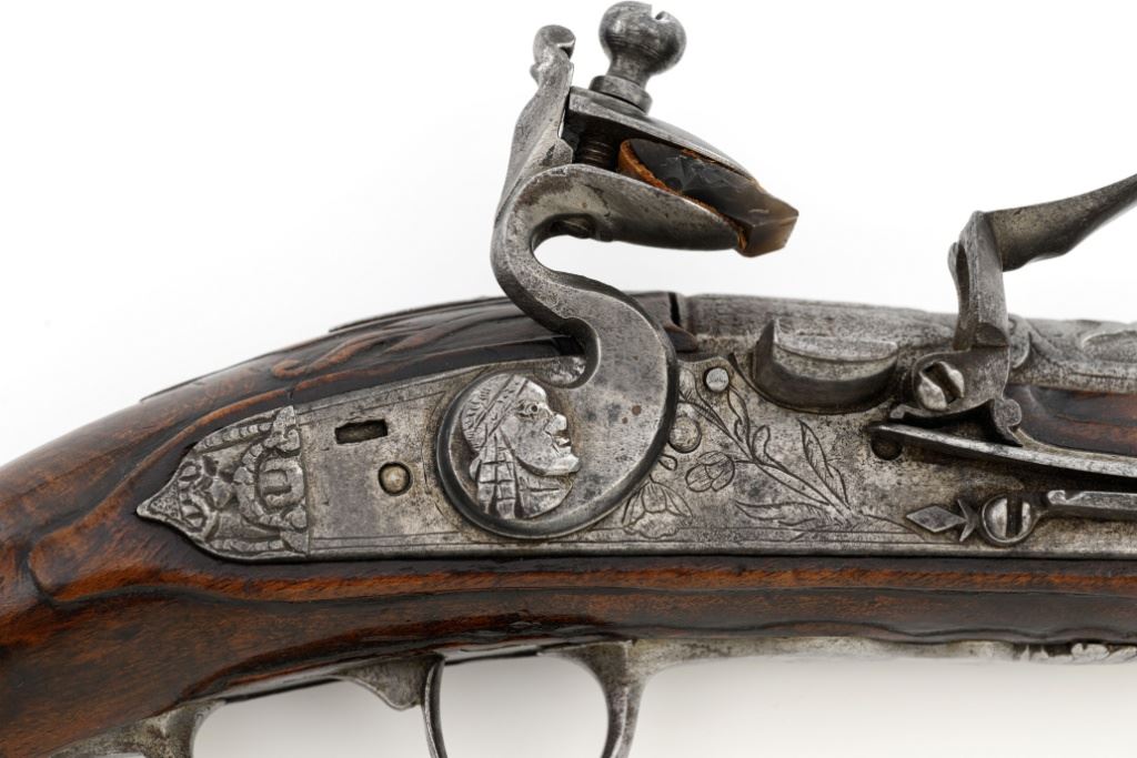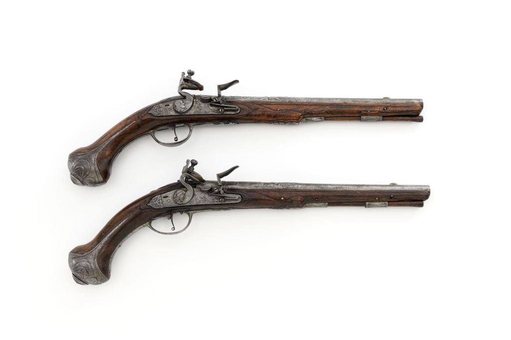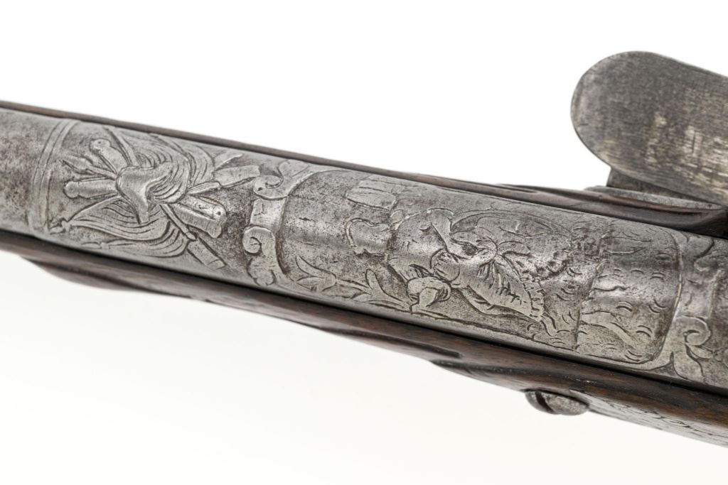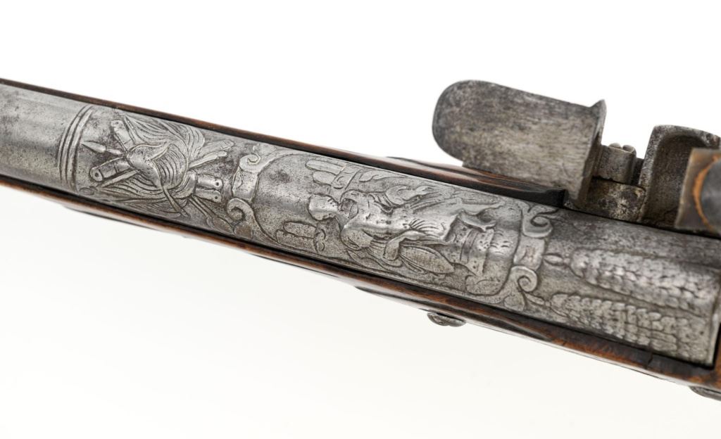 Pair of Extensively Decorated Italian Flintlock Horsemans Pistols, #NVSN, .58 cal., 12.75" barrels with raised images on the top rear portions of each barrel. Metal parts display a matching even gray patina. Hardwood stocks with an approx. 5" finely engraved serpent on the left side of both pistols above the trigger guard. Wooden ramrods accompany each pistol. Special features include 6" of raised decoration at the breech end of each barrel, depicting images, including a seated figure and crest of arms. There are also raised figureheads at the bottom of both hammers, floral engraving and raised gargoyle at the rear of each lockplate. Mfgd circa mid-1700s. Overall condition of both pistols is very good+ with a pleasing even gray patina. Hardwood stocks show expected age and wear, retaining an old rich oil finish. Actions are crisp, bores show even moderate erosion. Est.: $2,000-$2,500. (Antique)