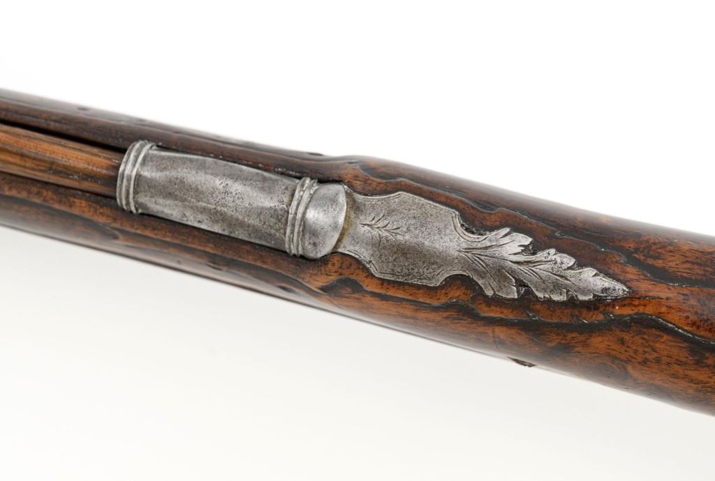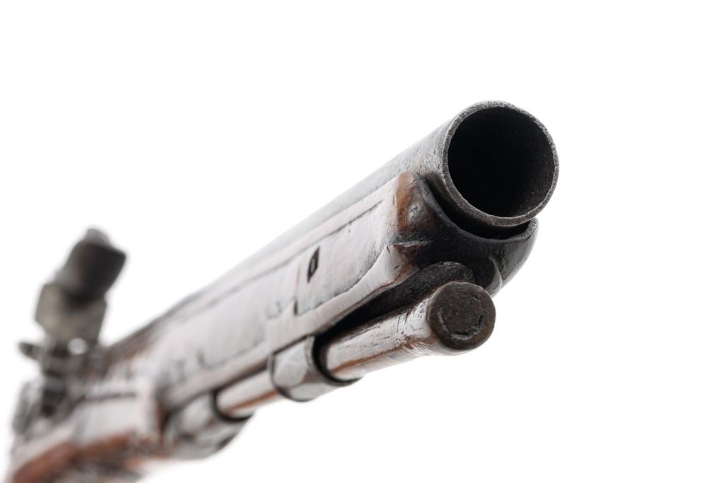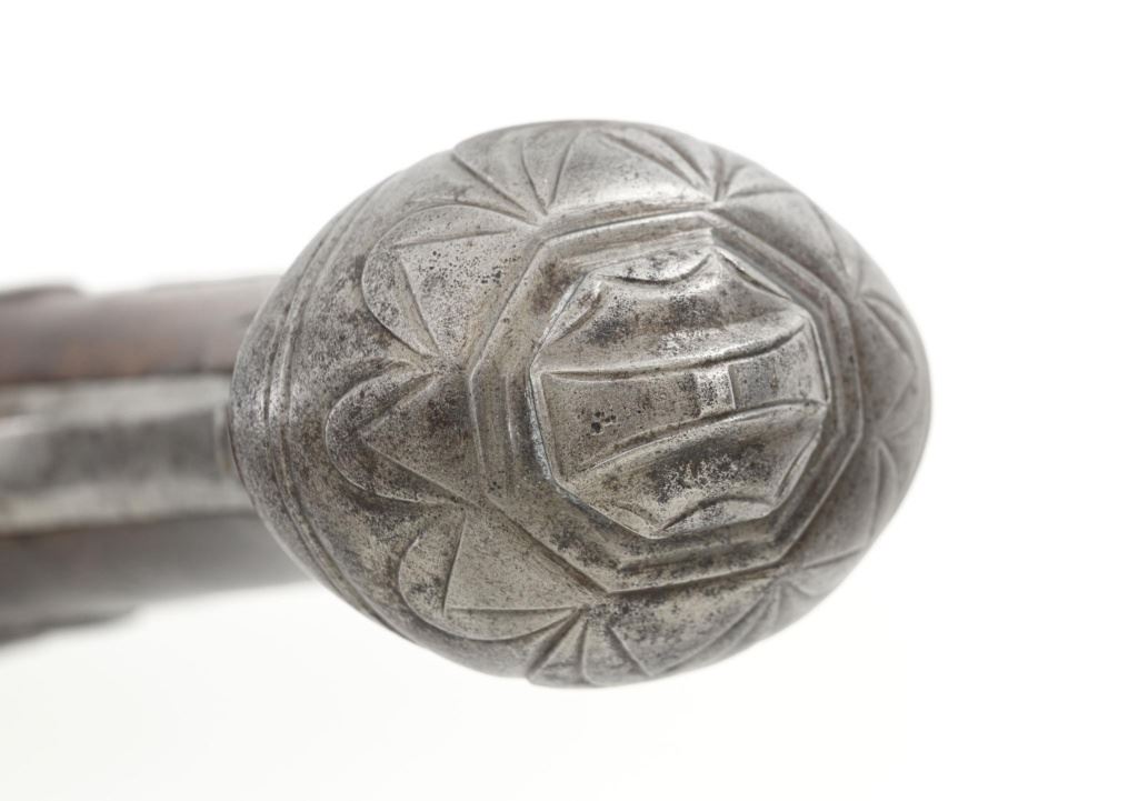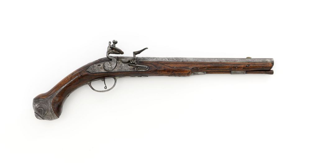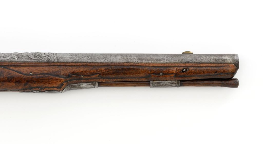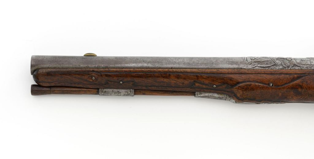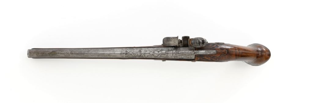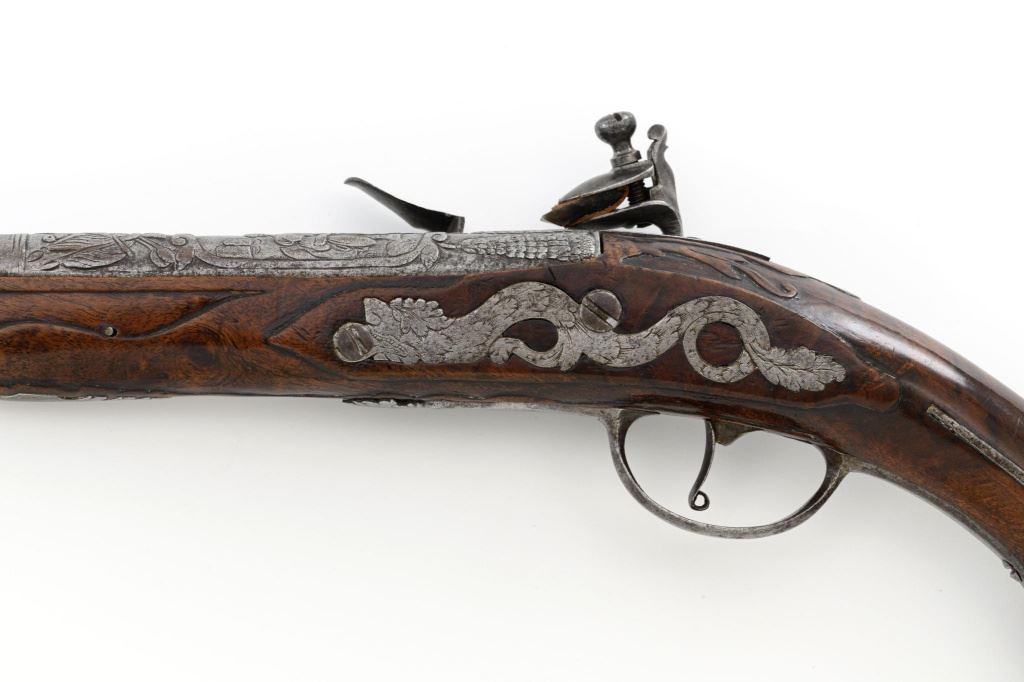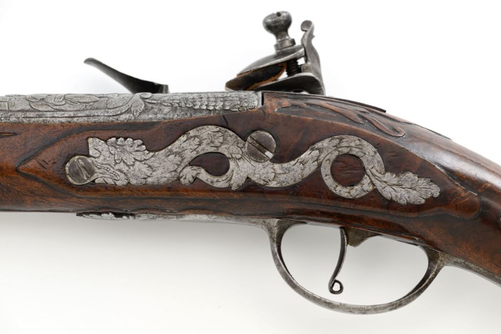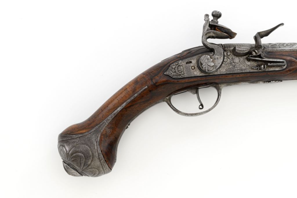 Pair of Extensively Decorated Italian Flintlock Horsemans Pistols, #NVSN, .58 cal., 12.75" barrels with raised images on the top rear portions of each barrel. Metal parts display a matching even gray patina. Hardwood stocks with an approx. 5" finely engraved serpent on the left side of both pistols above the trigger guard. Wooden ramrods accompany each pistol. Special features include 6" of raised decoration at the breech end of each barrel, depicting images, including a seated figure and crest of arms. There are also raised figureheads at the bottom of both hammers, floral engraving and raised gargoyle at the rear of each lockplate. Mfgd circa mid-1700s. Overall condition of both pistols is very good+ with a pleasing even gray patina. Hardwood stocks show expected age and wear, retaining an old rich oil finish. Actions are crisp, bores show even moderate erosion. Est.: $2,000-$2,500. (Antique)