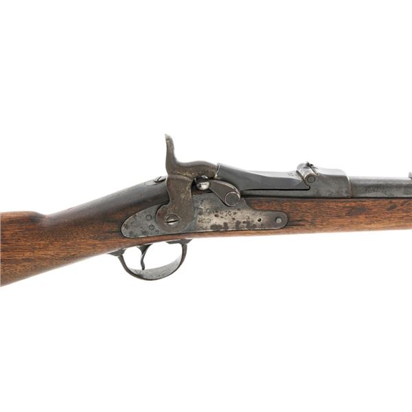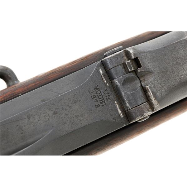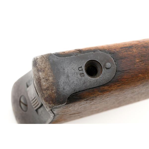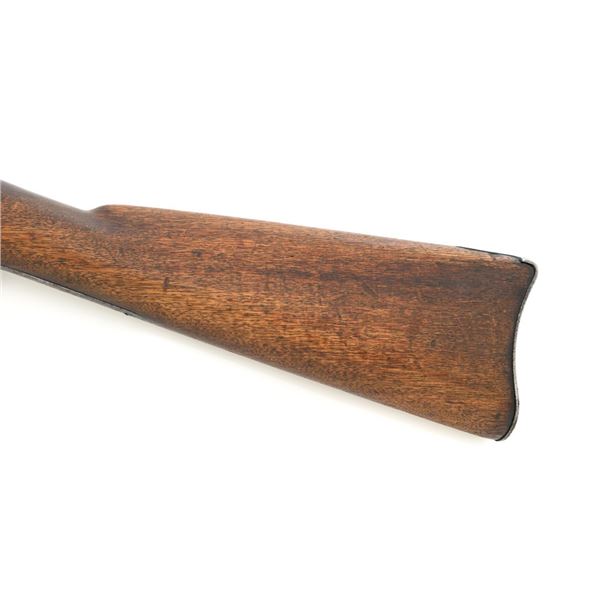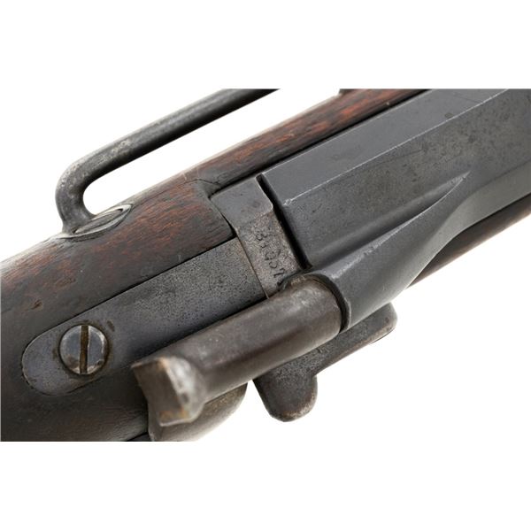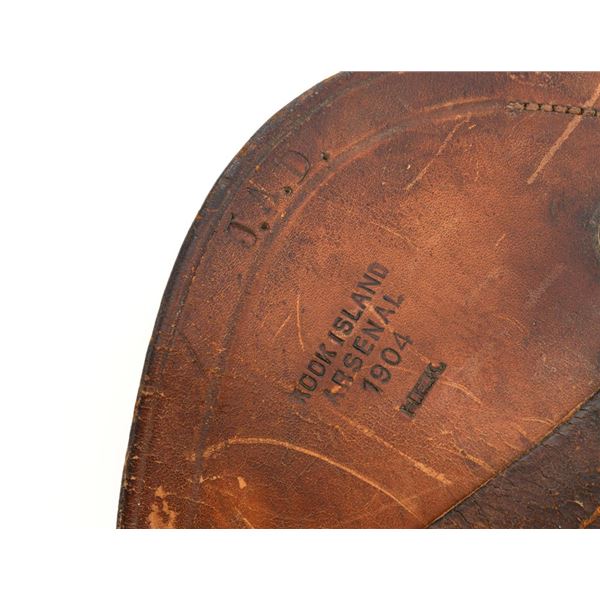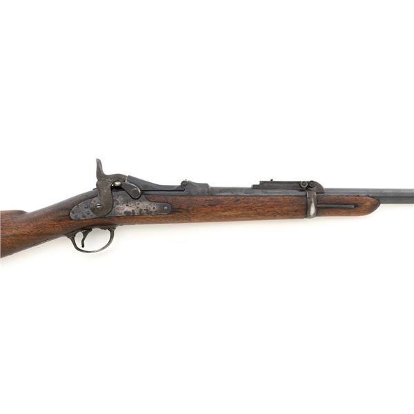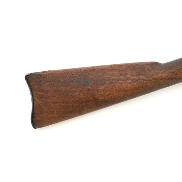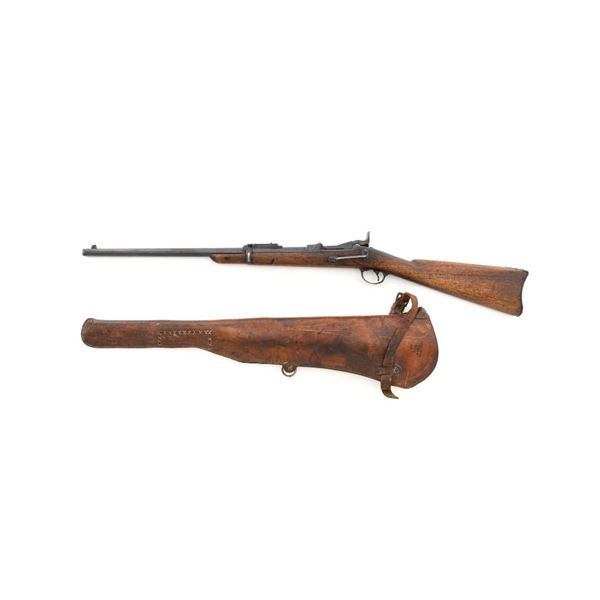 Springfield Armory Model 1884 Trapdoor Carbine, #340571, .45-70 cal., 22" barrel blue and case hardened finish, walnut stock, blade front sight, and Model 1884 adjustable "U"-notched rear sight. Included is a leather R.I.A. saddle scabbard. Receiver has the serial number and the breech block is marked "U.S./MODEL/1873", with a bronze firing pin. Lockplate is faintly marked "(eagle)/ U.S. /SPRINGFIELD/1873". Barrel is marked "VP/(eagle)/P" with an "R" on top. Condition is good overall. Metal shows overall wear and patina, heavier on the lockplate, and the barrel appears to have been reblued, with scattered pinprick rust spots. Stock has a faint circled "P" behind the trigger plate and shows heavy overall use with cracks behind and in front of the lockplate. Action functions properly. Bore is very good with clearly defined rifling. Scabbard is for a M1899 KRAG carbine and marked "ROCKISLAND/ARSENAL/1904/H.E.K." with "F/11 CAV/37" on the opposite side. Includes one original strap. Scabbard shows heavy use and scratches with stitching opened at the bottom and a 4.5" x 1.5" leather patch repair. Est.: $700-$900. (Antique)
