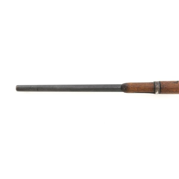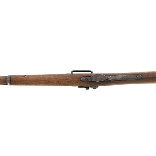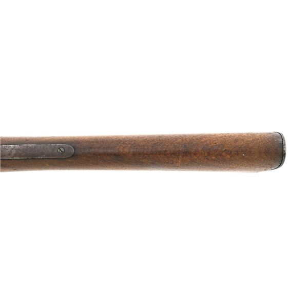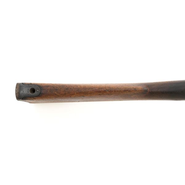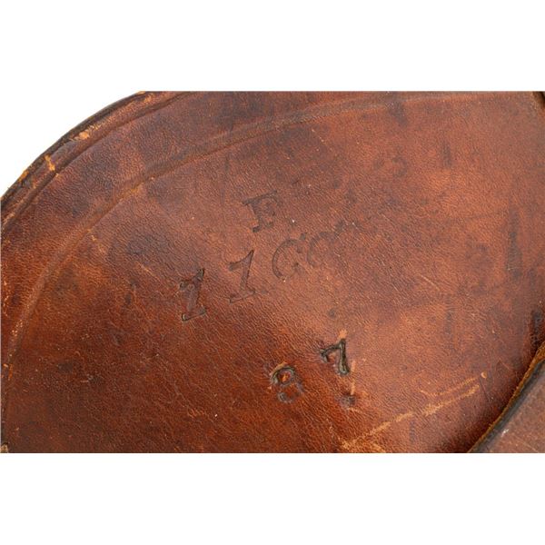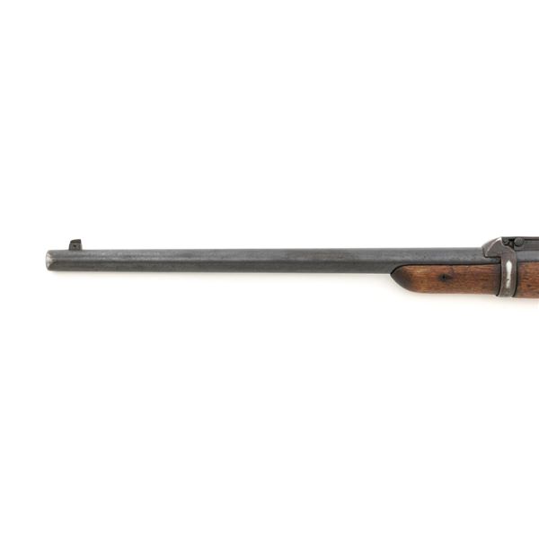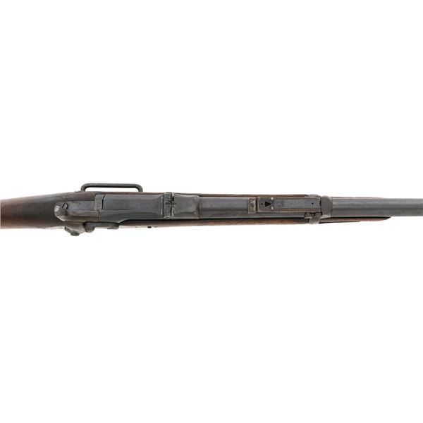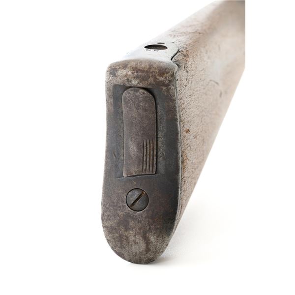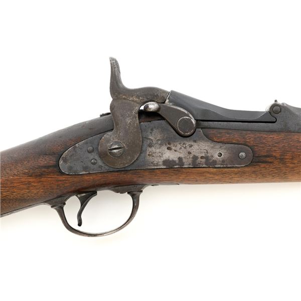 Springfield Armory Model 1884 Trapdoor Carbine, #340571, .45-70 cal., 22" barrel blue and case hardened finish, walnut stock, blade front sight, and Model 1884 adjustable "U"-notched rear sight. Included is a leather R.I.A. saddle scabbard. Receiver has the serial number and the breech block is marked "U.S./MODEL/1873", with a bronze firing pin. Lockplate is faintly marked "(eagle)/ U.S. /SPRINGFIELD/1873". Barrel is marked "VP/(eagle)/P" with an "R" on top. Condition is good overall. Metal shows overall wear and patina, heavier on the lockplate, and the barrel appears to have been reblued, with scattered pinprick rust spots. Stock has a faint circled "P" behind the trigger plate and shows heavy overall use with cracks behind and in front of the lockplate. Action functions properly. Bore is very good with clearly defined rifling. Scabbard is for a M1899 KRAG carbine and marked "ROCKISLAND/ARSENAL/1904/H.E.K." with "F/11 CAV/37" on the opposite side. Includes one original strap. Scabbard shows heavy use and scratches with stitching opened at the bottom and a 4.5" x 1.5" leather patch repair. Est.: $700-$900. (Antique)