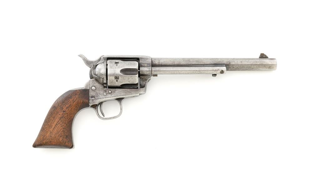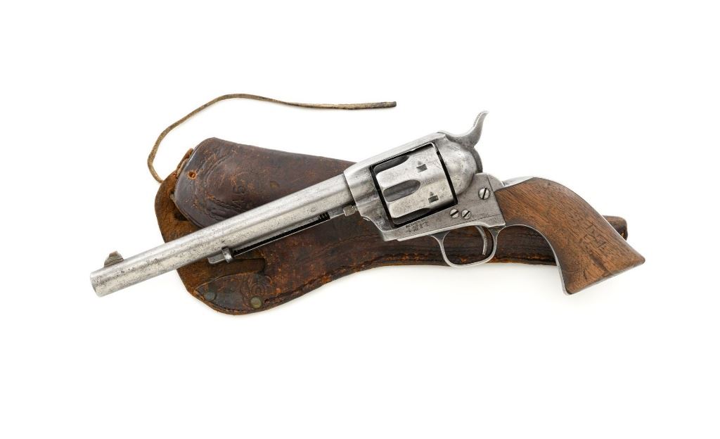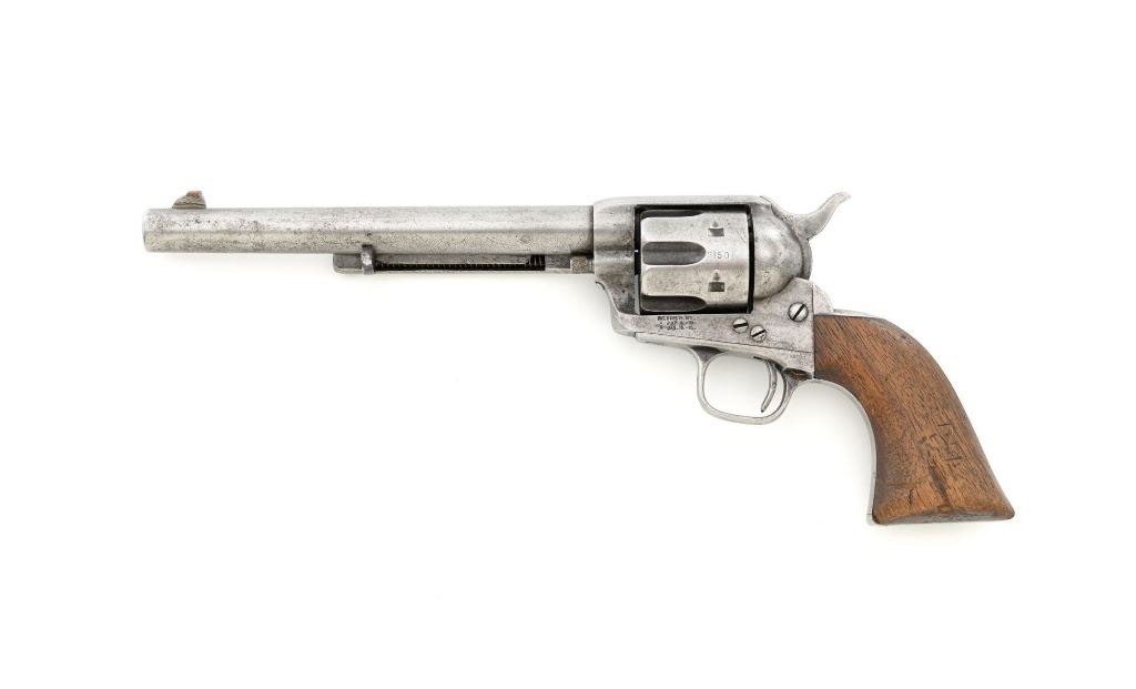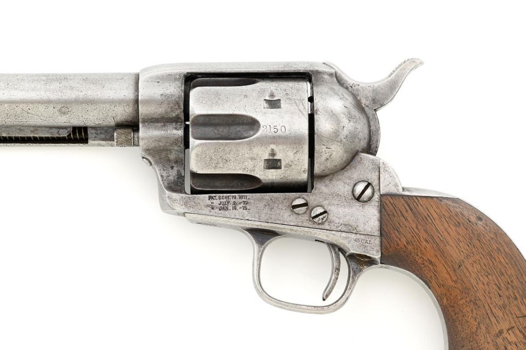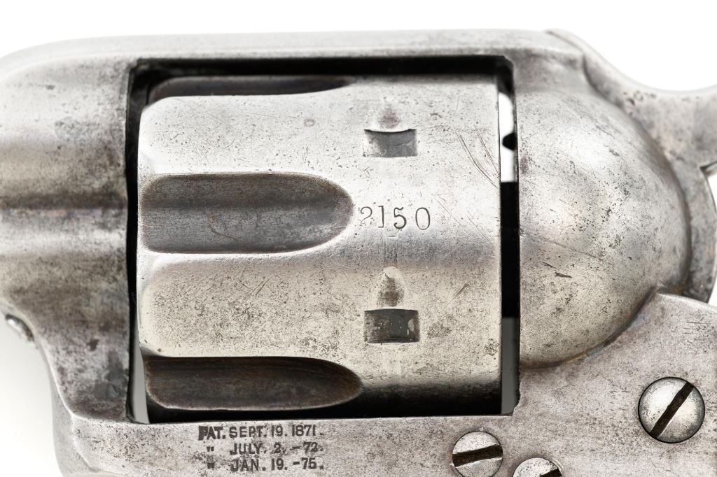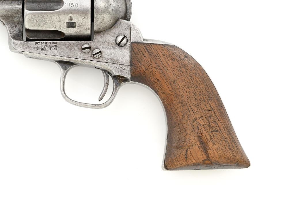 Antique Colt 1st Generation Single Action Army Revolver, #32150, .45 LC cal., 7.5" barrel, black powder frame, gray patina, smooth walnut grips, blade front sight with brass insert, and fixed "V"-notch rear sight. Cylinder pin is an old replacement. Top of the barrel is marked "COLTS PT. F.A. MFG. CO. HARTFORD, CT. U.S.A.". Left side of the frame is marked with patent dates in three-lines. ".45" stamped on left side of the trigger guard. Visible matching numbers, including the cylinder. Mfgd 1876. Includes an old leather holster, marked "45" at the top right side, with decorative tooled borders, and appearing to have been with this revolver for a long time. In fair used condition, showing general age and wear, stitching with an old repair near the tip. Revolver is good condition, displaying an even gray patina to the metal surfaces, with general light pitting and some scattered spots of light erosion. Grips are generally good, but have an old, larger mar to the bottom left side grip panel. Markings are legible. Action is crisp, but the locking bolt is not releasing at half cock, preventing the cylinder from turning freely. Bore with mild etching and very good rifling. Est.: $1,800-$2,400. (Antique)