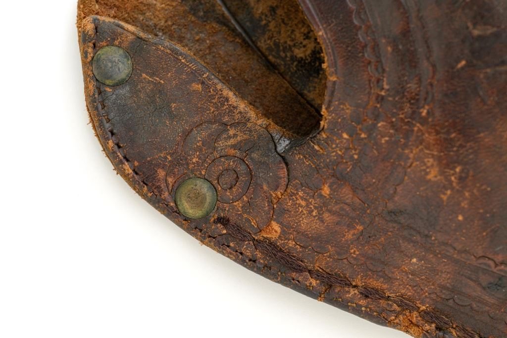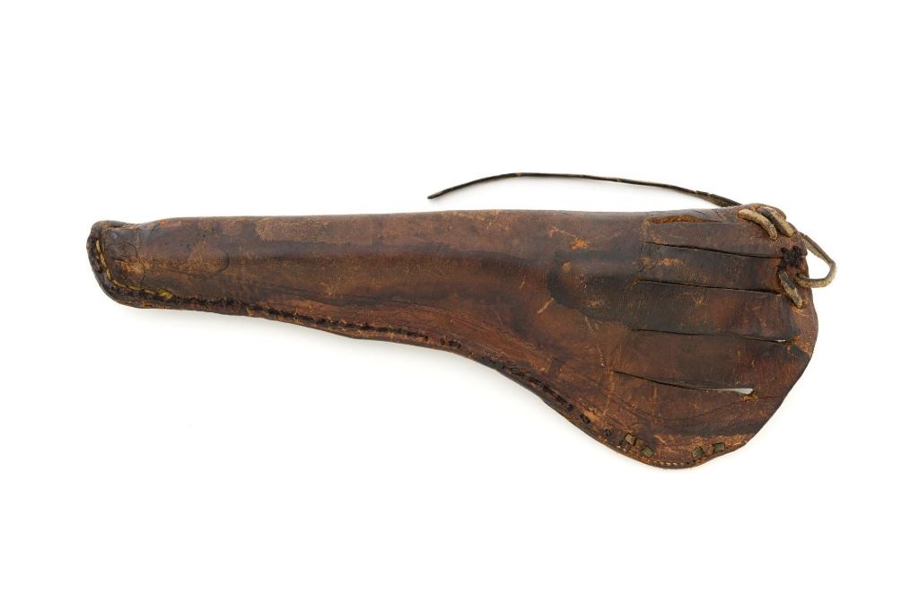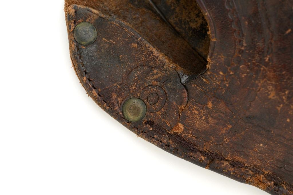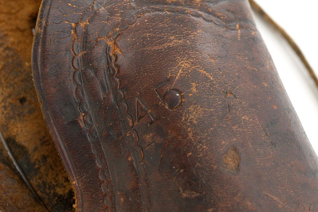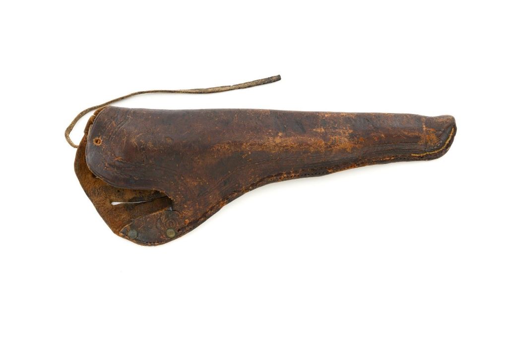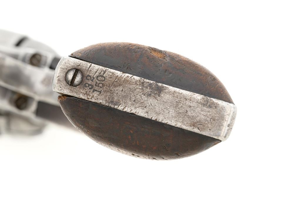 Antique Colt 1st Generation Single Action Army Revolver, #32150, .45 LC cal., 7.5" barrel, black powder frame, gray patina, smooth walnut grips, blade front sight with brass insert, and fixed "V"-notch rear sight. Cylinder pin is an old replacement. Top of the barrel is marked "COLTS PT. F.A. MFG. CO. HARTFORD, CT. U.S.A.". Left side of the frame is marked with patent dates in three-lines. ".45" stamped on left side of the trigger guard. Visible matching numbers, including the cylinder. Mfgd 1876. Includes an old leather holster, marked "45" at the top right side, with decorative tooled borders, and appearing to have been with this revolver for a long time. In fair used condition, showing general age and wear, stitching with an old repair near the tip. Revolver is good condition, displaying an even gray patina to the metal surfaces, with general light pitting and some scattered spots of light erosion. Grips are generally good, but have an old, larger mar to the bottom left side grip panel. Markings are legible. Action is crisp, but the locking bolt is not releasing at half cock, preventing the cylinder from turning freely. Bore with mild etching and very good rifling. Est.: $1,800-$2,400. (Antique)