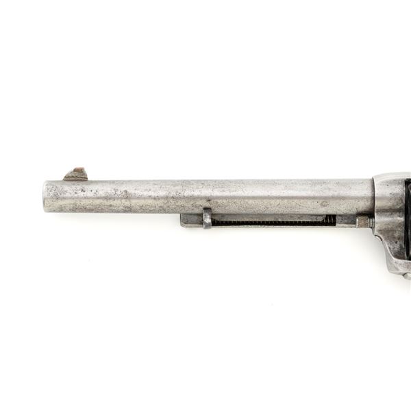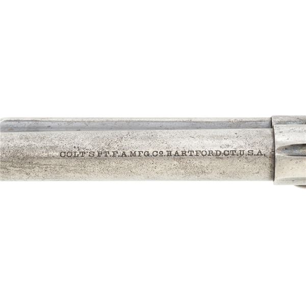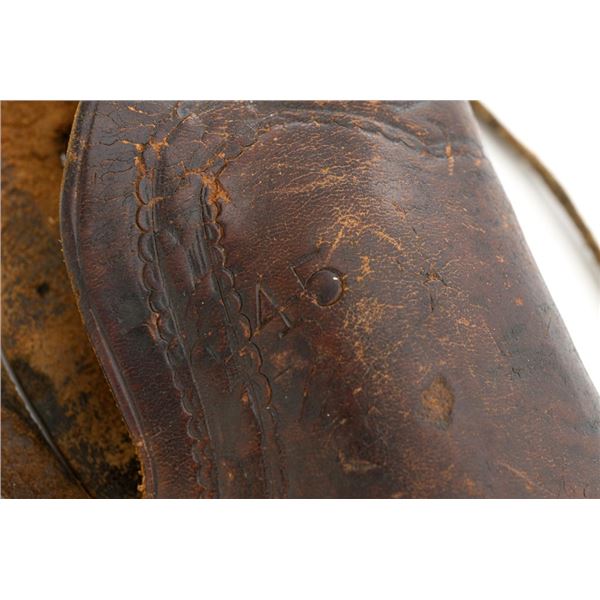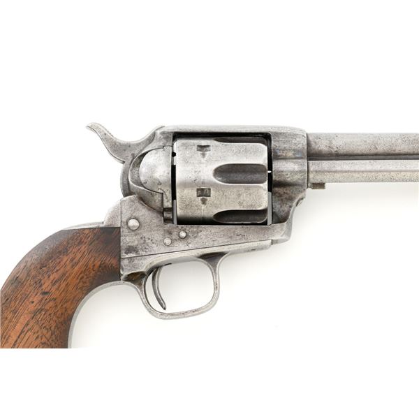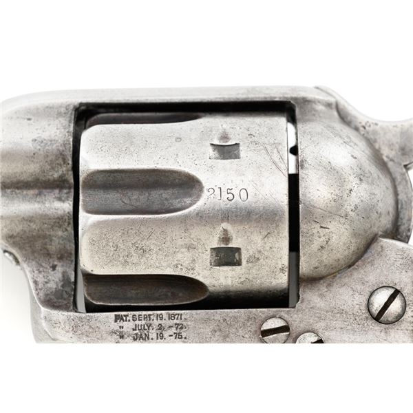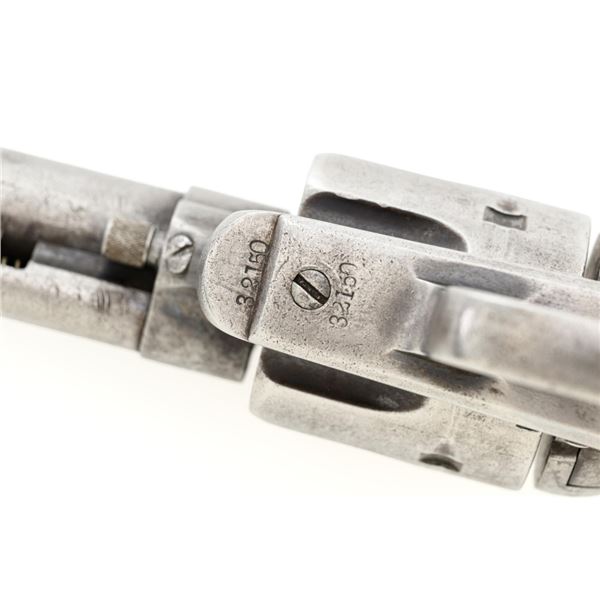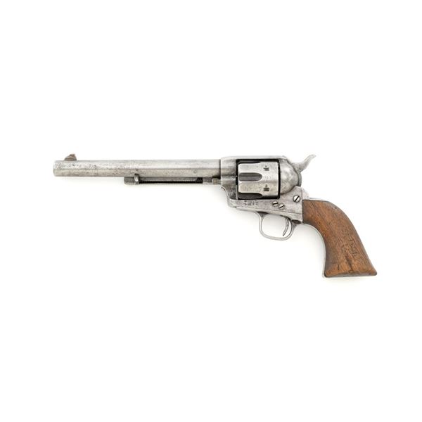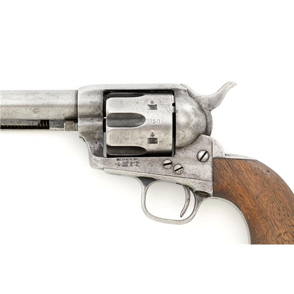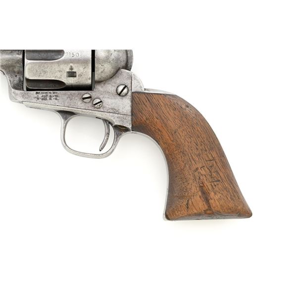 Antique Colt 1st Generation Single Action Army Revolver, #32150, .45 LC cal., 7.5" barrel, black powder frame, gray patina, smooth walnut grips, blade front sight with brass insert, and fixed "V"-notch rear sight. Cylinder pin is an old replacement. Top of the barrel is marked "COLTS PT. F.A. MFG. CO. HARTFORD, CT. U.S.A.". Left side of the frame is marked with patent dates in three-lines. ".45" stamped on left side of the trigger guard. Visible matching numbers, including the cylinder. Mfgd 1876. Includes an old leather holster, marked "45" at the top right side, with decorative tooled borders, and appearing to have been with this revolver for a long time. In fair used condition, showing general age and wear, stitching with an old repair near the tip. Revolver is good condition, displaying an even gray patina to the metal surfaces, with general light pitting and some scattered spots of light erosion. Grips are generally good, but have an old, larger mar to the bottom left side grip panel. Markings are legible. Action is crisp, but the locking bolt is not releasing at half cock, preventing the cylinder from turning freely. Bore with mild etching and very good rifling. Est.: $1,800-$2,400. (Antique)