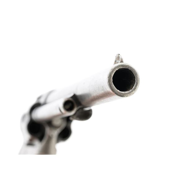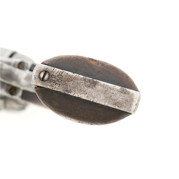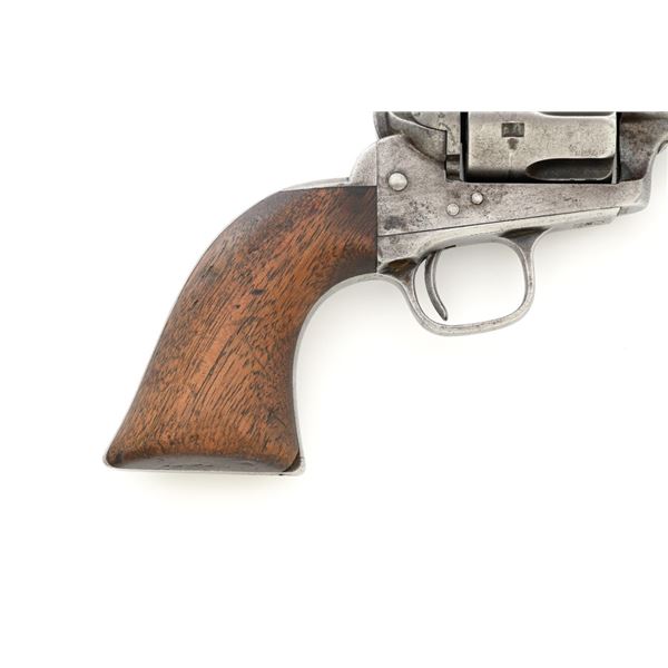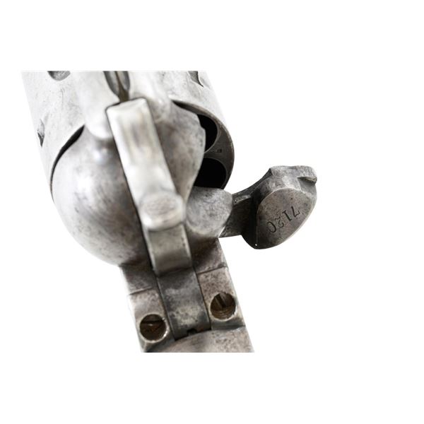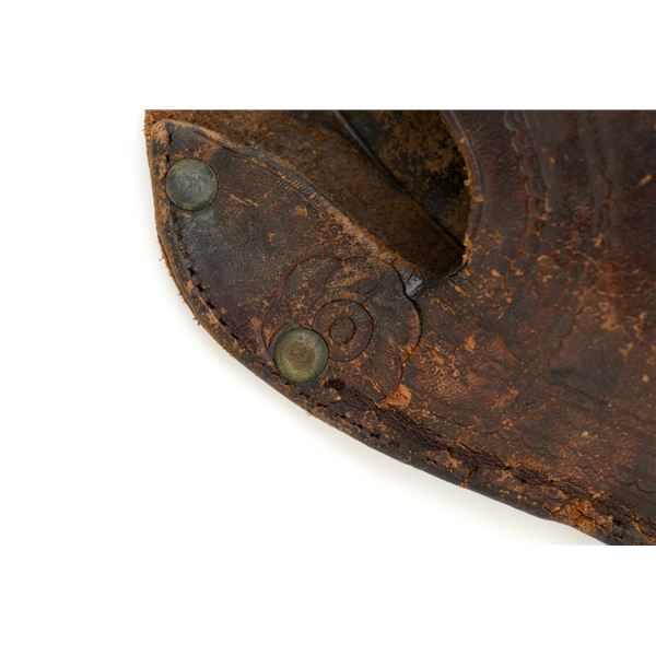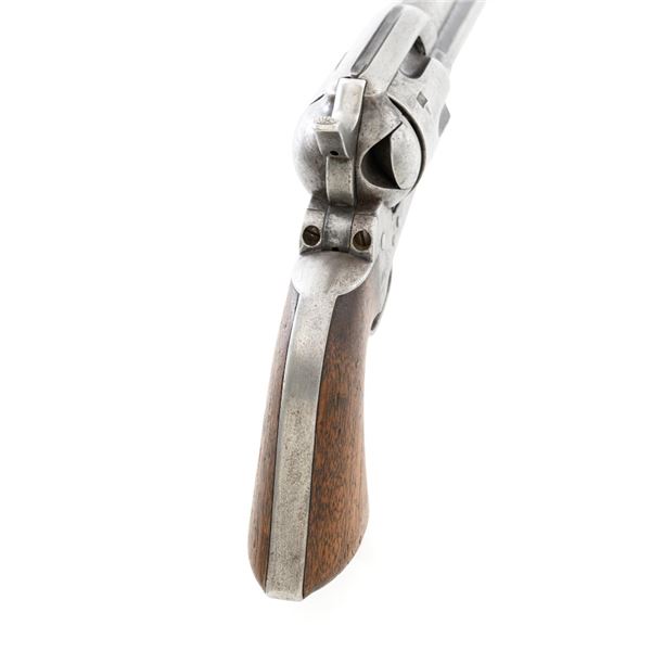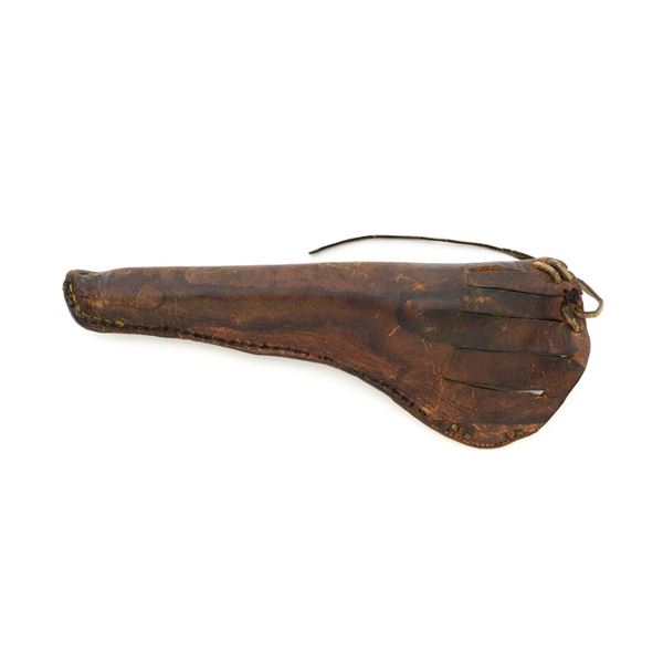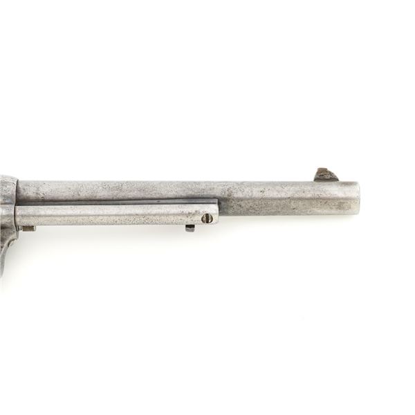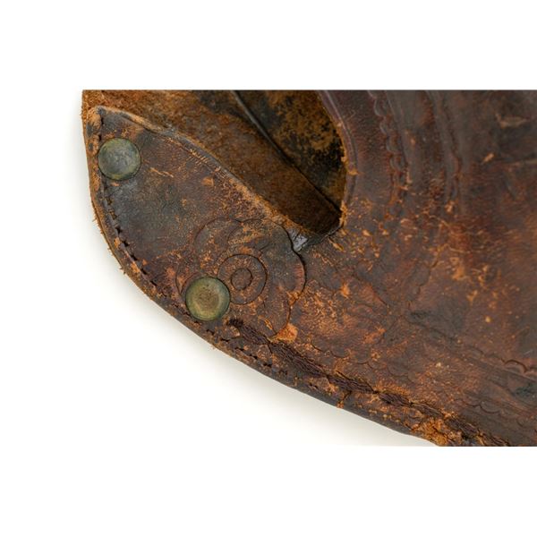 Antique Colt 1st Generation Single Action Army Revolver, #32150, .45 LC cal., 7.5" barrel, black powder frame, gray patina, smooth walnut grips, blade front sight with brass insert, and fixed "V"-notch rear sight. Cylinder pin is an old replacement. Top of the barrel is marked "COLTS PT. F.A. MFG. CO. HARTFORD, CT. U.S.A.". Left side of the frame is marked with patent dates in three-lines. ".45" stamped on left side of the trigger guard. Visible matching numbers, including the cylinder. Mfgd 1876. Includes an old leather holster, marked "45" at the top right side, with decorative tooled borders, and appearing to have been with this revolver for a long time. In fair used condition, showing general age and wear, stitching with an old repair near the tip. Revolver is good condition, displaying an even gray patina to the metal surfaces, with general light pitting and some scattered spots of light erosion. Grips are generally good, but have an old, larger mar to the bottom left side grip panel. Markings are legible. Action is crisp, but the locking bolt is not releasing at half cock, preventing the cylinder from turning freely. Bore with mild etching and very good rifling. Est.: $1,800-$2,400. (Antique)