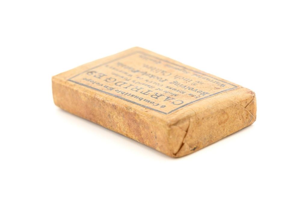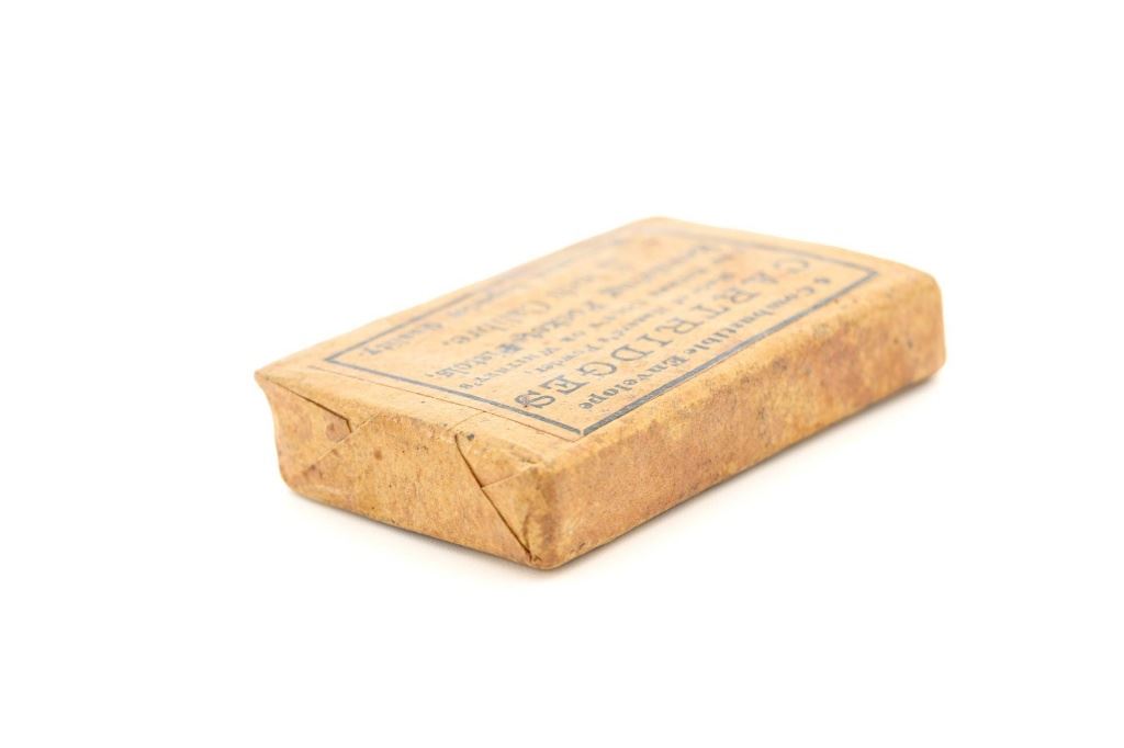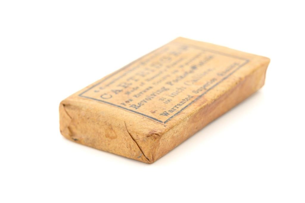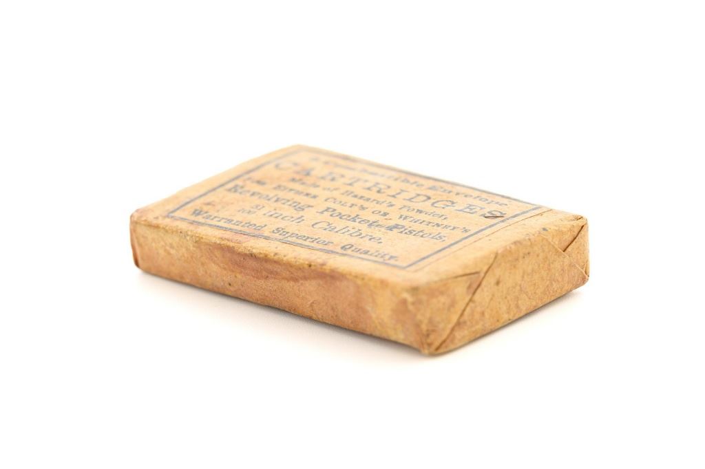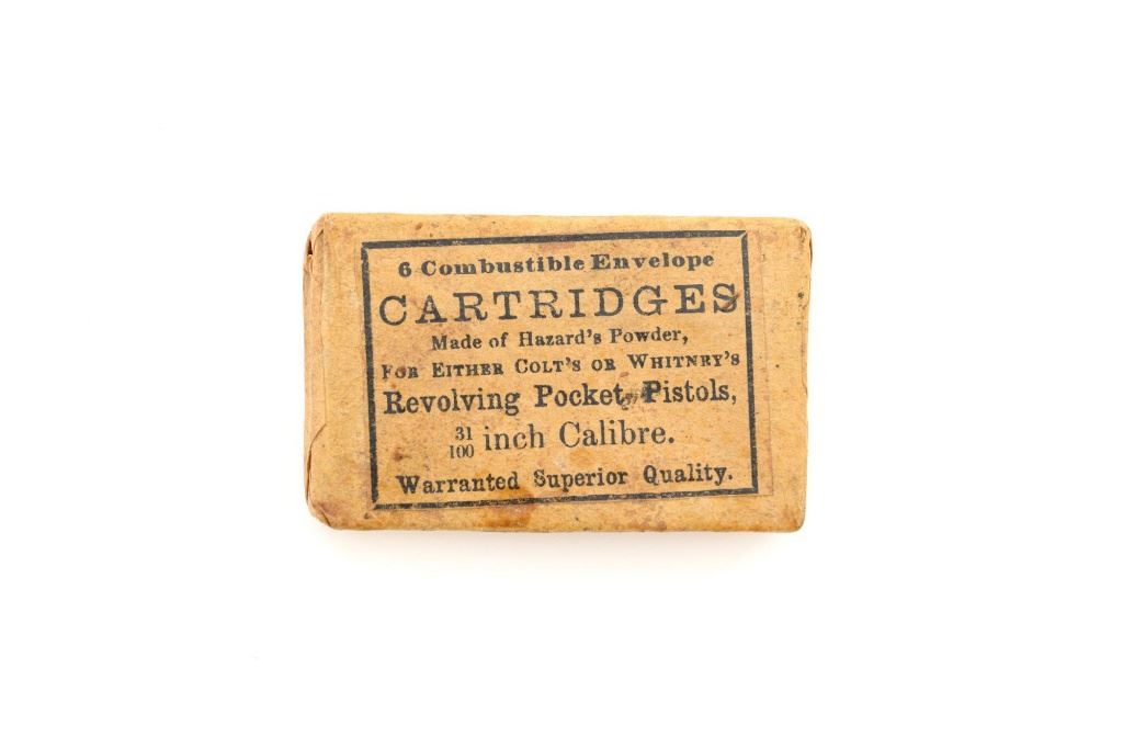 Unopened Packet of .31 Caliber Combustible Envelope Cartridges: Printed black ink label reads "6 Combustible Envelope / CARTRIDGES / Made of Hazards Powder, / FOR EITHER COLTS OR WHITNEYS / Revolving Pocket Pistols, / 31/100 inch Calibre. / Warranted Superior Quality". In fine condition, displaying some typical light soiling associated with age. Label is clearly marked. A little powder can be heard shifting around inside the package. Est.: $250-$350.