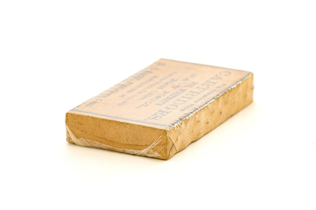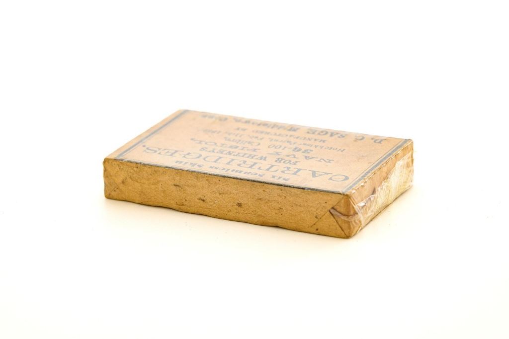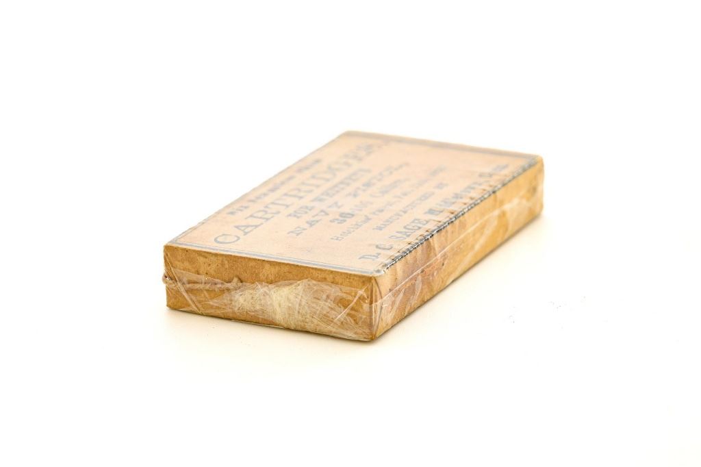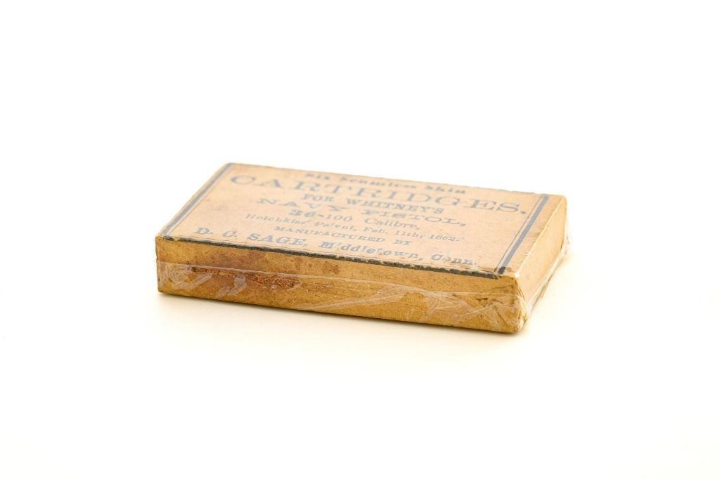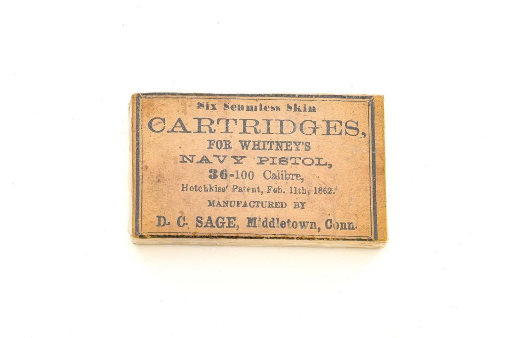 Unopened Packet of .36 Caliber Skin Cartridges: Marked "Six Seamless Skin / CARTRIDGES, / FOR WHITNEYS / NAVY PISTOL, / 36-100 Calibre, / Hotchkiss Patent, Feb. 11th, 1862. / MANUFACTURED BY / D. C. SAGE, Middletown, Conn." In fine condition with intact string-pull. Label is clear. Paper has a spot of moderate deterioration and staining along the bottom edge. Package is neatly sealed in protective wrapping. Reference: "Percussion Ammunition Packets" by Malloy, Thomas, & White, pg. 39, #152. Est.: $300-$400.