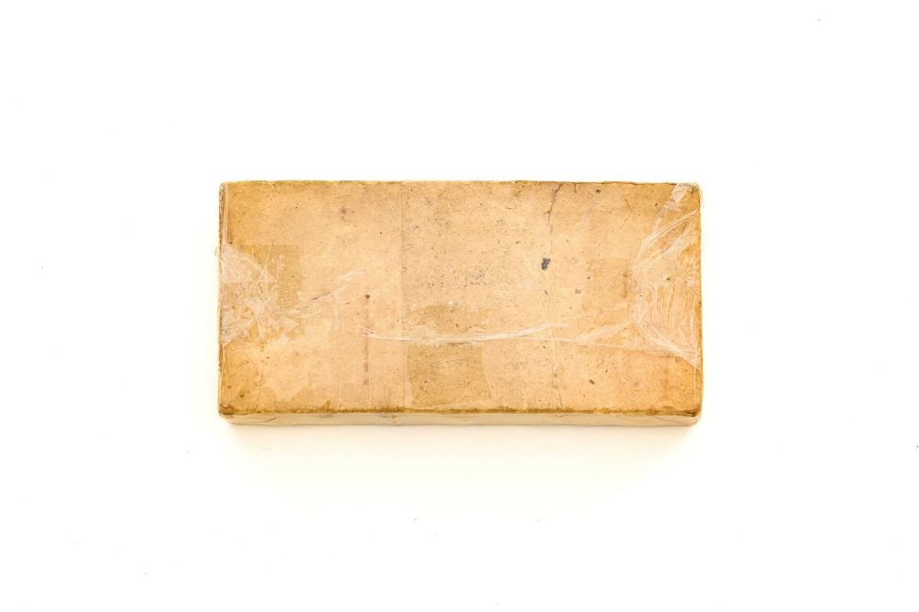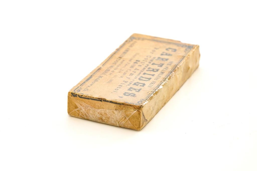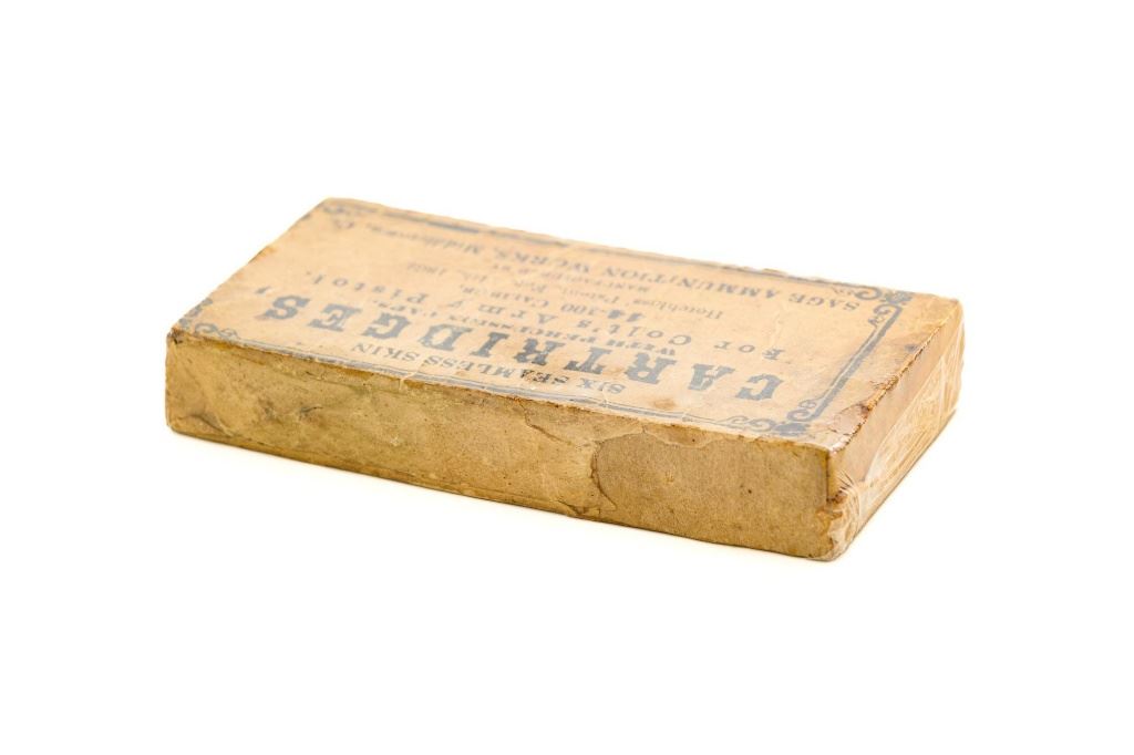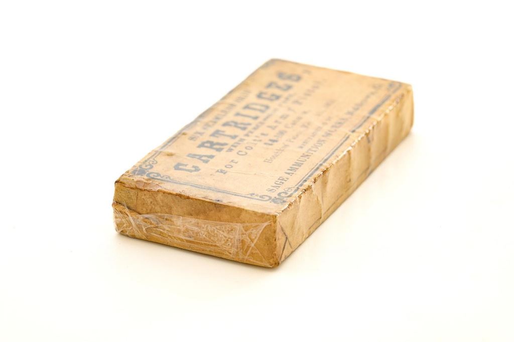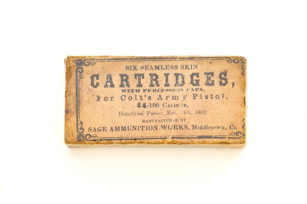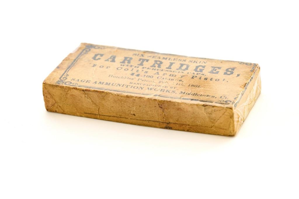 Unopened Packet of .44 Caliber Skin Cartridges: Marked "SIX SEAMLESS SKIN / CARTRIDGES, / WITH PERCUSSION CAPS, / For Colts Army Pistol, / 44-100 Caliber, / Hotchkiss` Patent, Feb. 11th, 1862. / MANUFATURED BY / SAGE AMMUNITION WORKS, Middletown, Ct." In fine condition, with complete paper wrapping, and intact string-pull. Paper shows some expected light discoloration and a few minor spots of darker staining along the bottom edge. Package is neatly sealed in protective wrapping. Reference: "Percussion Ammunition Packets" by Malloy, Thomas, & White, pg. 44, #178. Est.: $400-$500.