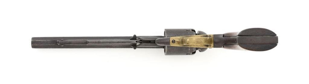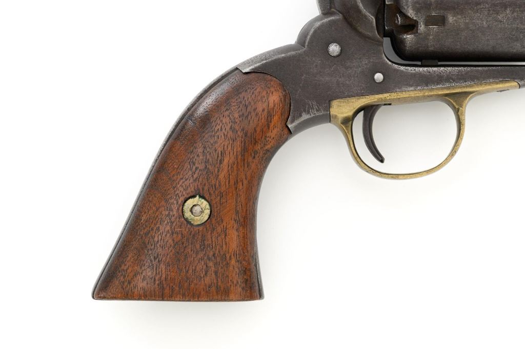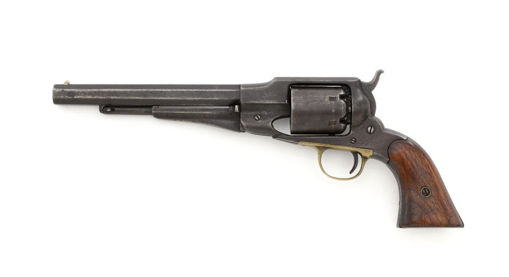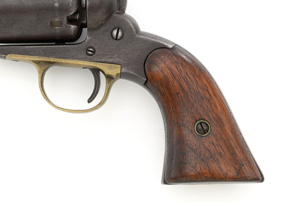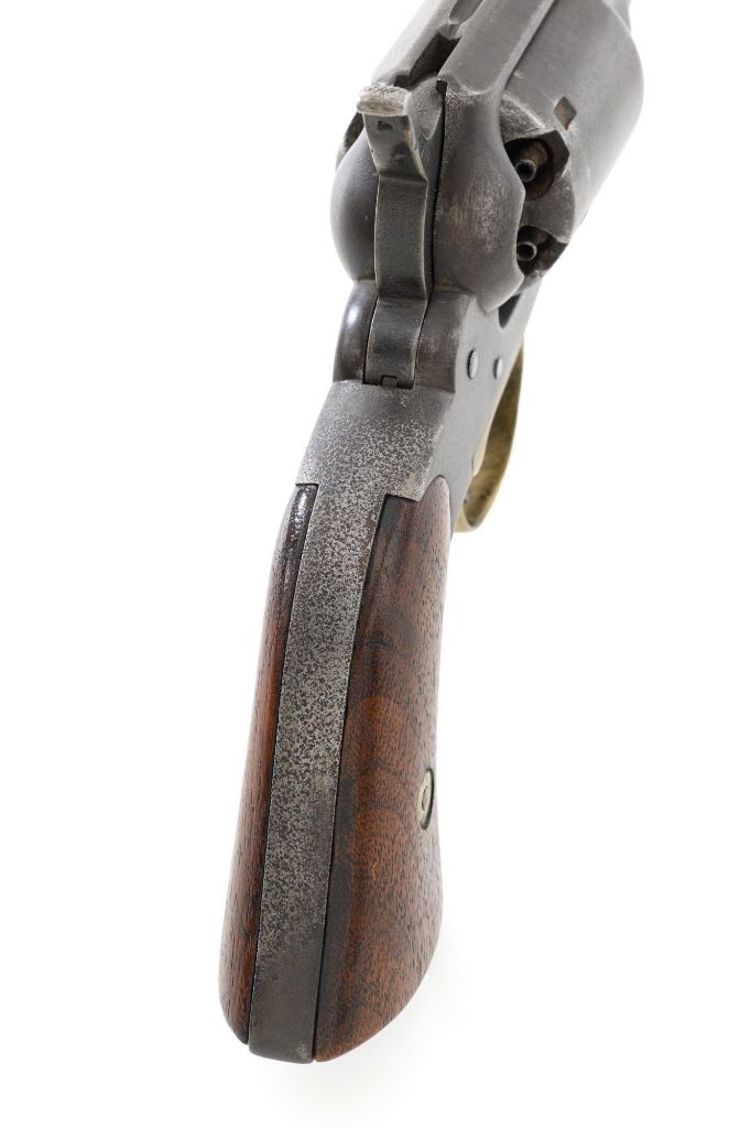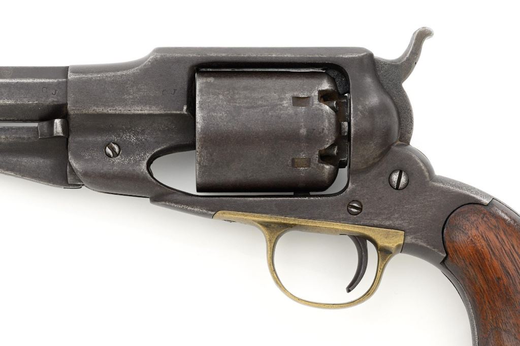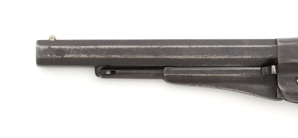 Remington 1861 Army "Old Model Army" Single Action Percussion Revolver, #2261, .44 cal., 8" octagon barrel, blue finish, brass trigger guard, smooth walnut two-piece grips, silver cone front sight, and fixed V-notched rear sight. Top of the barrel is marked in two-lines "PATENTED DEC. 17, 1861/MANUFACTURED BY REMINGTONS ILION, N.Y." Matching visible numbers on left side of the grip frame, underside of barrel, and back of the cylinder. Rear round of the cylinder is stamped with inspector mark "J J". There are also two "C J" inspection marks stamped on the left flat of the frame and left rear flat of the barrel assembly. Approx. 6,000 were manufactured circa 1862. The overall condition of this revolver is good, with a mostly even brown patina to the metal, with some old pinprick pitting confined primarily to the hammer, grip straps, and lower front end of the frame. Factory markings and inspectors marks are clear. Grips rate fine, with pleasing grain patterns, and scattered light handling marks. Action is crisp and cycles smoothly. Bore is good, with clear rifling, and moderate erosion scattered throughout. Est.: $1,000-$1,500. (Antique) (Michael Strietbeck Collection)