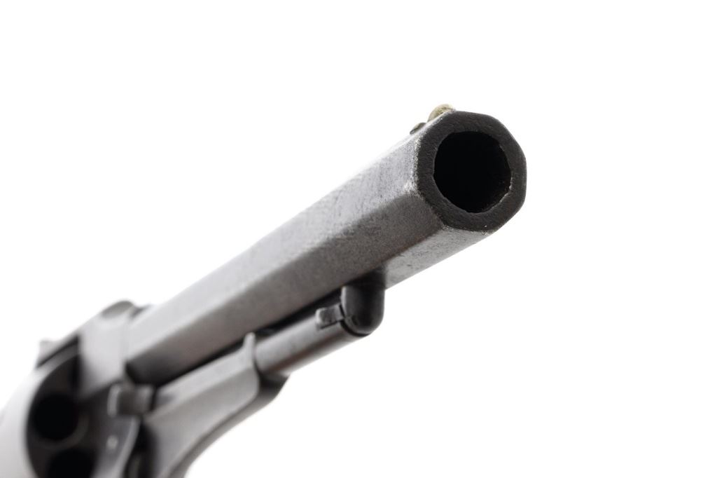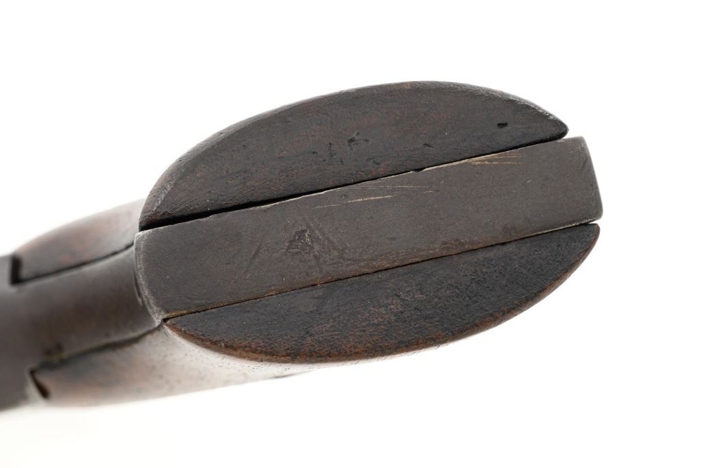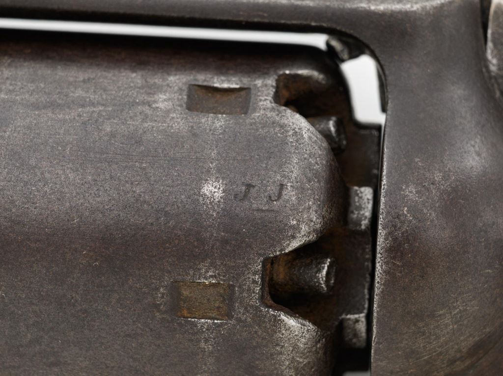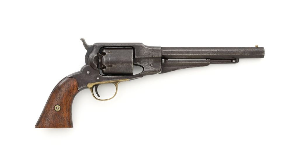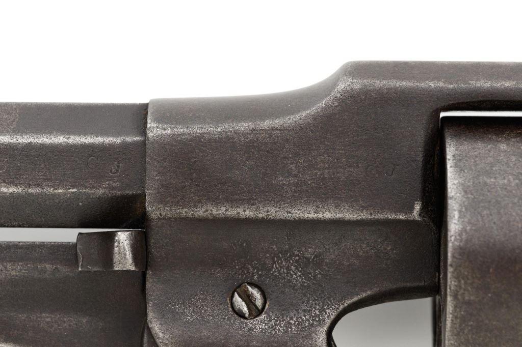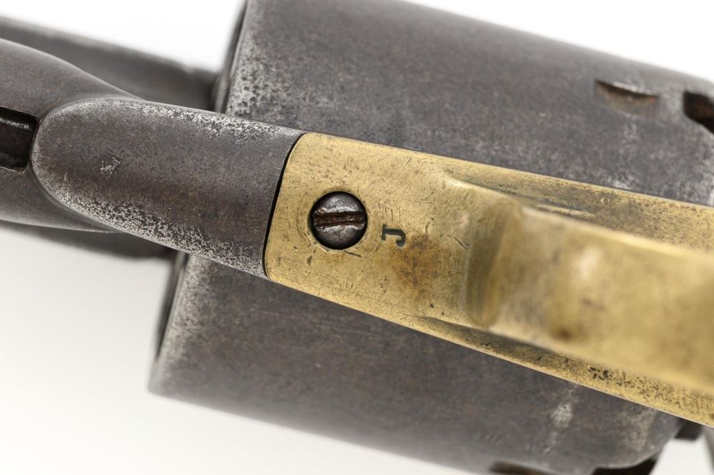 Remington 1861 Army "Old Model Army" Single Action Percussion Revolver, #2261, .44 cal., 8" octagon barrel, blue finish, brass trigger guard, smooth walnut two-piece grips, silver cone front sight, and fixed V-notched rear sight. Top of the barrel is marked in two-lines "PATENTED DEC. 17, 1861/MANUFACTURED BY REMINGTONS ILION, N.Y." Matching visible numbers on left side of the grip frame, underside of barrel, and back of the cylinder. Rear round of the cylinder is stamped with inspector mark "J J". There are also two "C J" inspection marks stamped on the left flat of the frame and left rear flat of the barrel assembly. Approx. 6,000 were manufactured circa 1862. The overall condition of this revolver is good, with a mostly even brown patina to the metal, with some old pinprick pitting confined primarily to the hammer, grip straps, and lower front end of the frame. Factory markings and inspectors marks are clear. Grips rate fine, with pleasing grain patterns, and scattered light handling marks. Action is crisp and cycles smoothly. Bore is good, with clear rifling, and moderate erosion scattered throughout. Est.: $1,000-$1,500. (Antique) (Michael Strietbeck Collection)