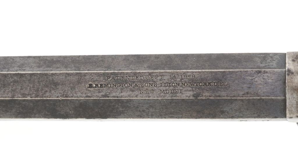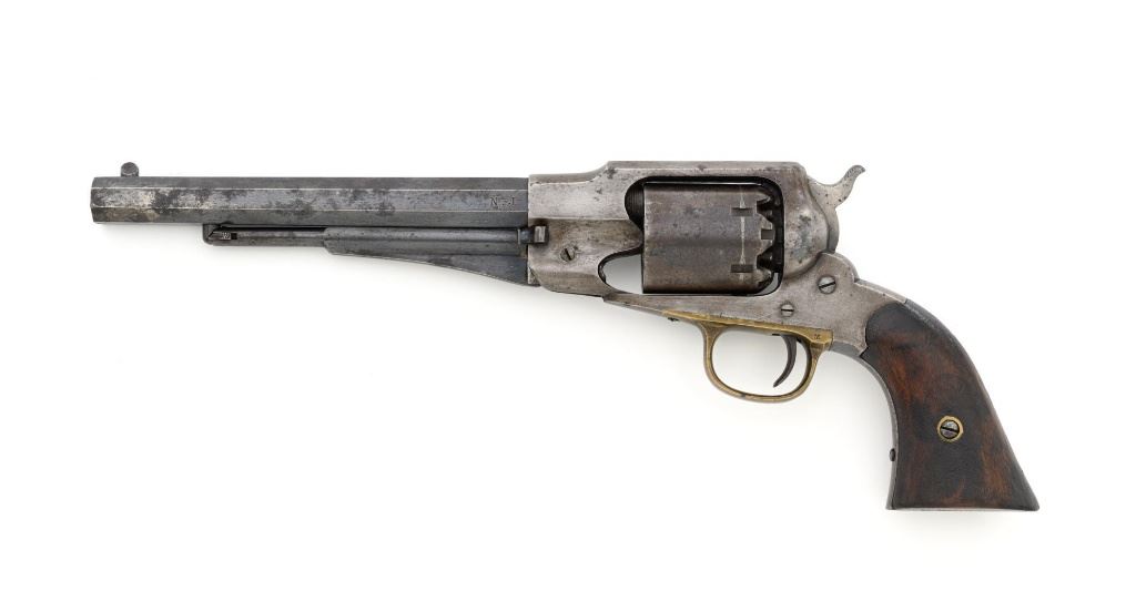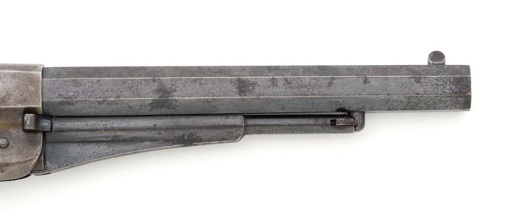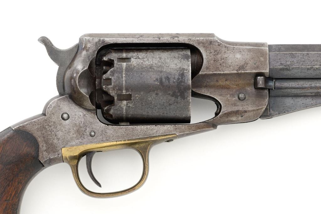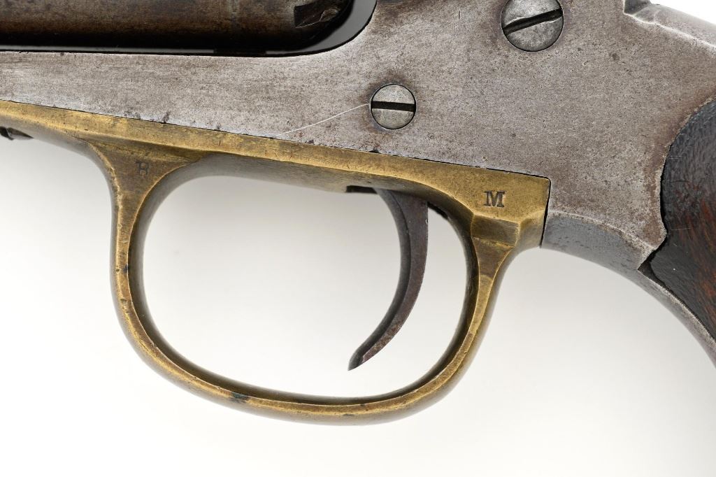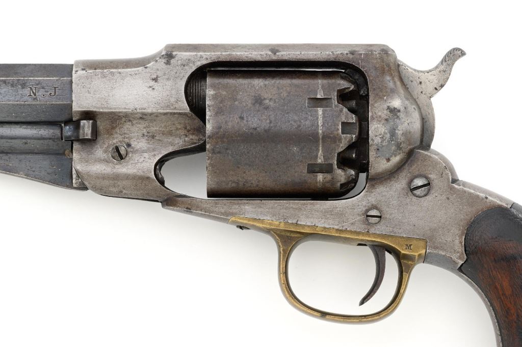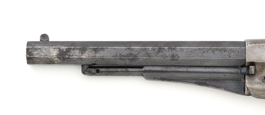 New Jersey Marked Remington New Model Army Single Action Percussion Revolver, #71461, .44 cal., 8" octagon barrel, blue finish, brass trigger guard, smooth walnut two-piece grips, "pinched" blade front sight, and fixed "V"-notch rear sight. Left side of the barrel at the breech is marked "N.J". With several small inspectors proofs scattered throughout. Top of barrel is marked in three-lines "PATENTED SEPT. 14, 1858/E. REMINGTON & SONS, ILION NEW YORK. U.S.A./NEW-MODEL". Matching visible numbers on left side of the grip frame and underside of the barrel. Overall condition of this revolver is very good, retaining a significant amount of thinning and toning blue finish on the barrel and loading lever, which also displays scattered spots of patina and mild erosion. Barrel address and New Jersey markings are clear. Frame and cylinder with a combination gray/brown patina. Brass shows a pleasing uncleaned patina. Grips with scattered moderate impressions, other typical marks associated with age and use. Finish on the left grip shows some darkening and light texture. Action is crisp and cycles smoothly. Bore is fine with clearly defined rifling. One of approx. 1,000 purchased by the State of New Jersey. Est.: $1,500-$1,800. (Antique) (Michael Strietbeck Collection)