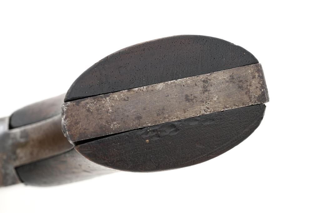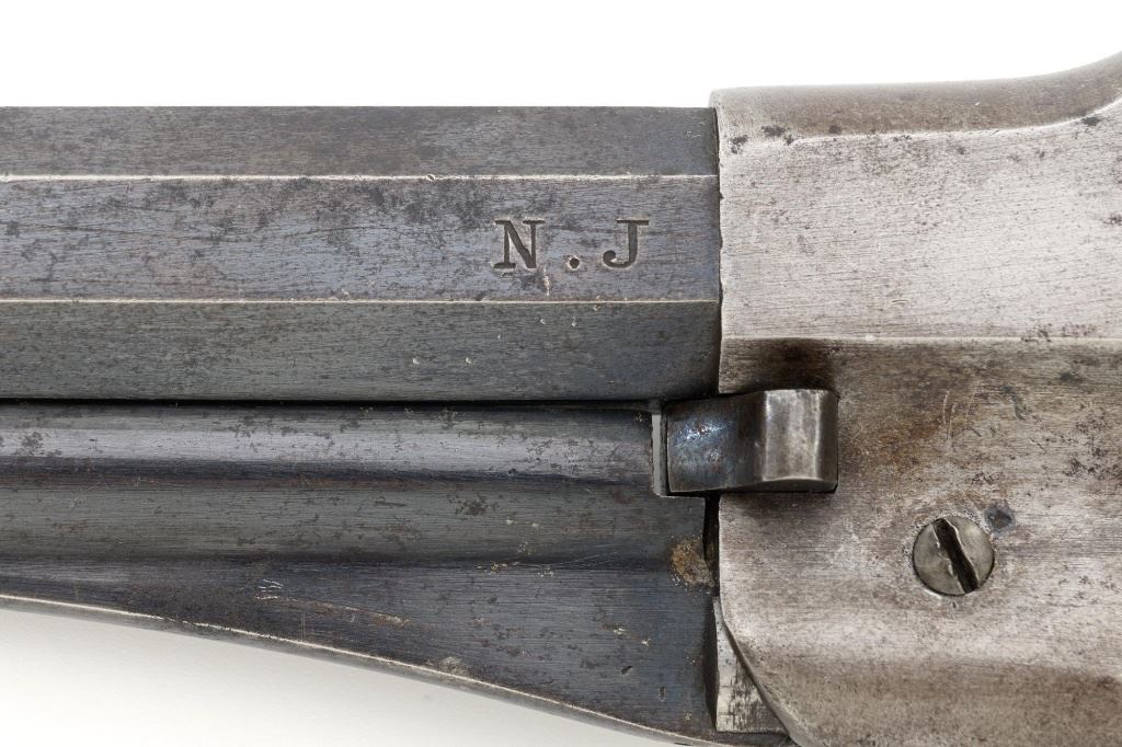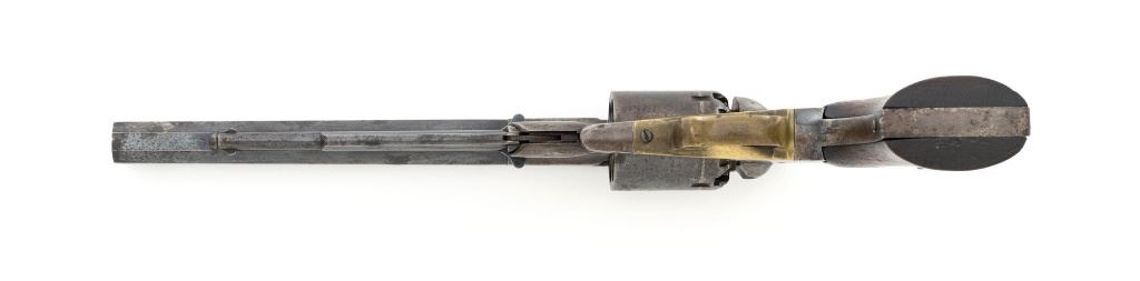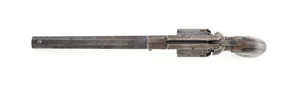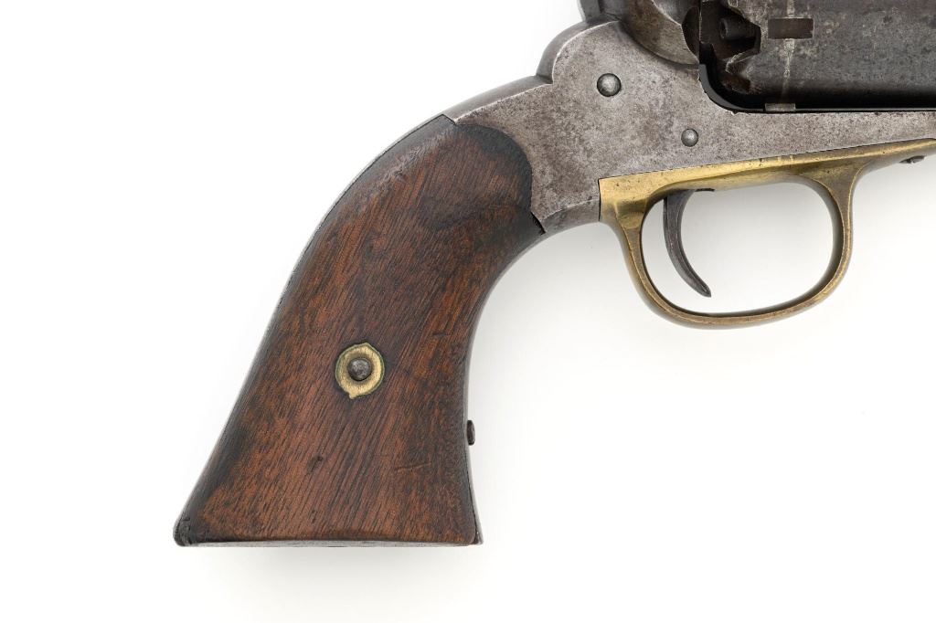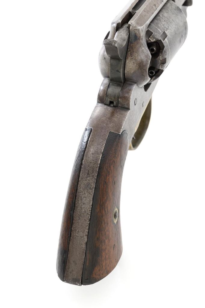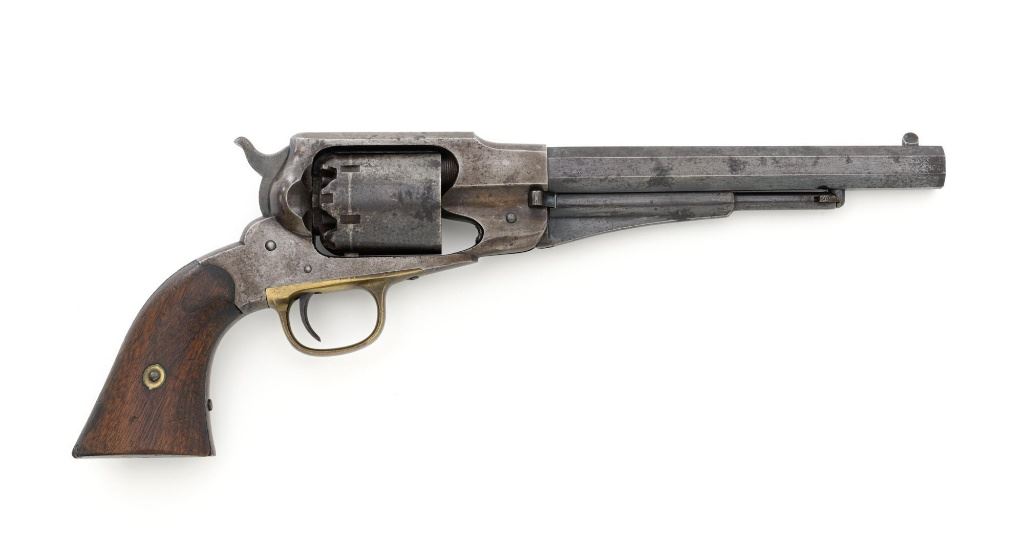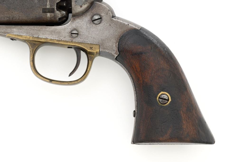 New Jersey Marked Remington New Model Army Single Action Percussion Revolver, #71461, .44 cal., 8" octagon barrel, blue finish, brass trigger guard, smooth walnut two-piece grips, "pinched" blade front sight, and fixed "V"-notch rear sight. Left side of the barrel at the breech is marked "N.J". With several small inspectors proofs scattered throughout. Top of barrel is marked in three-lines "PATENTED SEPT. 14, 1858/E. REMINGTON & SONS, ILION NEW YORK. U.S.A./NEW-MODEL". Matching visible numbers on left side of the grip frame and underside of the barrel. Overall condition of this revolver is very good, retaining a significant amount of thinning and toning blue finish on the barrel and loading lever, which also displays scattered spots of patina and mild erosion. Barrel address and New Jersey markings are clear. Frame and cylinder with a combination gray/brown patina. Brass shows a pleasing uncleaned patina. Grips with scattered moderate impressions, other typical marks associated with age and use. Finish on the left grip shows some darkening and light texture. Action is crisp and cycles smoothly. Bore is fine with clearly defined rifling. One of approx. 1,000 purchased by the State of New Jersey. Est.: $1,500-$1,800. (Antique) (Michael Strietbeck Collection)
