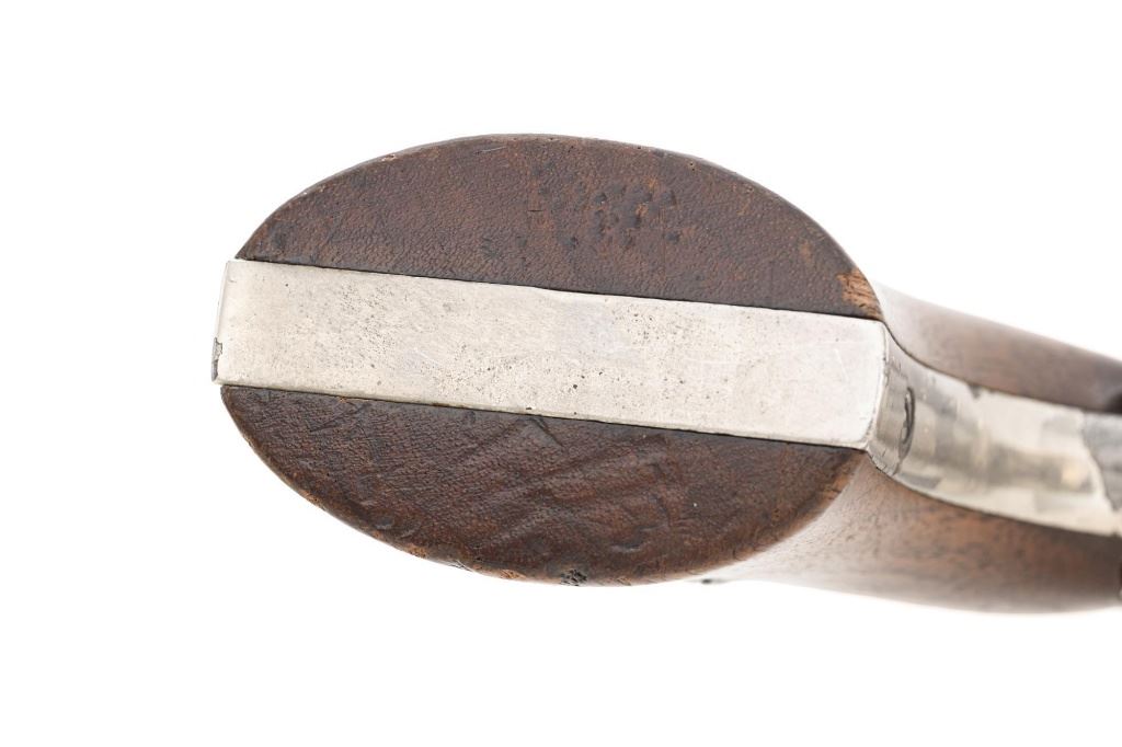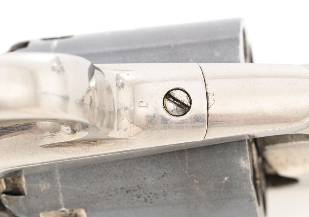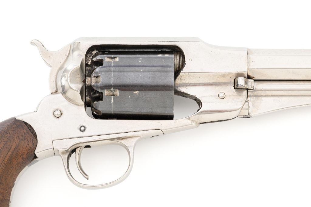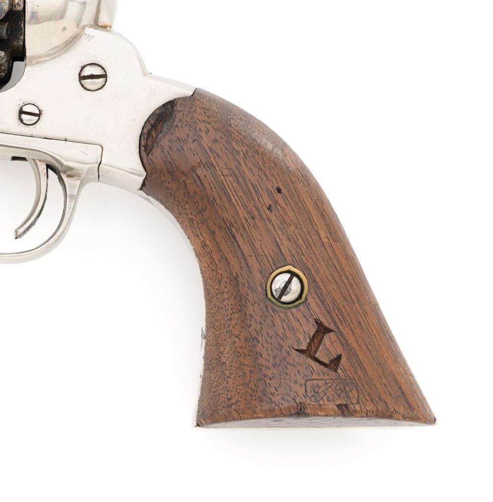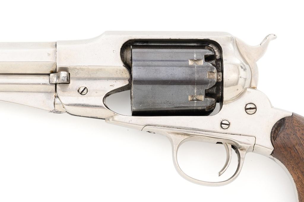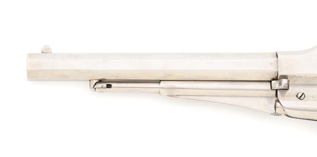 Nickel Plated Remington New Model Army Single Action Percussion Revolver, #115871, .44 cal., 8" octagon barrel, nickel finish with blued cylinder, smooth two-piece walnut grips, standard fixed blade front and notched rear sight. Barrel address reads "PATENTED SEPT. 14, 1858/E. REMINGTON & SONS. ILION, NEW YORK, U.S.A./NEW-MODEL". Matching serial number located on left side of the grip frame, underside of barrel, back of the cylinder, and in pencil on back of the right grip. There is a clear government inspectors cartouche of Giles Porter "GP" on the bottom of the left grip, with a large "L" stamped above that cartouche. Additionally, there are several additional sub-inspection proofs stamped on the gun, including a "W" at the rear frame, "C" on the left top side of the frame, "W" on the left side barrel flat at the breech, "Q" on the underside flat of the barrel near the muzzle, "J" on the front of the trigger guard, "C" on both the right side barrel flat & right side frame, "G" and "C" on back of the cylinder. Factory lettering and inspectors marks are clear. Overall condition is very good, retaining approx. 92% nickel plated finish; thinning and toning blue on the cylinder, mixed with mild frosting. Nickel finish was applied over light pitting and erosion along top of the barrel and frame, with additional pitting visible on the right front of the frame. Walnut grips are very good with nice grain pattern, scattered moderate dents and scratches, particularly along the bottom edge of the left panel. Action is crisp and cycles smoothly. Bore with scattered spots of light erosion, rifling is clearly defined and rates very good overall. Est.: $1,500-$2,000. (Antique) (Michael Strietbeck Collection)