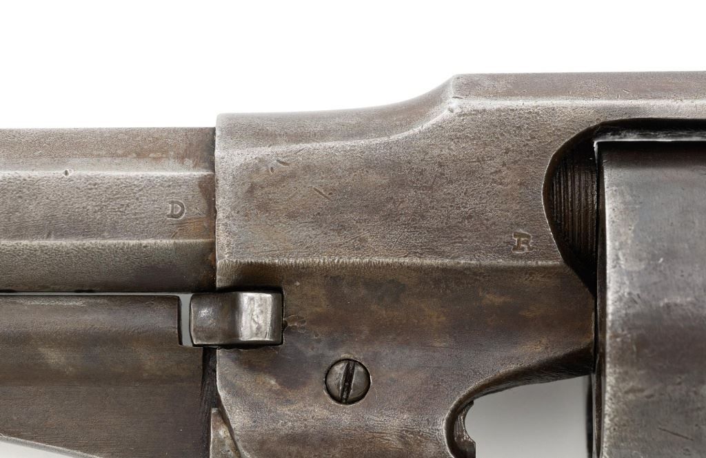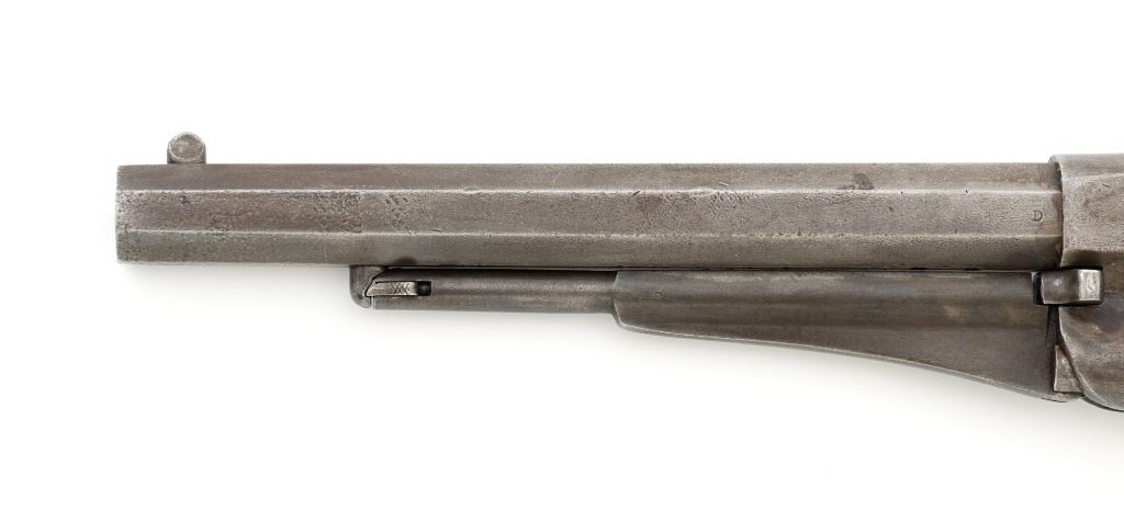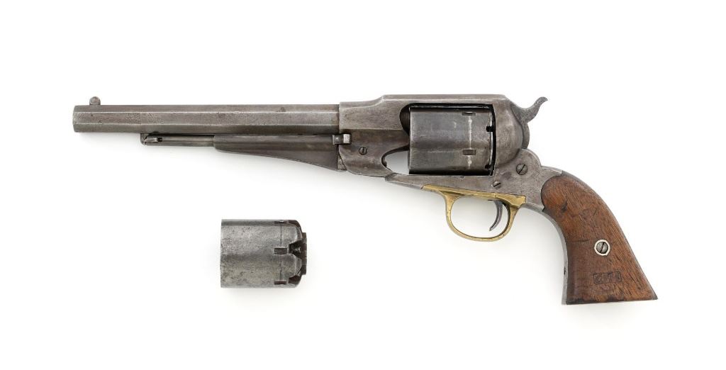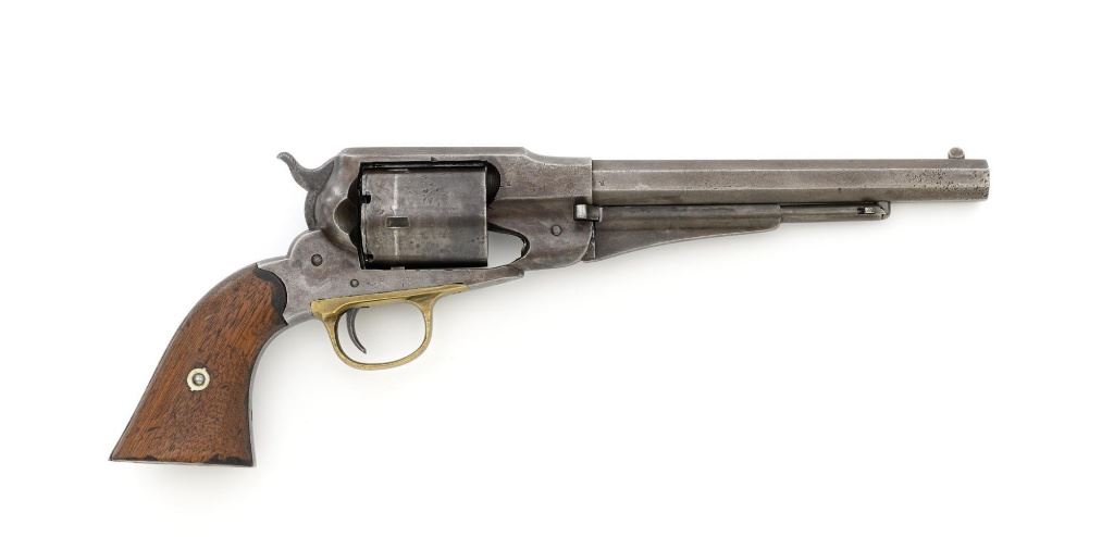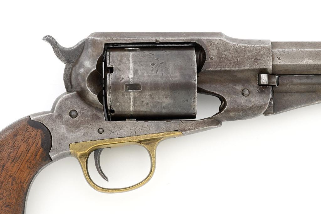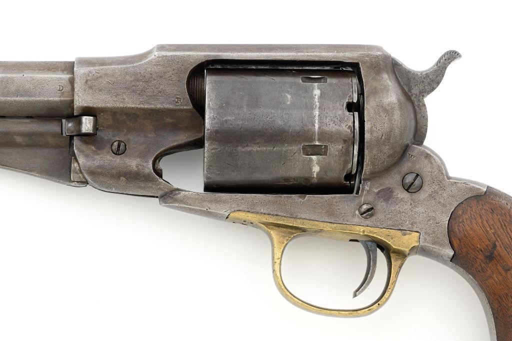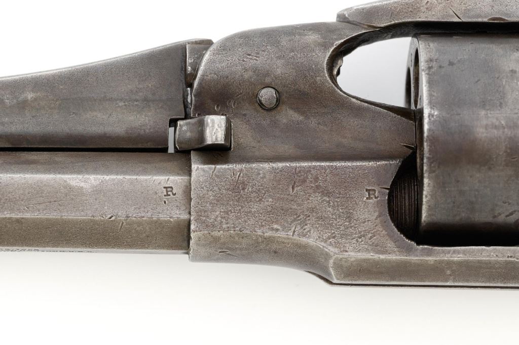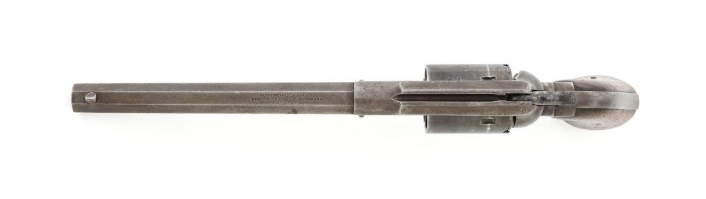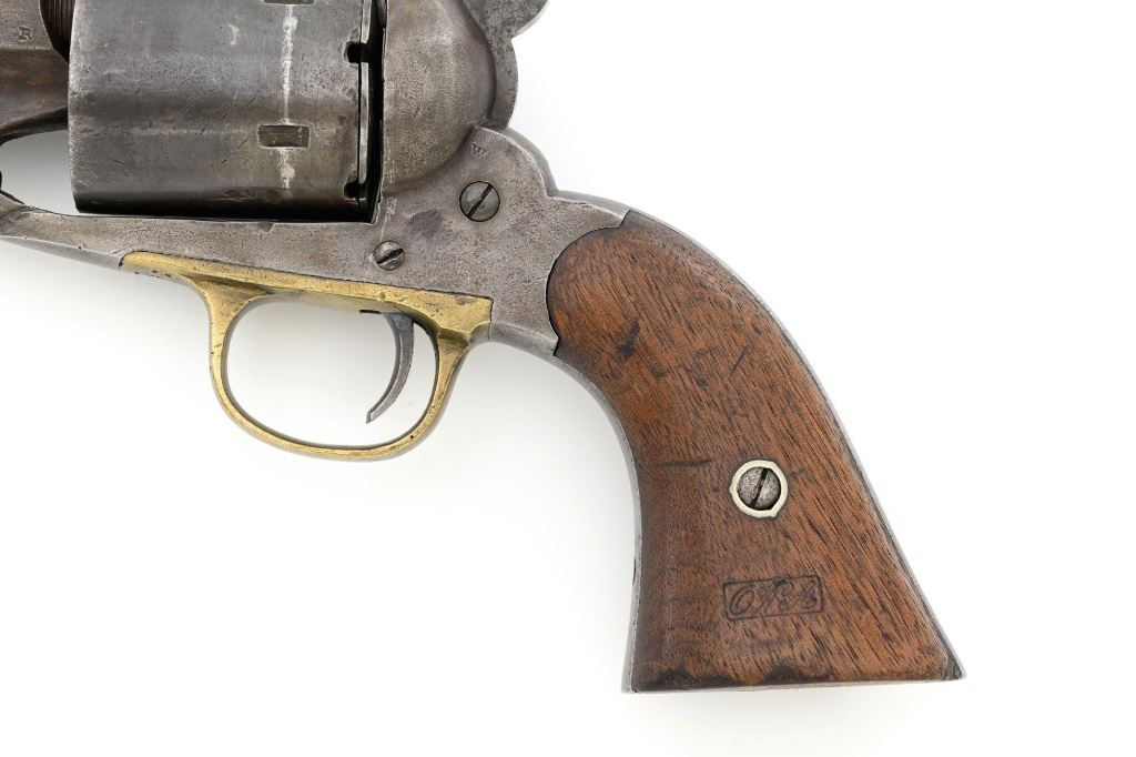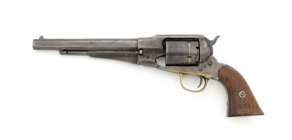 Remington New Model Army Cartridge Conversion 5-Shot Single Action Revolver, with extra percussion cylinder, #98317,.46 RF cal., 8" octagon barrel, gray patina, brass trigger guard, smooth walnut two-piece grips, "pinched" blade front sight, fixed "V"-notch rear sight. Lower left grip panel with "OWA" cartouche. Inspector proofs "W" on rear left frame flat, "R" on left flat of frame at breech, "D" on left rear flat of barrel, "R" on right barrel flat at frame and also on right frame flat. Top of barrel is marked in three-lines "PATENTED SEPT. 14, 1858/E. REMINGTON & SONS, ILION NEW YORK. U.S.A./NEW MODEL". Matching visible numbers on left side of the grip frame, underside of barrel, and cylinder face. Includes a .44 caliber percussion cylinder, numbered "9013". Revolver is in good condition, displaying a pleasing gray and brown patina to the metal surfaces, with traces of blue finish to the cylinder, scattered mild etching, and handling marks. Factory markings are clear. Percussion cylinder is mostly gray with light rust visible around the nipples and in the chambers, with mild pinprick pitting. Grips are good with scattered old mars and scratches, with a few spots of dark oil staining, cartouche is clear. Action is crisp and cycles smoothly. Bore is primarily bright, with some areas of light erosion, rifling is clearly defined and good overall. Est.: $1,200-$1,800. (Antique) (Michael Strietbeck Collection)