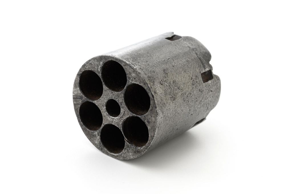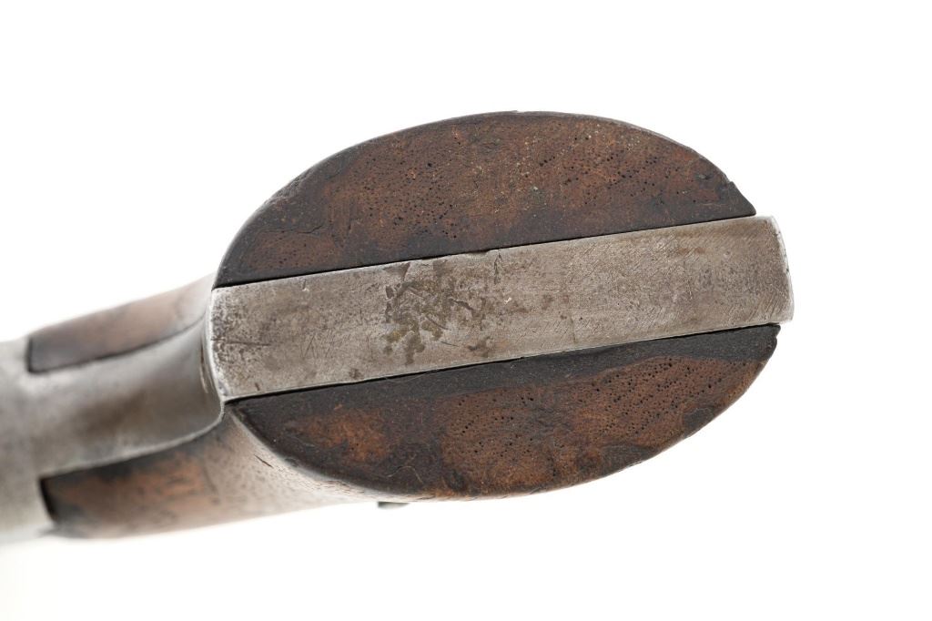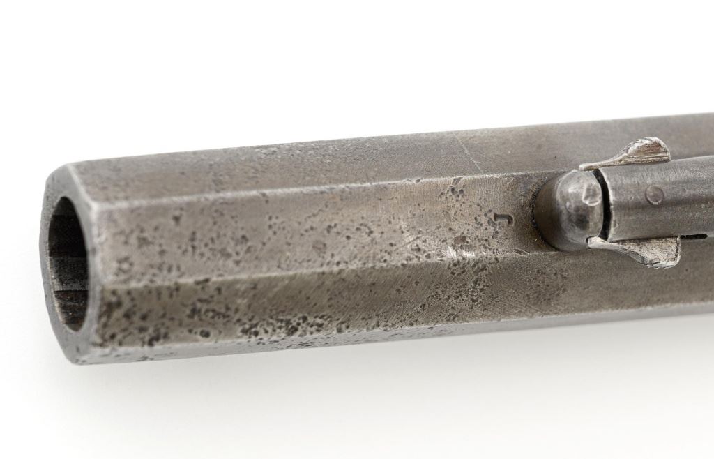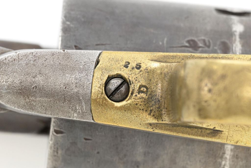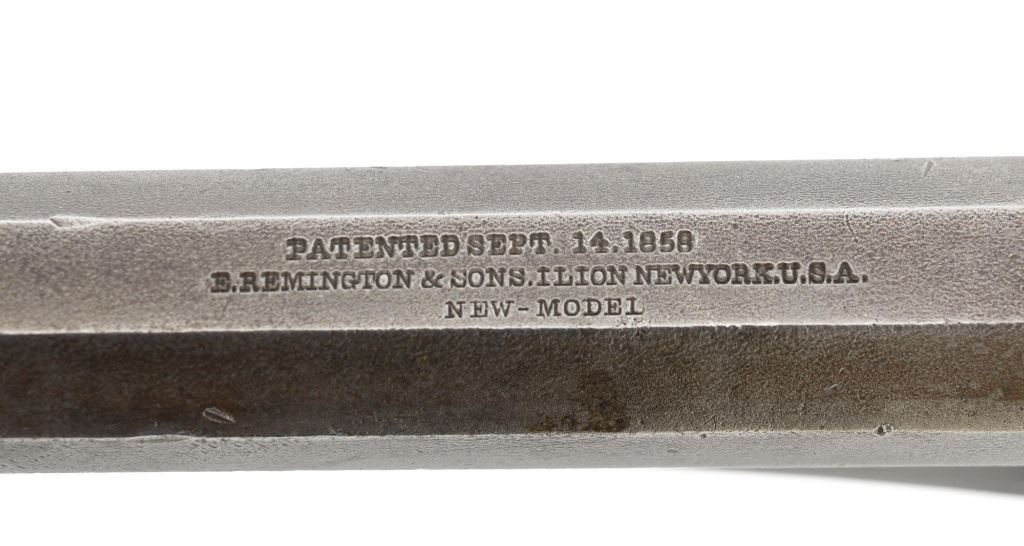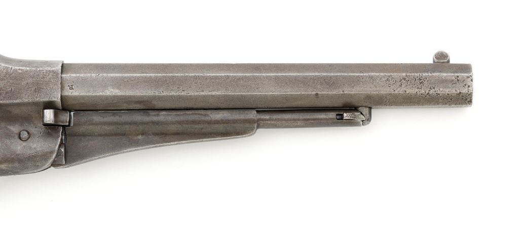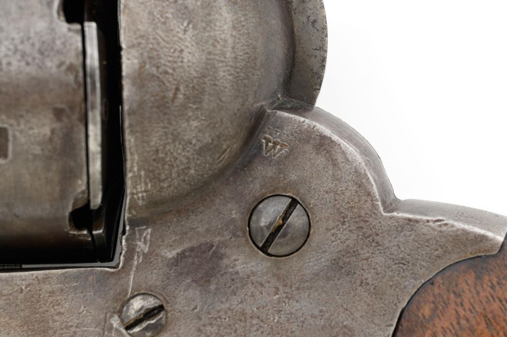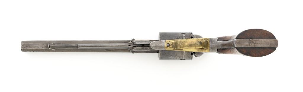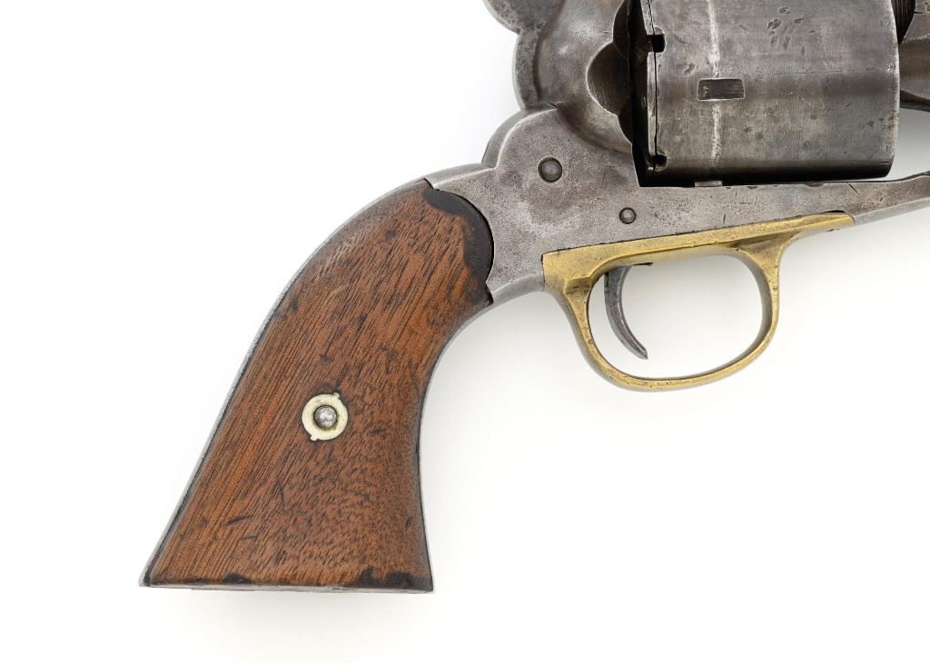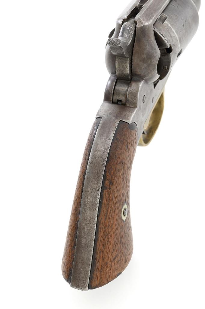 Remington New Model Army Cartridge Conversion 5-Shot Single Action Revolver, with extra percussion cylinder, #98317,.46 RF cal., 8" octagon barrel, gray patina, brass trigger guard, smooth walnut two-piece grips, "pinched" blade front sight, fixed "V"-notch rear sight. Lower left grip panel with "OWA" cartouche. Inspector proofs "W" on rear left frame flat, "R" on left flat of frame at breech, "D" on left rear flat of barrel, "R" on right barrel flat at frame and also on right frame flat. Top of barrel is marked in three-lines "PATENTED SEPT. 14, 1858/E. REMINGTON & SONS, ILION NEW YORK. U.S.A./NEW MODEL". Matching visible numbers on left side of the grip frame, underside of barrel, and cylinder face. Includes a .44 caliber percussion cylinder, numbered "9013". Revolver is in good condition, displaying a pleasing gray and brown patina to the metal surfaces, with traces of blue finish to the cylinder, scattered mild etching, and handling marks. Factory markings are clear. Percussion cylinder is mostly gray with light rust visible around the nipples and in the chambers, with mild pinprick pitting. Grips are good with scattered old mars and scratches, with a few spots of dark oil staining, cartouche is clear. Action is crisp and cycles smoothly. Bore is primarily bright, with some areas of light erosion, rifling is clearly defined and good overall. Est.: $1,200-$1,800. (Antique) (Michael Strietbeck Collection)