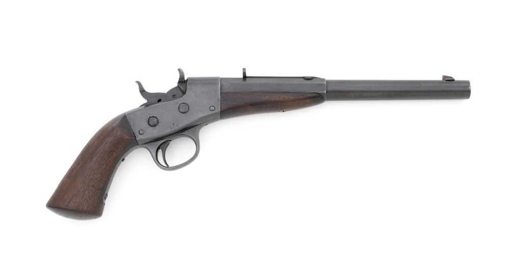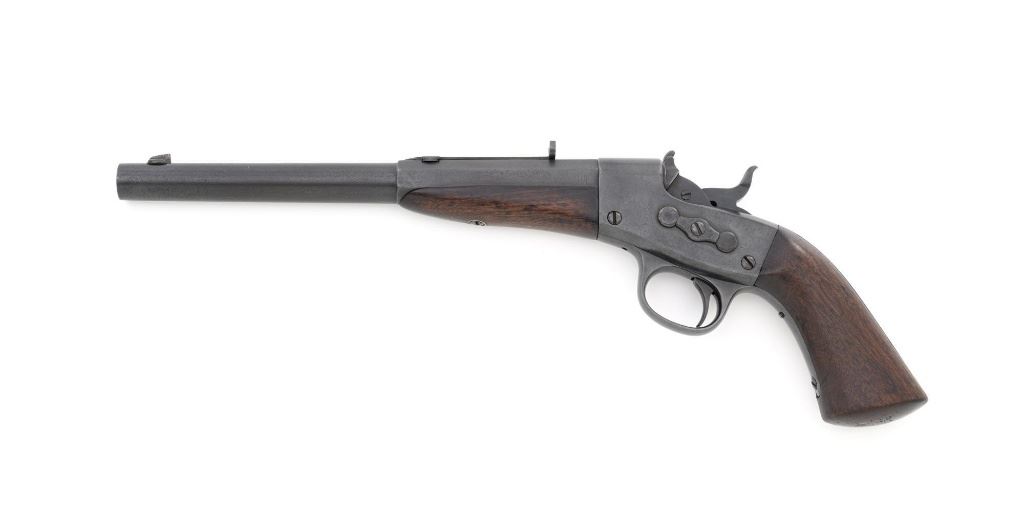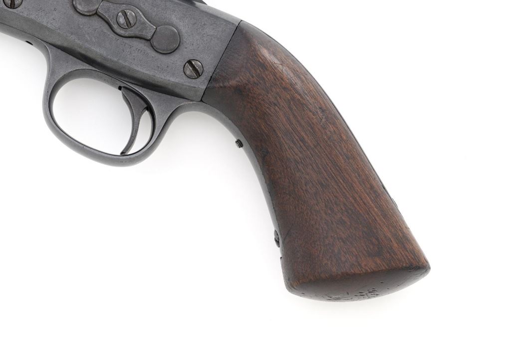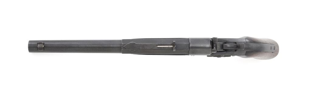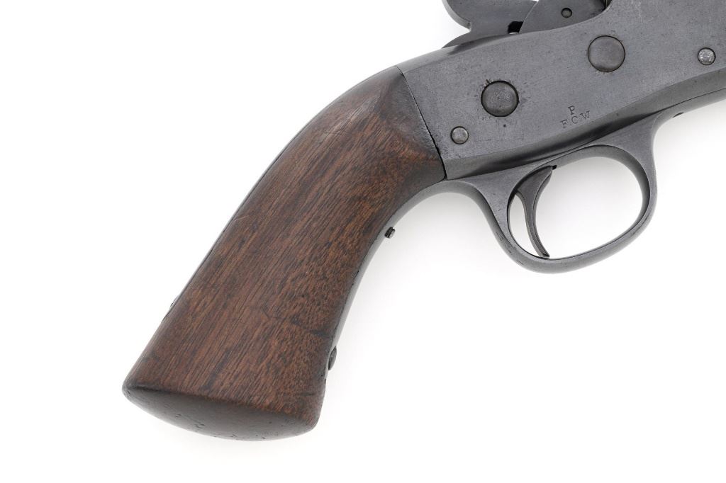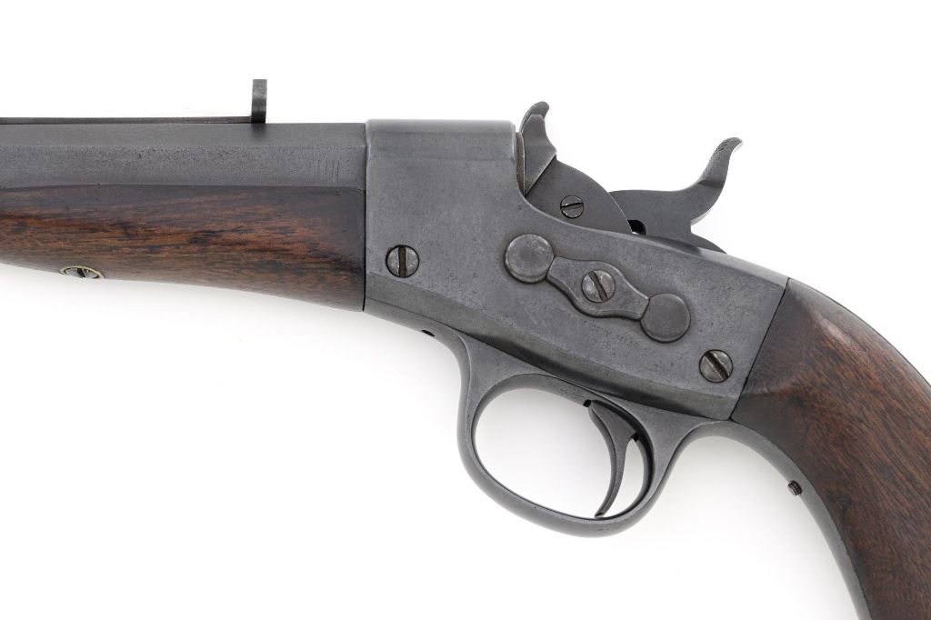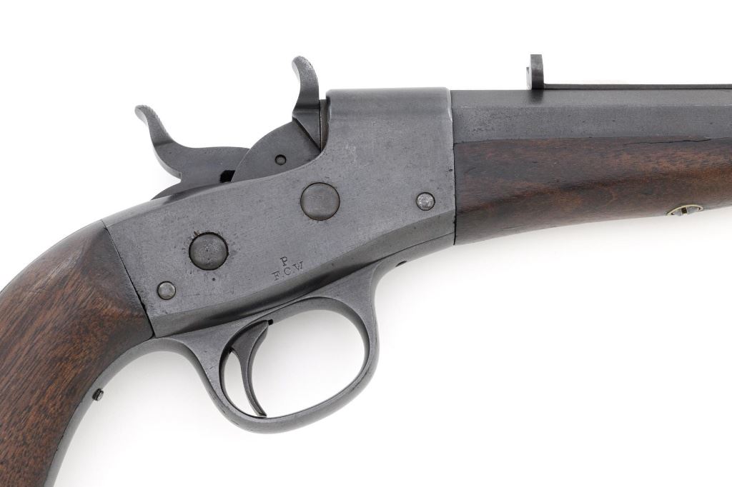 Target Modified Remington Model 1867 Navy Pattern Rolling Block Single Shot Pistol, #414, .22 cal., 10" half round/half octagon barrel, reblued finish, smooth walnut grip and forend, with dovetailed blade front sight, and dovetailed semi-buckhorn rear sight with elevator. There are no markings on the barrel and the only visible serial numbers are on the left side of the frame. Lower right side of the frame with "P/F.C.W." inspectors mark. Overall condition is very good, retaining over 95%+ of its old refinish, which was applied over areas of mild pitting, heavier underneath the forend. Small portion of the factory markings on left side of the frame are visible. Grip and forend are very good to near fine, with pleasing grain patterns, showing moderate handling wear. Action is crisp and operates smoothly. Bore is rough with partially visible rifling. Est.: $600-$800. (Antique) (Michael Strietbeck Collection)