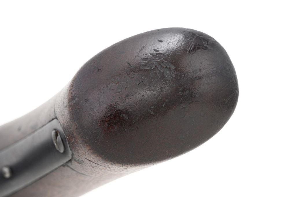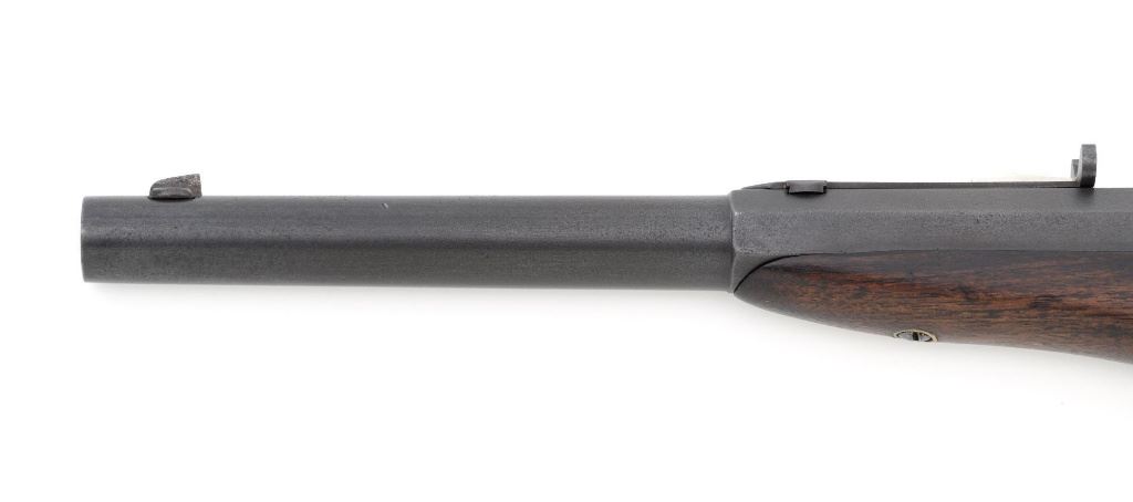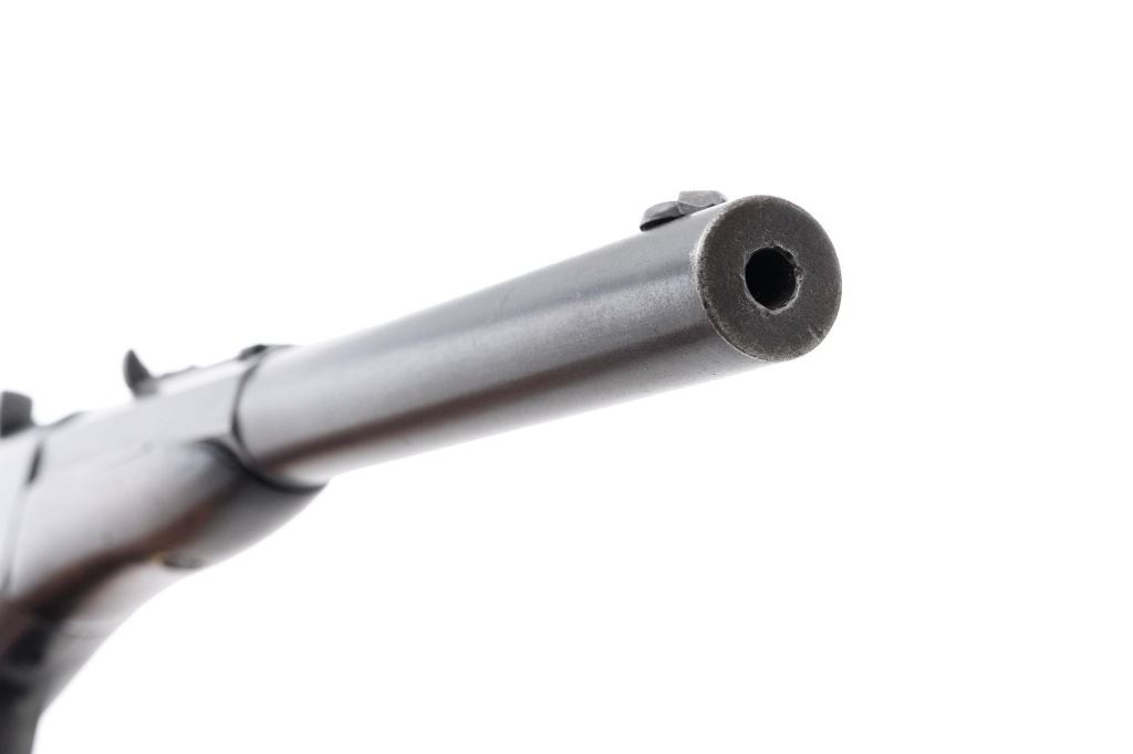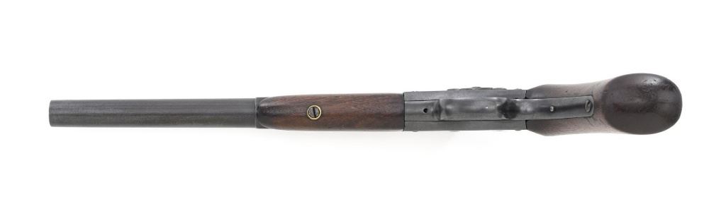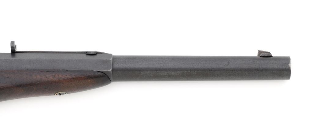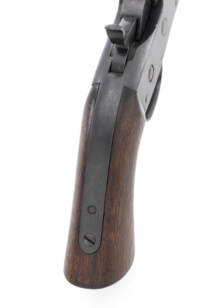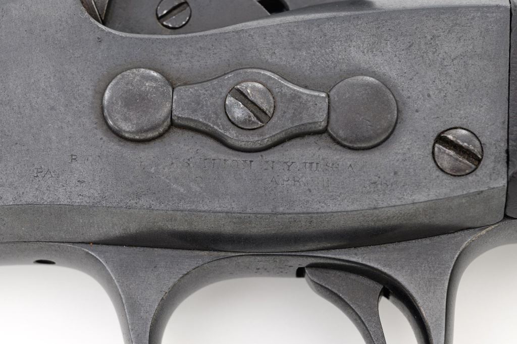 Target Modified Remington Model 1867 Navy Pattern Rolling Block Single Shot Pistol, #414, .22 cal., 10" half round/half octagon barrel, reblued finish, smooth walnut grip and forend, with dovetailed blade front sight, and dovetailed semi-buckhorn rear sight with elevator. There are no markings on the barrel and the only visible serial numbers are on the left side of the frame. Lower right side of the frame with "P/F.C.W." inspectors mark. Overall condition is very good, retaining over 95%+ of its old refinish, which was applied over areas of mild pitting, heavier underneath the forend. Small portion of the factory markings on left side of the frame are visible. Grip and forend are very good to near fine, with pleasing grain patterns, showing moderate handling wear. Action is crisp and operates smoothly. Bore is rough with partially visible rifling. Est.: $600-$800. (Antique) (Michael Strietbeck Collection)