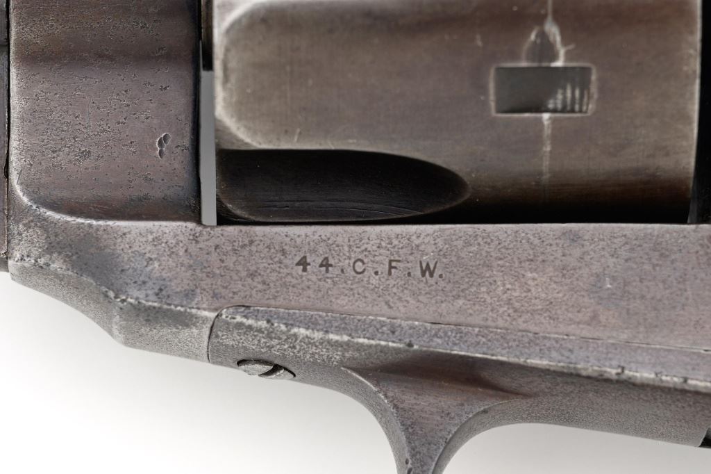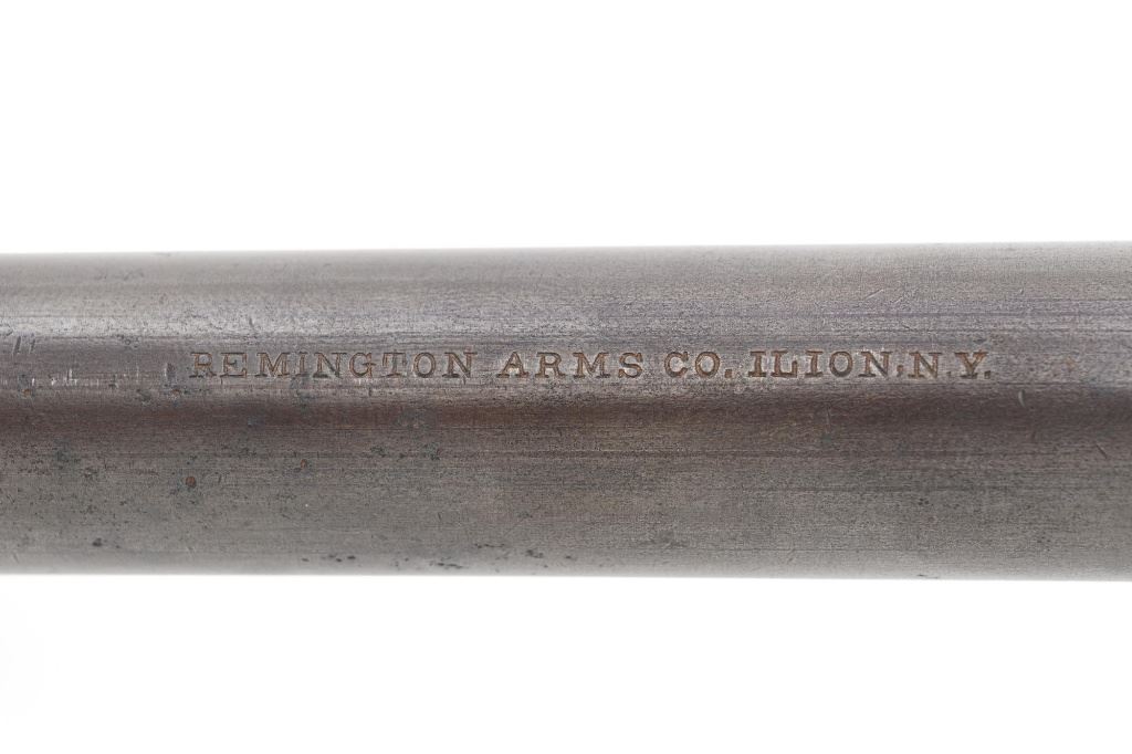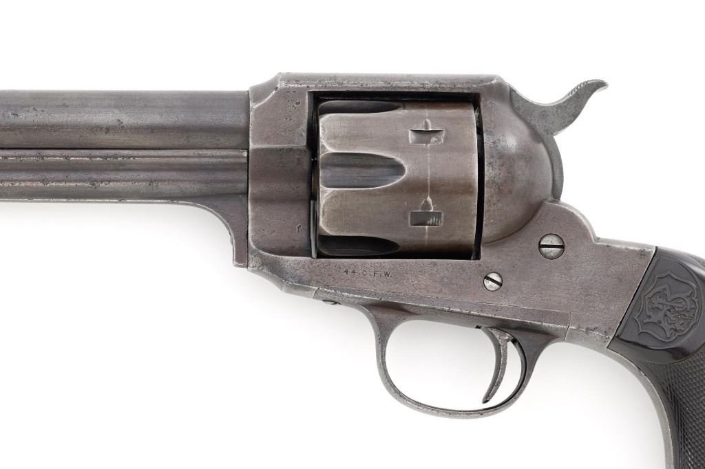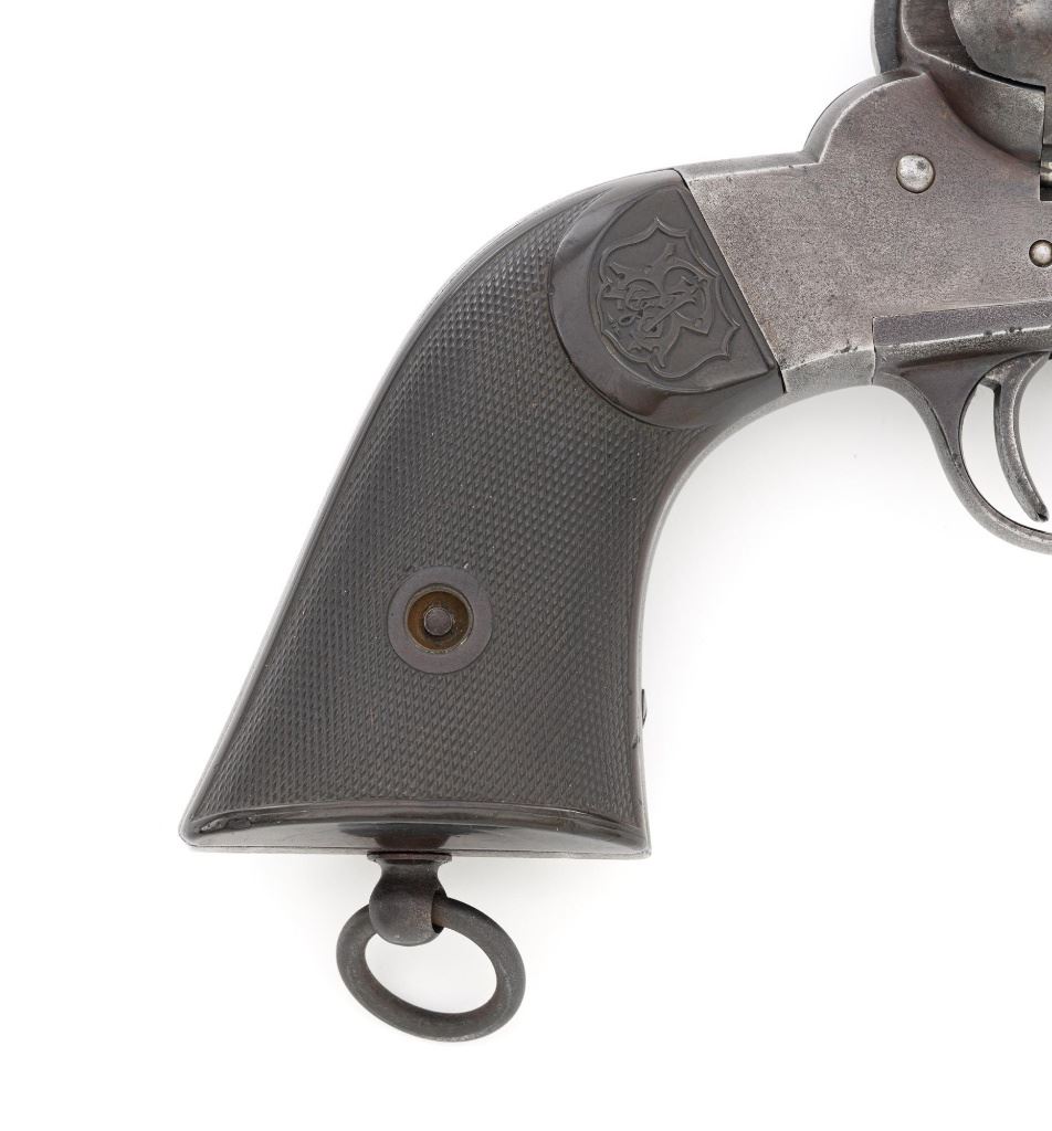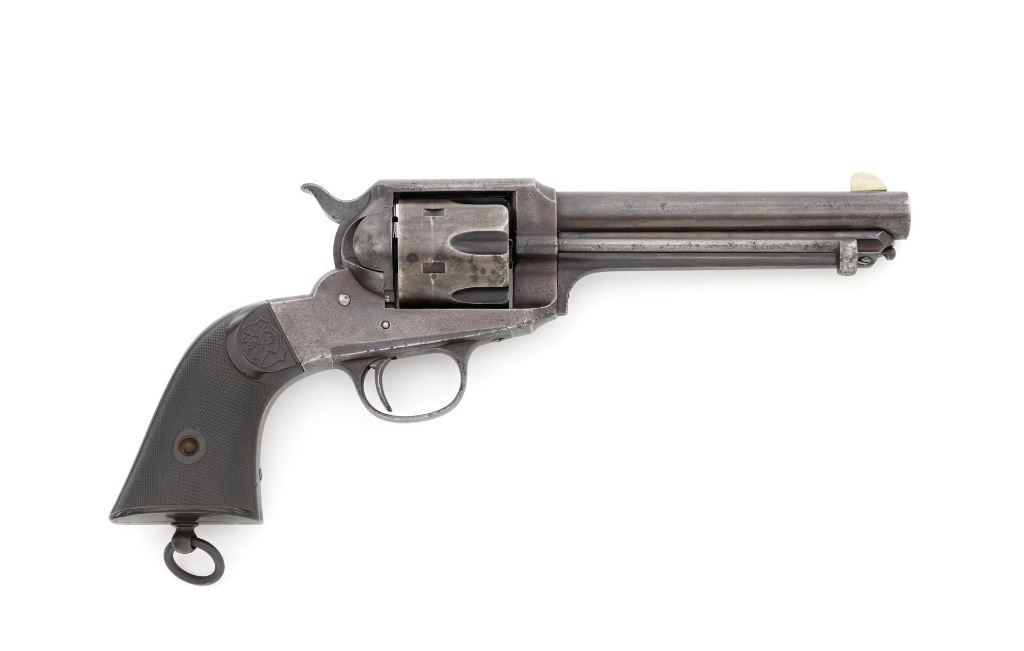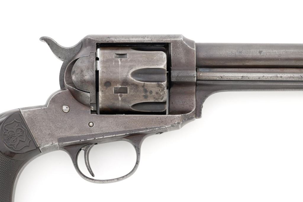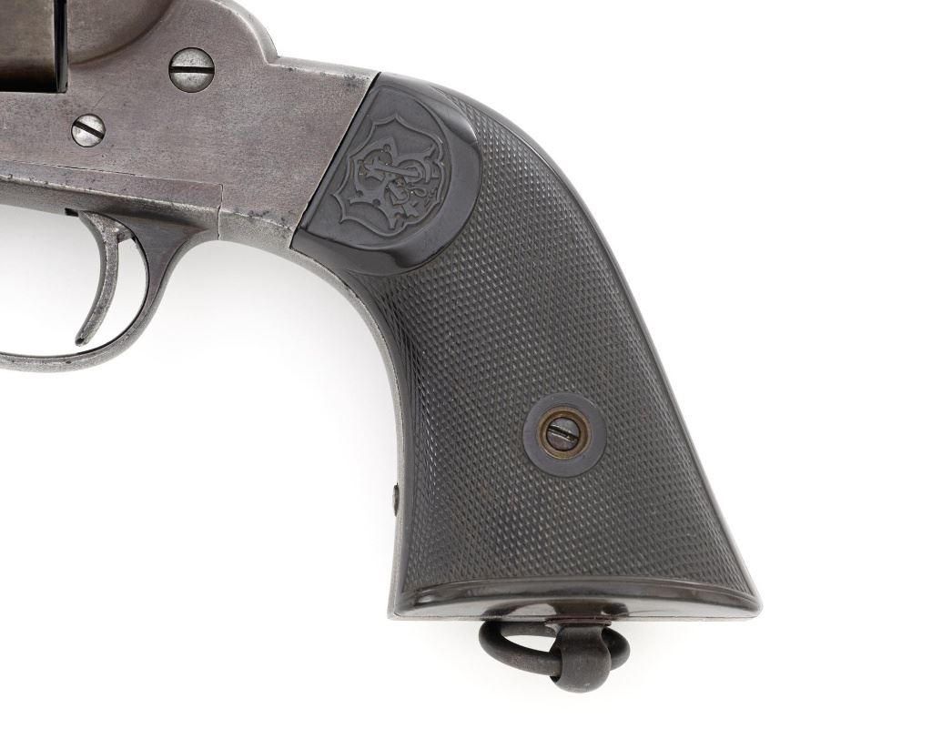 Remington Model 1890 Single Action Revolver, #135, .44-40 cal., 5.75" barrel, blue finish, checkered hard rubber grips with "RA" monogram, fixed German silver blade front sight and notched rear sight, with lanyard ring at the butt. Barrel address reads "REMINGTON ARMS CO. ILION, N.Y." Left side of the frame is marked 44 C.F.W." Serial number located on left side of the grip frame and scratched into the back of each grip. The Remington Model 1890 was manufactured between 1891-1896 with a total production of only 2,020 units. Overall condition is very good, displaying an even dark brown patina to the metal surfaces, scattered areas of light pitting, with traces of blue finish in the cylinder flutes and some of the protected areas. Factory lettering is clear. Grips are near excellent, with minimal handling marks. Action is crisp and cycles smoothly. Bore with several small spots/specks of erosion, rifling rates near fine. Est.: $1,500-$2,500. (Antique) (Michael Strietbeck Collection)