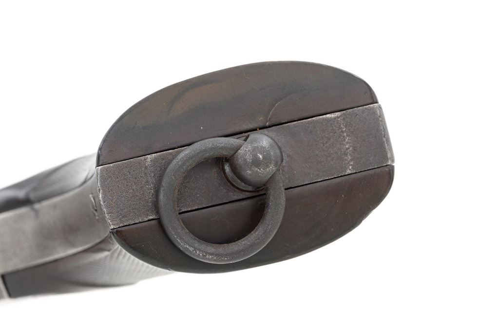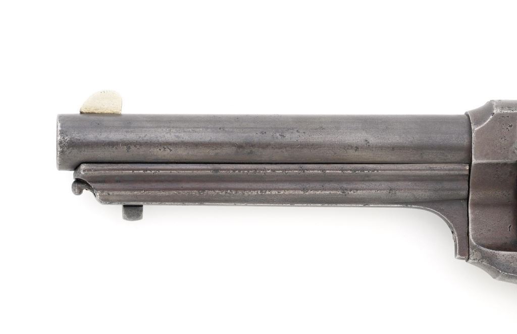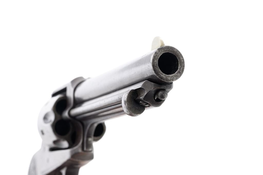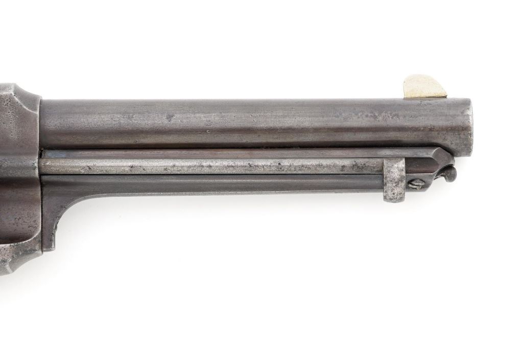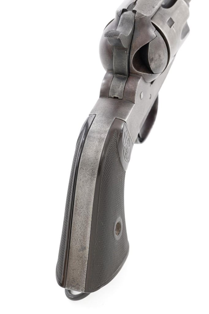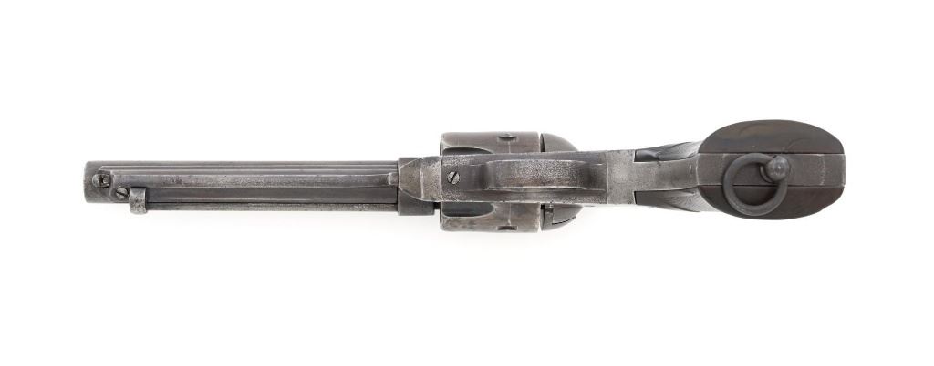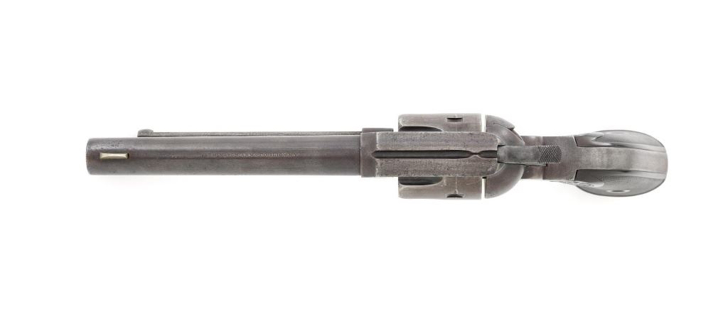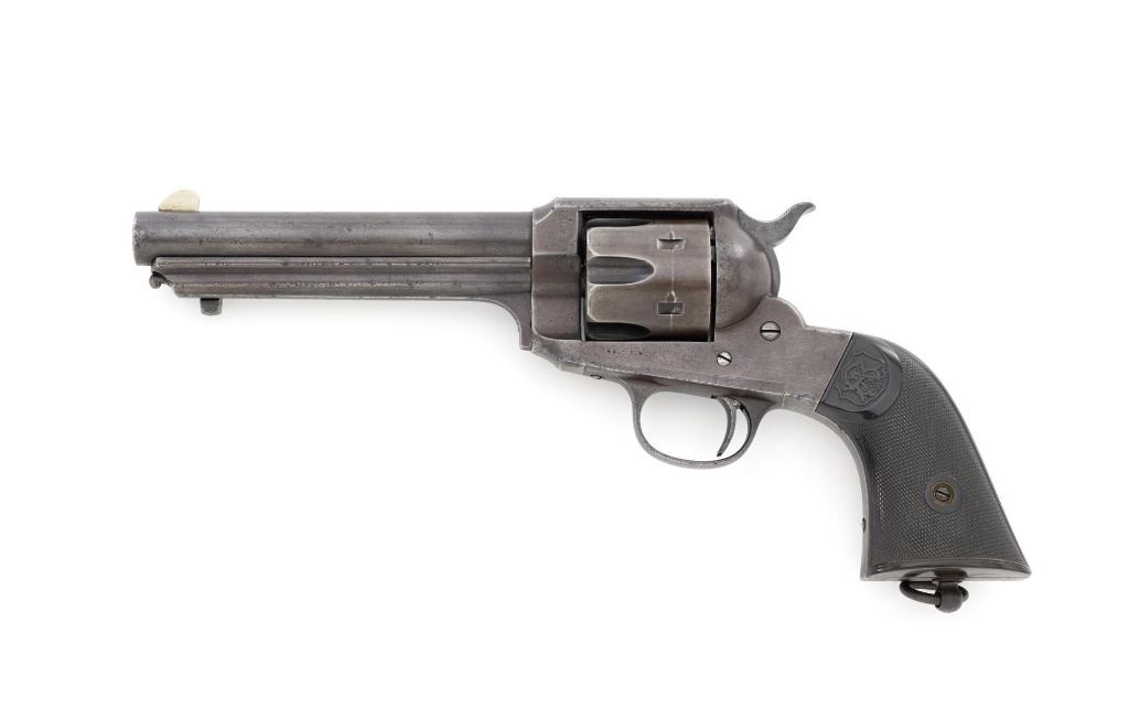 Remington Model 1890 Single Action Revolver, #135, .44-40 cal., 5.75" barrel, blue finish, checkered hard rubber grips with "RA" monogram, fixed German silver blade front sight and notched rear sight, with lanyard ring at the butt. Barrel address reads "REMINGTON ARMS CO. ILION, N.Y." Left side of the frame is marked 44 C.F.W." Serial number located on left side of the grip frame and scratched into the back of each grip. The Remington Model 1890 was manufactured between 1891-1896 with a total production of only 2,020 units. Overall condition is very good, displaying an even dark brown patina to the metal surfaces, scattered areas of light pitting, with traces of blue finish in the cylinder flutes and some of the protected areas. Factory lettering is clear. Grips are near excellent, with minimal handling marks. Action is crisp and cycles smoothly. Bore with several small spots/specks of erosion, rifling rates near fine. Est.: $1,500-$2,500. (Antique) (Michael Strietbeck Collection)