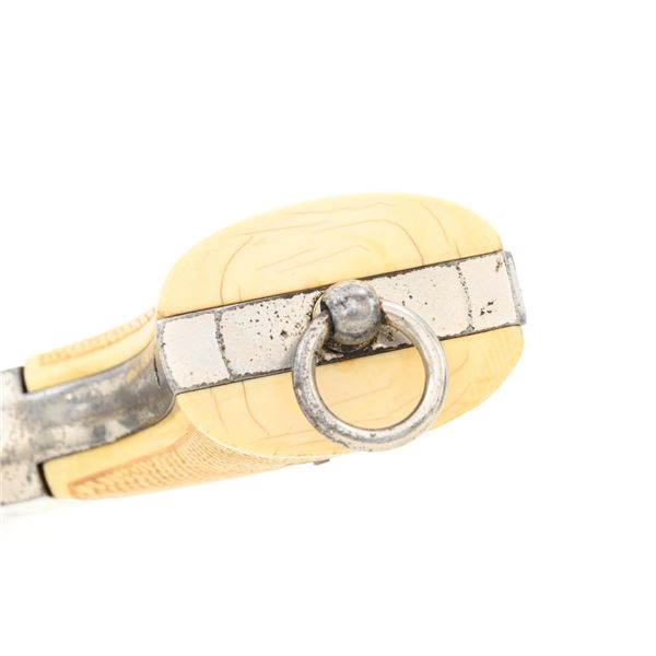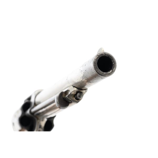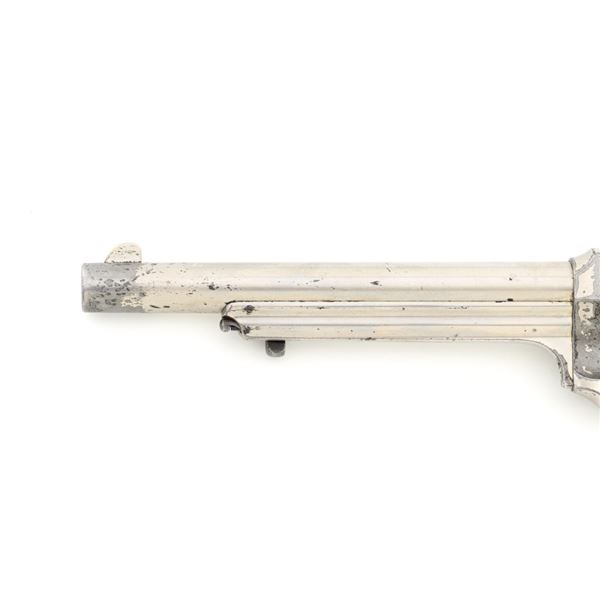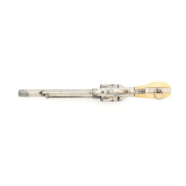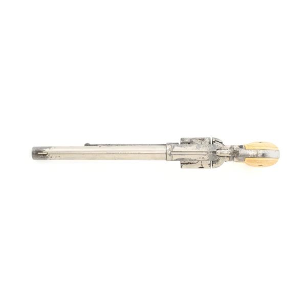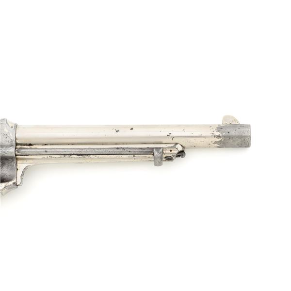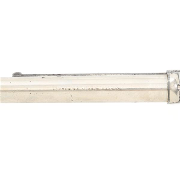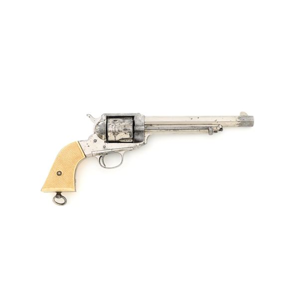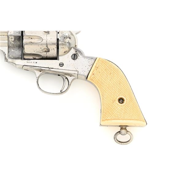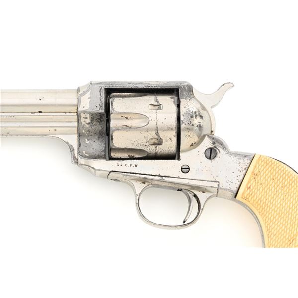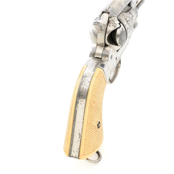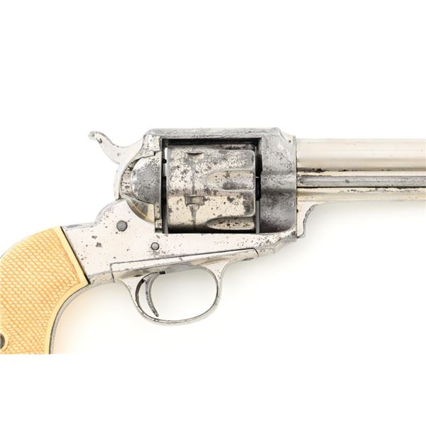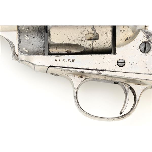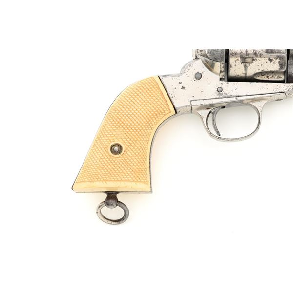 Remington Model 1890 Single Action Army Revolver, #1343, .44-40 cal., 7.5" barrel, nickel finish, checkered period two-piece ivory grips, blade front sight, and fixed "V"-notched rear sight, with lanyard ring. Barrel is marked in one line "REMINGTON ARMS CO. ILION, N.Y." Left side of the frame is marked 44 C.F.W." Serial number located on left side of the grip frame. The Remington Model 1890 was manufactured between 1891-1896 with a total production of only 2,020 units. Overall condition of this revolver is very good+, retaining approx. 65%-70% nickel finish, showing scattered spots of flaking and light erosion. Period checkered ivory grips are in fine condition, no major blemishes, and add nicely to the overall appearance of this revolver. Factory markings are clear. Action is crisp and cycles smoothly. Bore is fair with clear rifling and scattered moderate+ erosion. Est.: $2,000-$2,500. (Antique) (Michael Strietbeck Collection)