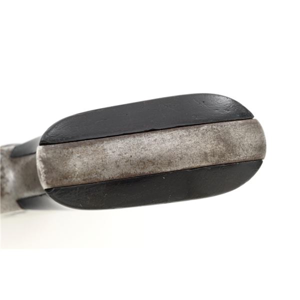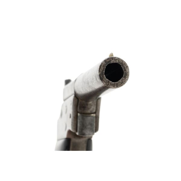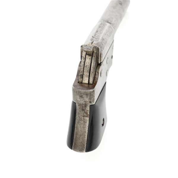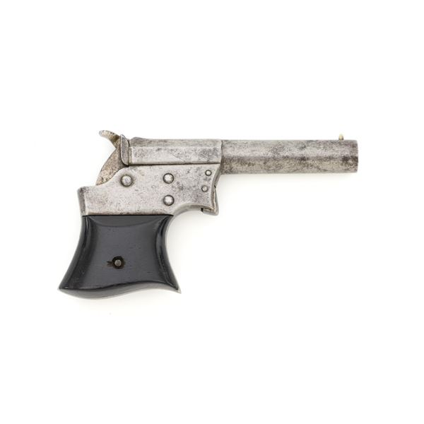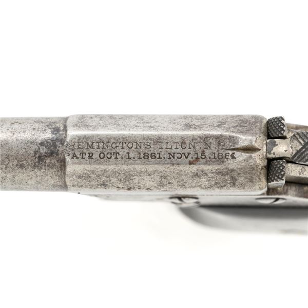 Remington Vest Pocket No. 2 Saw Handle Derringer, #1028, .32 RF cal., 3.5" barrel, gray patina, smooth two-piece rosewood grips, small cone front sight, with "V"-notched rear sight channel. Top of the barrel is marked in two-lines "REMINGTONS ILION N.Y./PATD OCT. 1, 1861. NOV. 15, 1864". This derringer is in overall good condition, showing a mixture of gray and spotted dark patina to the metal, with scattered light to moderate pinprick pitting throughout. Grips are fine retaining most of their oil finish, showing typical light marks from age and handling. Barrel address is clear. Action is crisp. Bore with scattered spots of erosion and very good rifling. Est.: $300-$500. (Antique) (Michael Strietbeck Collection)