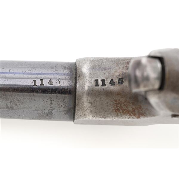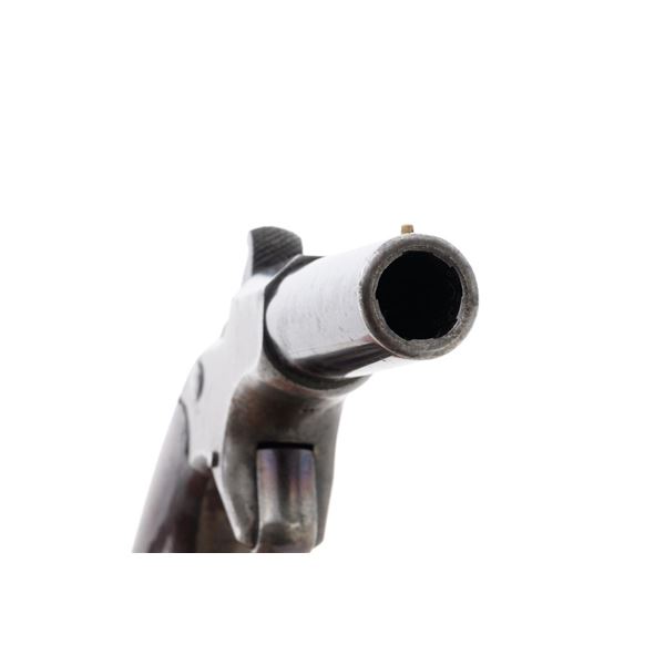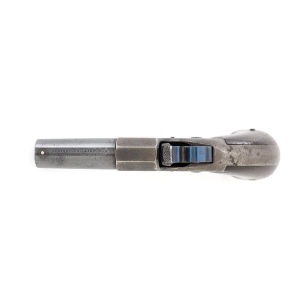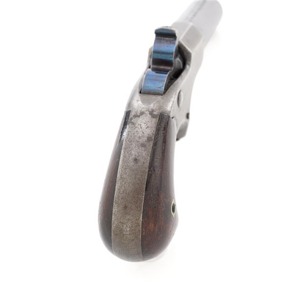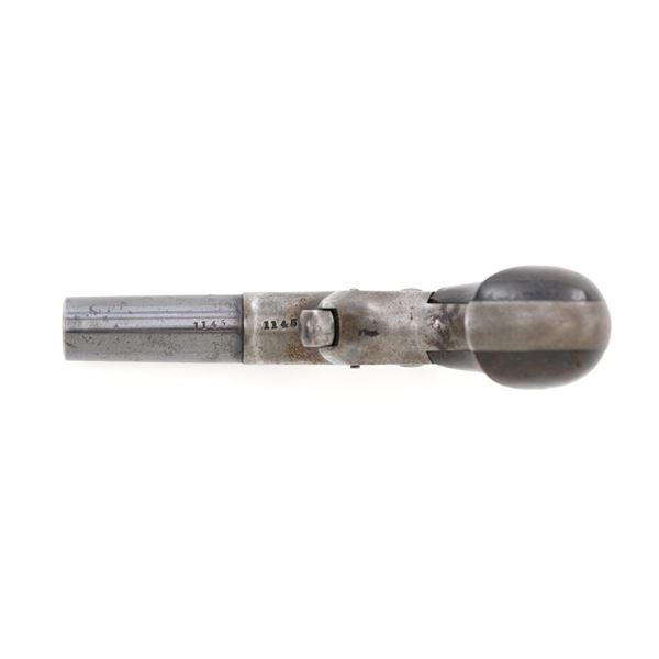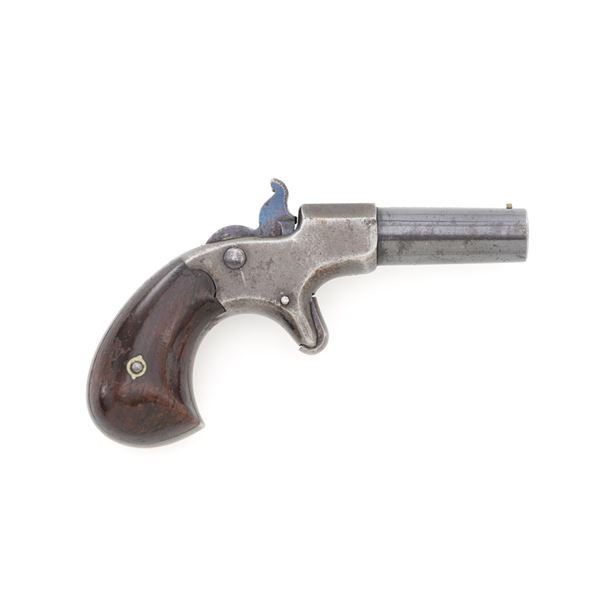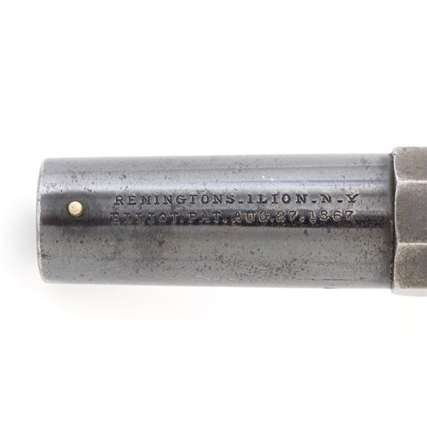 Remington-Elliot Single Shot Derringer, #1145, .41 RF cal., 2.5" barrel, blue finish to the barrel, nitre blued hammer and trigger, two-piece walnut grips, with small bead front sight. Matching numbers on bottom of the frame and barrel. Barrel address is marked in two-lines "REMINGTONS. ILION, N.Y./ELLIOT. PAT. AUG. 27, 1867." Mfgd circa 1867-1888 with an estimated total production of approx. 10,000. Overall condition is very good. Majority of the barrel finish remains, showing areas of thinning and mild patina. Hammer retains approx. 90% nitre blue, finish on the trigger is mostly toned dark, except for the edges. Frame displays a gray/brown patina. Grips are fine, with intermittent moderate handling marks, and areas of flaking to the varnish finish on the lower half of each grip. Factory lettering is sharp. Action is crisp. Bore is primarily bright, with a few small spots of minor erosion, excellent rifling. Est.: $800-$1,200. (Antique) (Michael Strietbeck Collection)