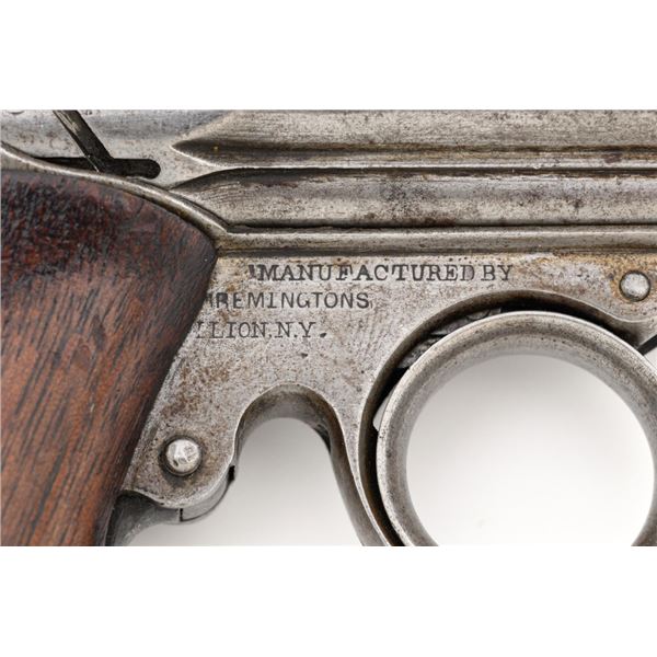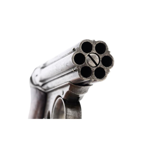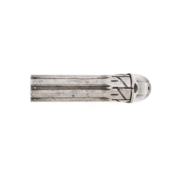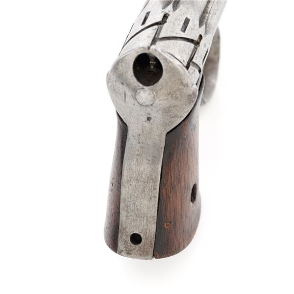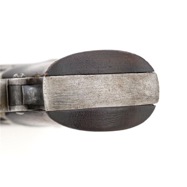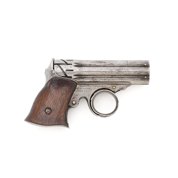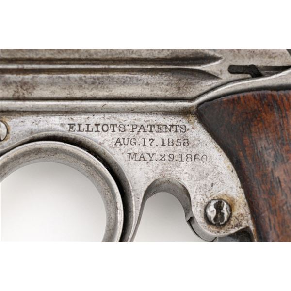 Remington-Elliot "Zig-Zag" Six-Shot Derringer, #731, .22 RF short cal., 3.25" barrel group, gray patina, two-piece walnut grips, with small bead front sight between each barrel, and notched rear sight. Left side of the frame is marked "ELLIOTS PATENTS/AUG. 17, 1858/MAY. 29, 1860". Right side is marked "MANUFACTURED BY/REMINGTONS/ILION, N.Y.". Mfgd circa 1861-1862, with fewer than 1,000 produced. Overall condition is very good, having worn to mostly gray, mixed with traces of blue finish in between the barrels, and moderate darkening/patina. Grips with expected light marks from age and use, no significant blemishes, showing considerable remaining oil finish. Factory lettering is clear. Action is crisp. Bores are good, with visible rifling, and light scattered erosion. Hard to find in any condition, this is a nice example. Est.: $1,800-$2,400. (Antique) (Michael Strietbeck Collection)