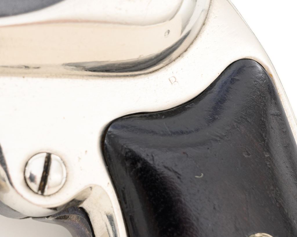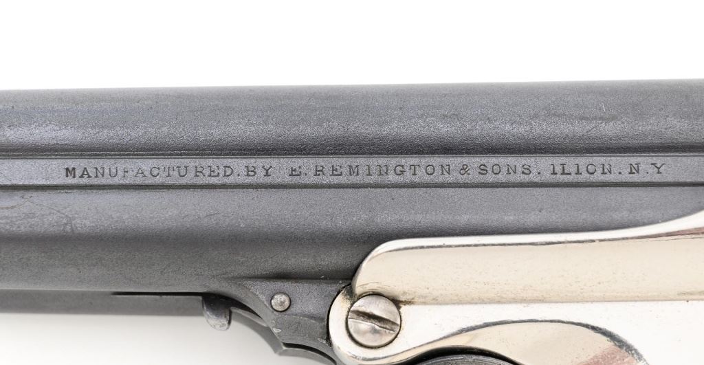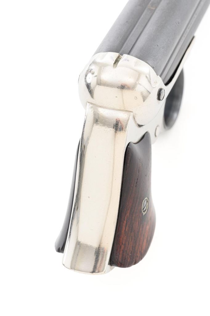Remington-Elliot Ring Trigger Four-Shot Derringer, #17478, .32 RF cal., 3.25" barrel group, blue with nickel plated frame, two-piece hardwood grips, half-moon German silver blade front sight, with notched rear sight. Left side of the barrel is marked "MANUFACTURED. BY E. REMINGTON & SONS. ILION, N.Y.". Right side is marked "ELLIOTS PATENTS MAY 29, 1860-OCT. 1, 1861". Mfgd circa 1863-1888, with approx. 17,500 in .32 RF cal. Overall condition is fine as refinished, which appears professionally done. Barrels have a subdued blue finish, with a few salt and pepper pits. "Elliots" on the right side of the barrel is a little worn, factory lettering is otherwise clearly defined. Approx. 98% renickeled finish remains, applied over some mild pitting on sides of the frame. Grips are fine with beautiful grain patterns and most of their rich oil finish remaining. Action is crisp. Bores are fine, with clear rifling, and intermittent mild erosion. Est.: $500-$700. (Antique) (Michael Strietbeck Collection)