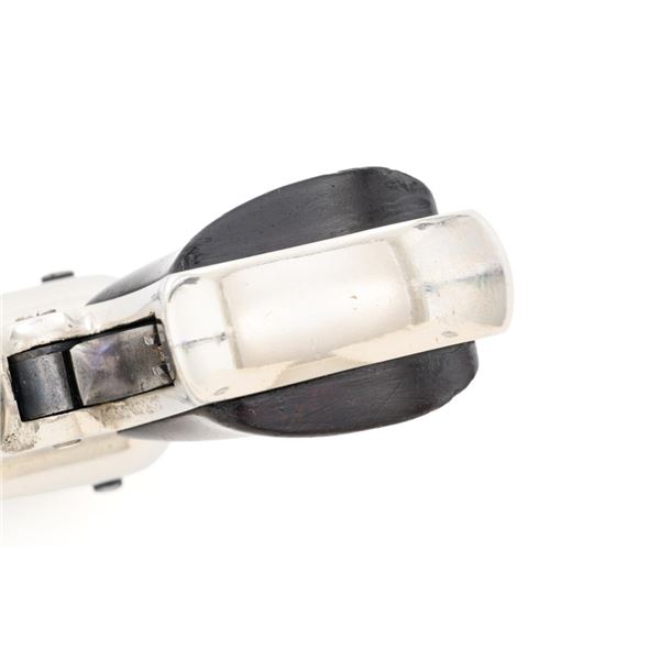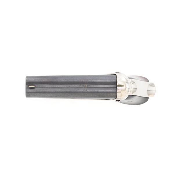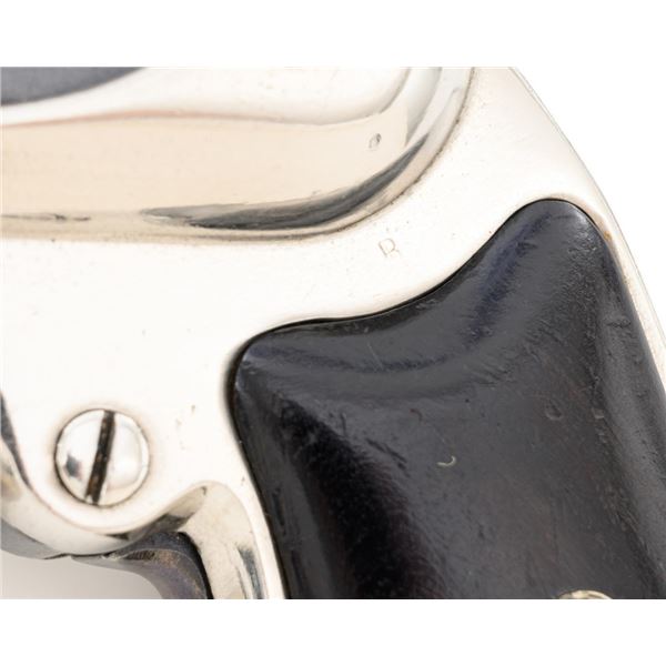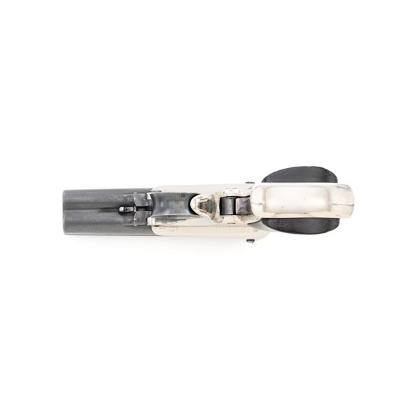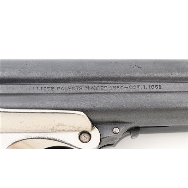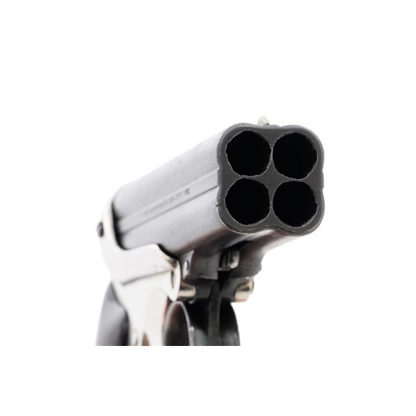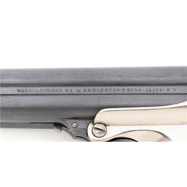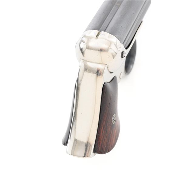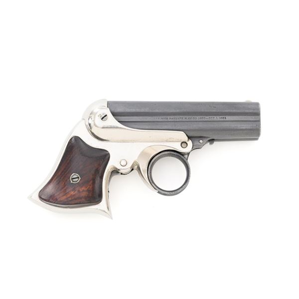 Remington-Elliot Ring Trigger Four-Shot Derringer, #17478, .32 RF cal., 3.25" barrel group, blue with nickel plated frame, two-piece hardwood grips, half-moon German silver blade front sight, with notched rear sight. Left side of the barrel is marked "MANUFACTURED. BY E. REMINGTON & SONS. ILION, N.Y.". Right side is marked "ELLIOTS PATENTS MAY 29, 1860-OCT. 1, 1861". Mfgd circa 1863-1888, with approx. 17,500 in .32 RF cal. Overall condition is fine as refinished, which appears professionally done. Barrels have a subdued blue finish, with a few salt and pepper pits. "Elliots" on the right side of the barrel is a little worn, factory lettering is otherwise clearly defined. Approx. 98% renickeled finish remains, applied over some mild pitting on sides of the frame. Grips are fine with beautiful grain patterns and most of their rich oil finish remaining. Action is crisp. Bores are fine, with clear rifling, and intermittent mild erosion. Est.: $500-$700. (Antique) (Michael Strietbeck Collection)
