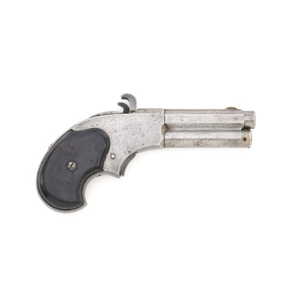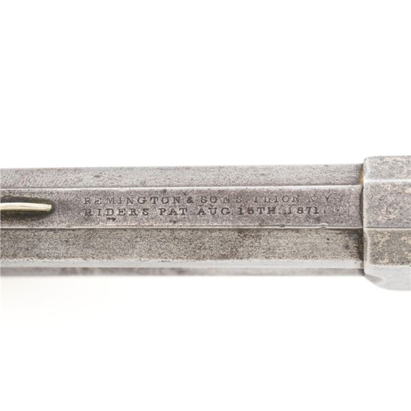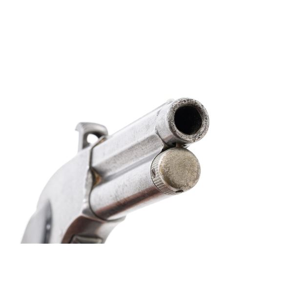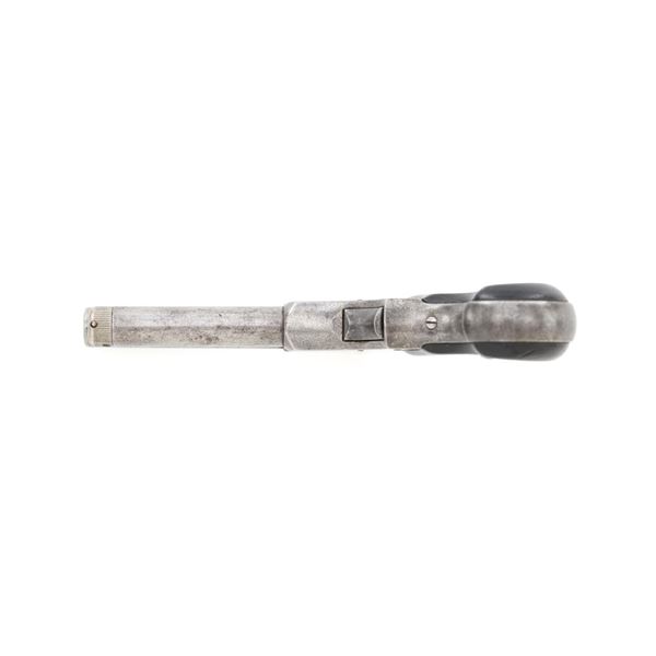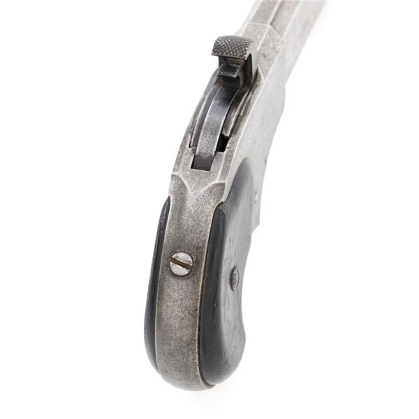 Remington-Rider Magazine Pistol, #NVSN, .32 RF Extra Short cal., 3" barrel, nickel finish, two-piece rosewood grips, with half-moon blade front sight. Top of the barrel is marked in two-lines "REMINGTON & SONS. ILION, N.Y./RIDERS PAT. AUG. 15TH, 1871". Mfgd circa 1871-1888, with approx. 15,000 produced. Metal is very good, displaying a mixture of muted nickel finish and bare gray metal, with general mild pitting. Grips are good with several moderate dents, scratches, and finish wear to both panels. Action is crisp. Rifling is clearly defined, bore is generally dark with scattered spots of moderate erosion. Est.: $700-$900. (Antique) (Michael Strietbeck Collection)