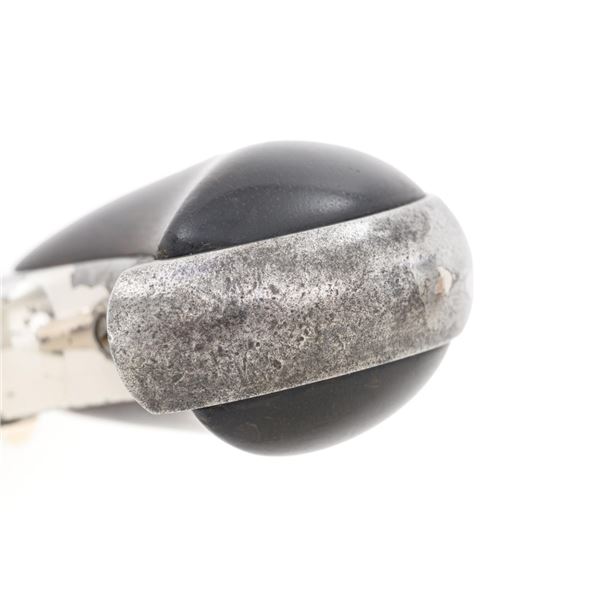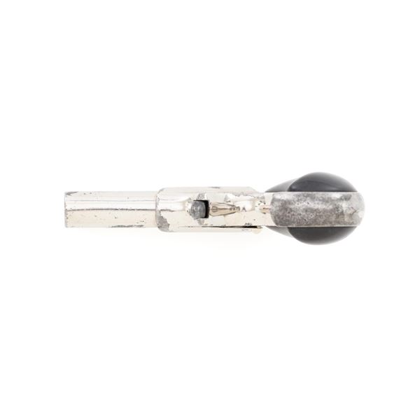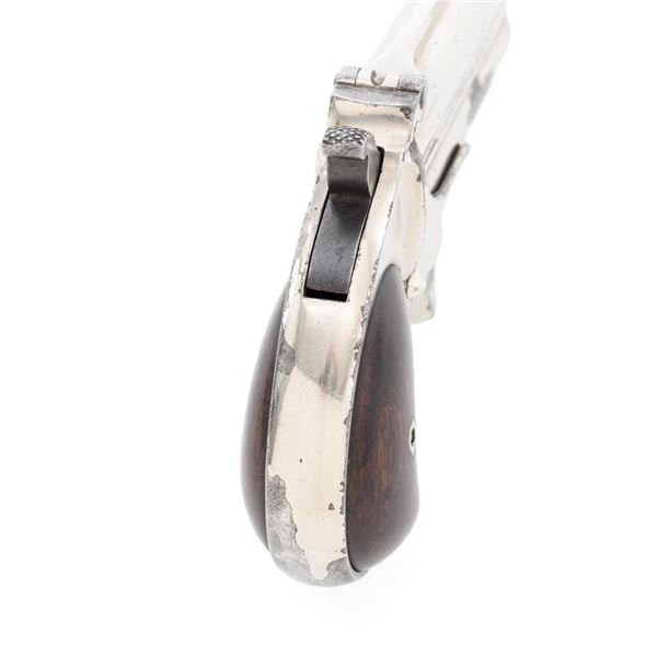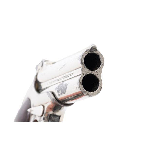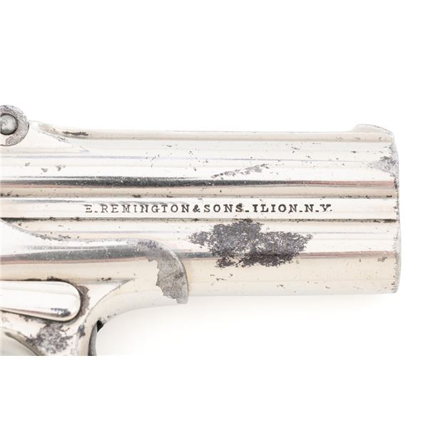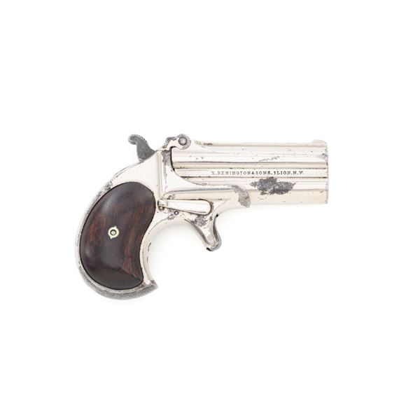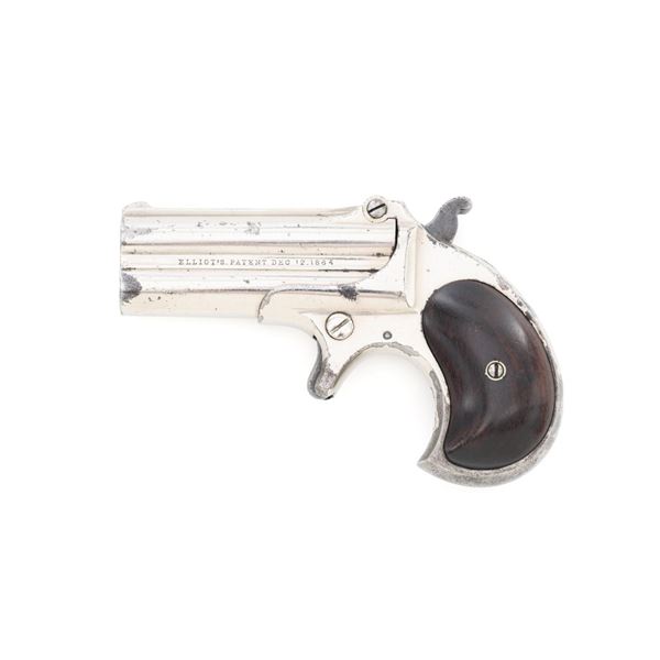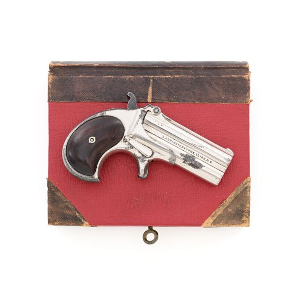 Early production Type I Remington-Elliot Double Derringer, #1622, .41 RF short cal., 3" barrels, nickel finish, blued hammer and trigger, no extractor, two-piece rosewood grips, integral blade front sight, and fixed notched rear sight. Left side of the barrel is marked "ELLIOTS. PATENT DEC 12, 1865". Right side "E. REMINGTON & SONS. ILION, N.Y.". Matching number on left side of the grip frame and underside of the barrel. Mfgd circa 1866, with less than 2,000 Type I produced without the extractor. Overall condition is near fine, retaining approx. 70%-75% factory nickel finish, with losses primarily to the grip frame and right side of the barrel. Factory lettering is clear. Hinge is not damaged. Grips are near excellent, with only a few light handling marks, and a majority of their rich oil finish present. Action is crisp. Bore is dark with general moderate erosion and clearly defined rifling. Contained in lockable concealment book case, with blue interior, and 6-cartridge storage capacity. Marked on the spine "TWIN BARREL JUSTICE --- REMINGTON". In fine overall condition, showing scuffs and wear to the leather binding and corners. Est.: $1,600-$2,200. (Antique).(Michael Strietbeck Collection)