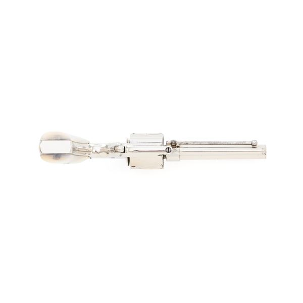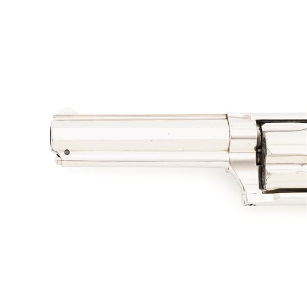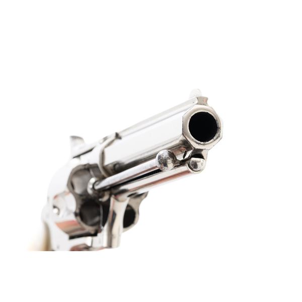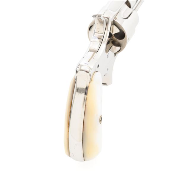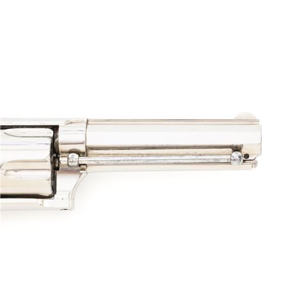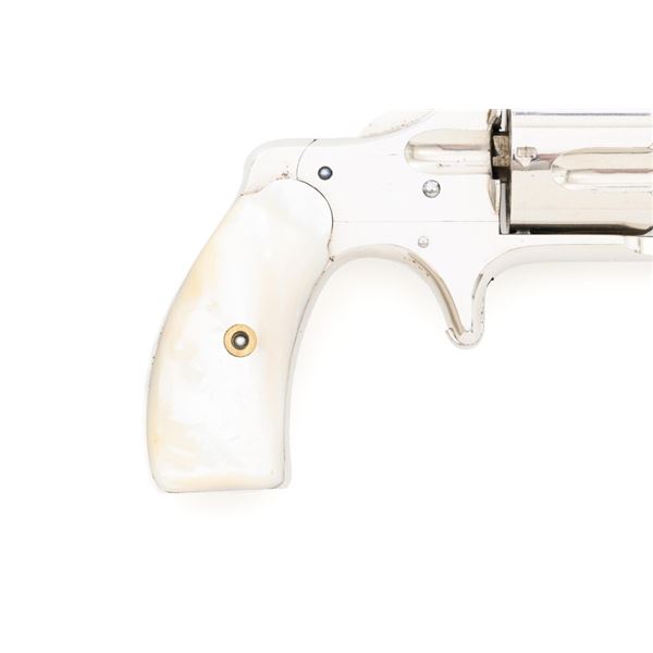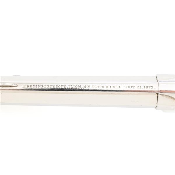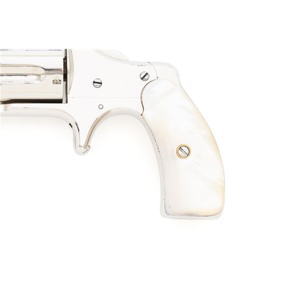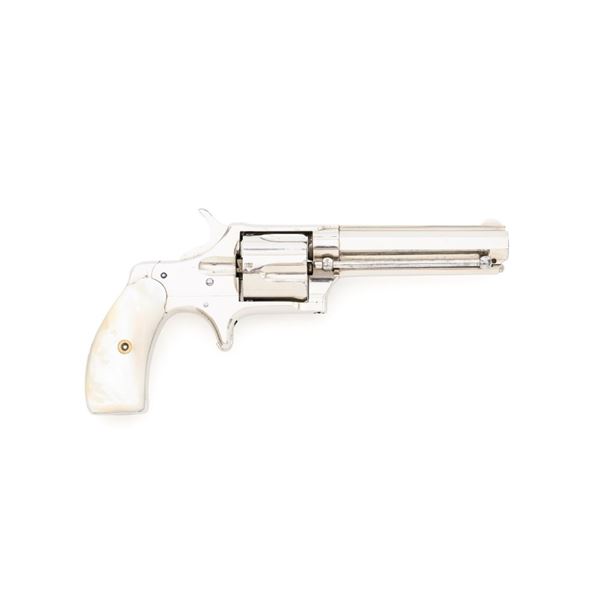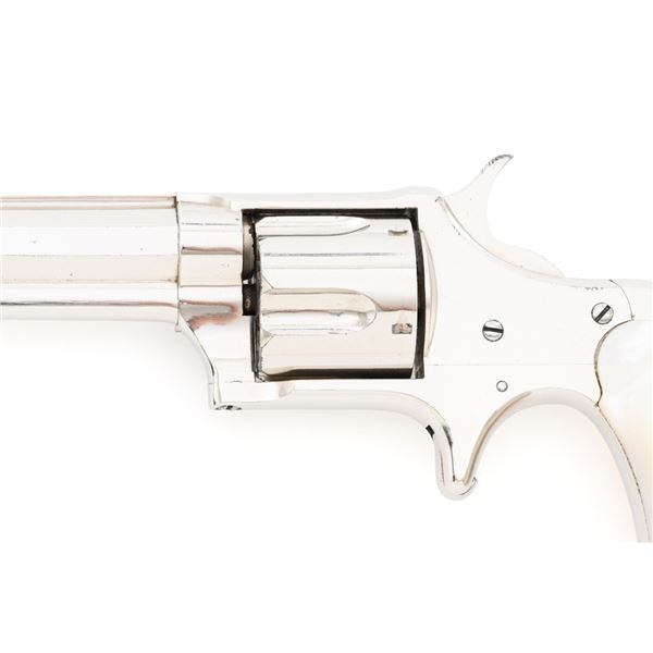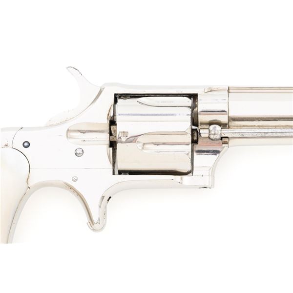 Remington-Smoot New Model #3 Saw Handle Revolver, #NVSN, .38 RF Short cal., 3.75" octagon barrel with solid rib, nickel finish, pearl grips, fixed blade front and "V"-notched rear sight. Top of the barrel is marked in one-line "E. REMINGTON & SONS. ILION, N.Y. PAT. W.S. SMOOT. OCT. 21, 1873". Approx. 6,000 manufactured in this configuration. Includes a glass topped wood display case with fitted red interior. Revolver is in near excellent condition, retaining approx. 97%-98% bright nickel finish, with scattered light scratches and handling marks. Barrel address is crisp. Grips are near excellent. Action is crisp. Bore is fine with well-defined rifling. Wood display case is in excellent condition. Est.: $500-$700. (Antique) (Michael Strietbeck Collection)
