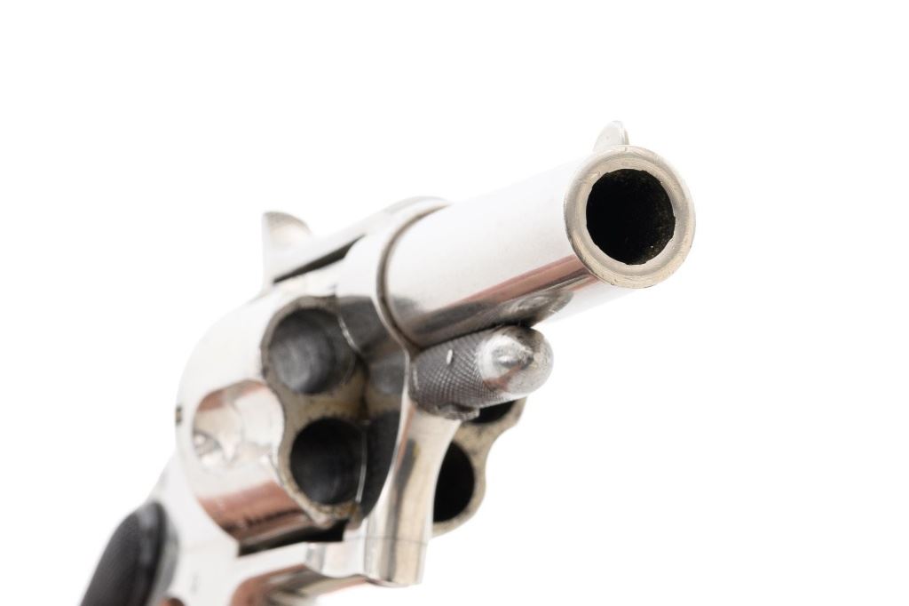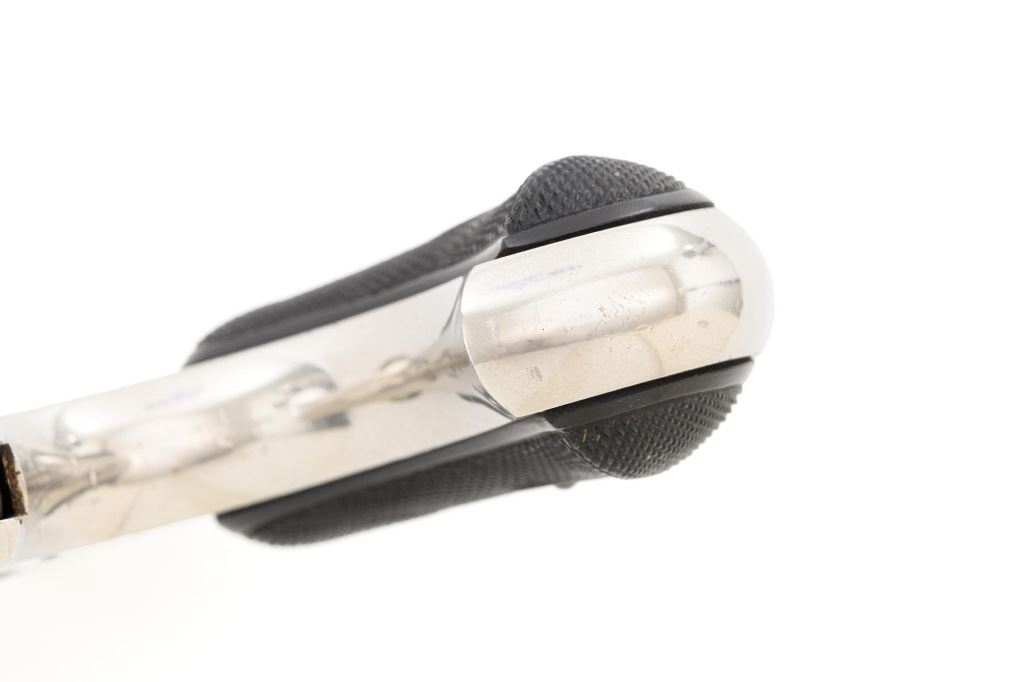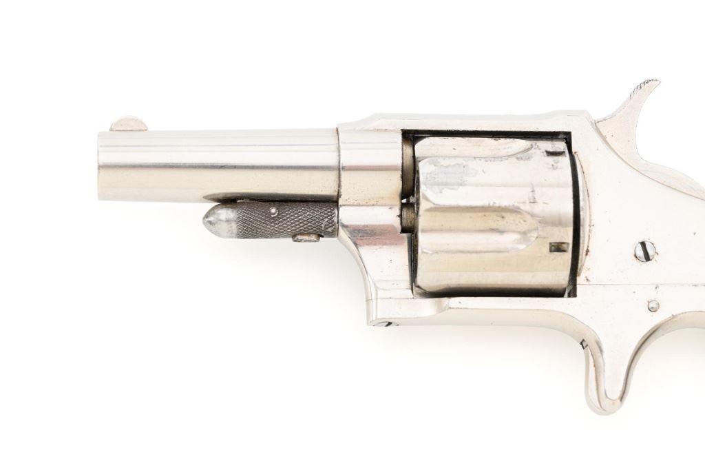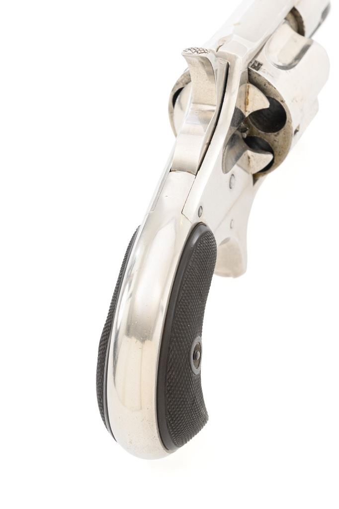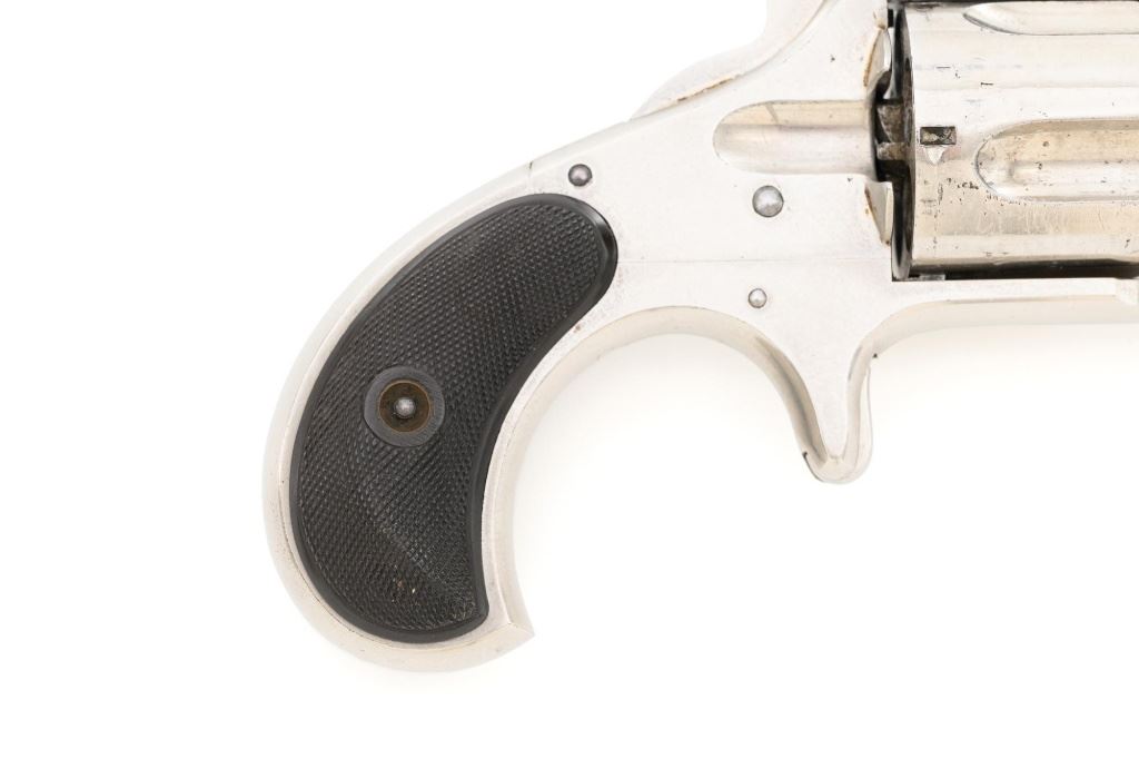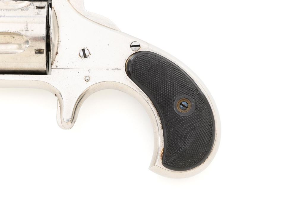 Remington-Smoot New Model No. 4 Spur Trigger Revolver, #21472, .38 CF cal., 2.5" barrel, nickel finish, checkered black two-piece hard rubber grips, half-moon blade front sight, with milled groove in the rear of the top strap. Marked on top of the barrel "E. REMINGTON & SONS. ILION, N.Y." Approx. 23,000 were manufactured circa 1877-1888. Overall condition is fine, displaying approx. 95% nickel finish, with a crisp barrel address. Grips are excellent. Action is strong and crisp, Bore with scattered spots of mild erosion, rifling is clearly defined and rates very good overall. Est.: $600-$800. (Antique) (Michael Strietbeck Collection)