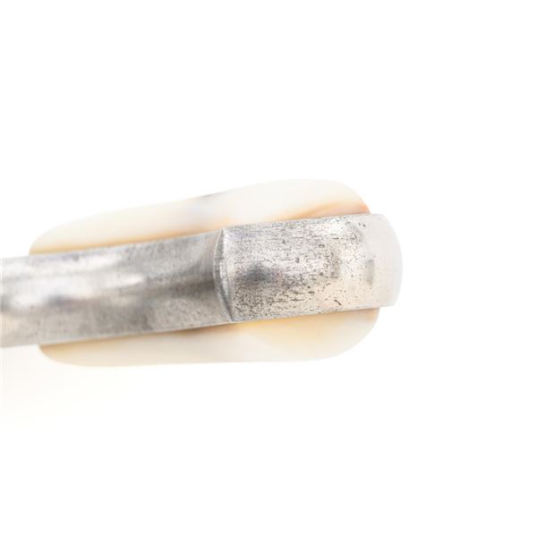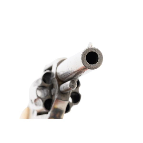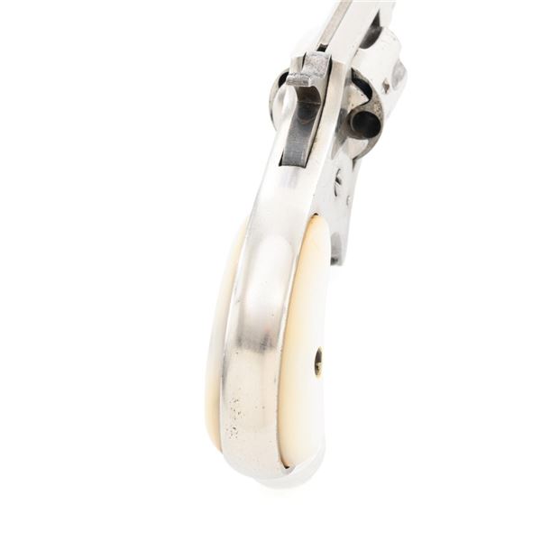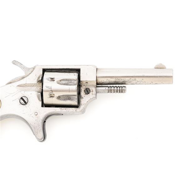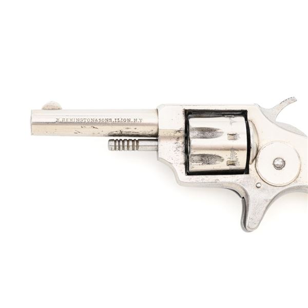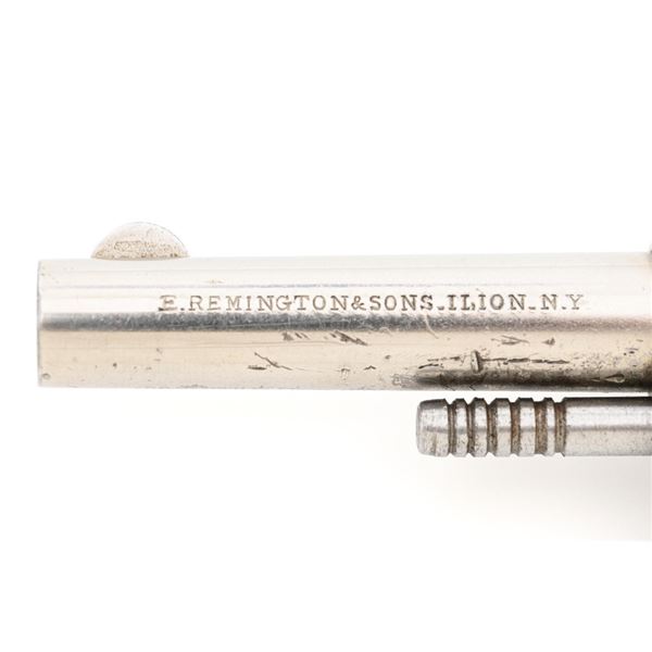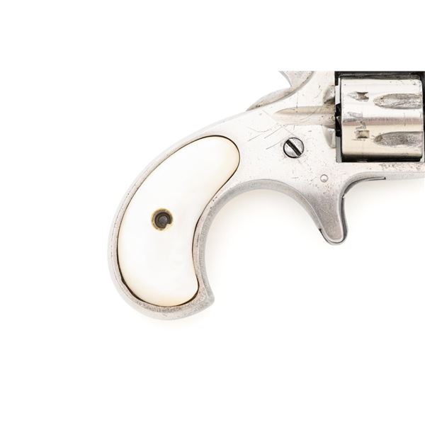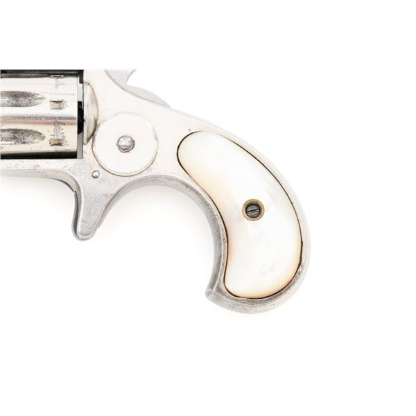 Remington Iroquois Spur Trigger Pocket Revolver, #NVSN, .22 RF cal., 7-shot fluted cylinder, 2.25" barrel, nickel finish, two-piece pearl grips, half-moon blade front sight, milled groove in the rear of the top strap. Barrel address is sharply marked on the left side "E. REMINGTON & SONS ILION, N.Y." Approx. 10,000 mfgd circa 1878-1888. Overall condition is fine, retaining much of the nickel finish, with scattered small impressions and handling marks. Grips are near excellent, with beautiful iridescent colors, and a few very minor fissures on the right grip. Action is crisp. Bore is very good with well-defined rifling. Est.: $300-$500. (Antique) (Michael Strietbeck Collection)