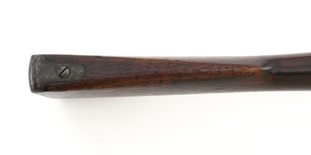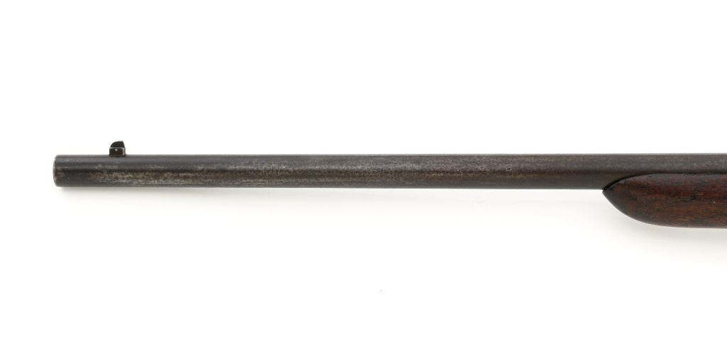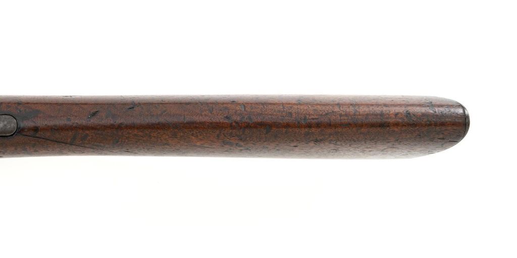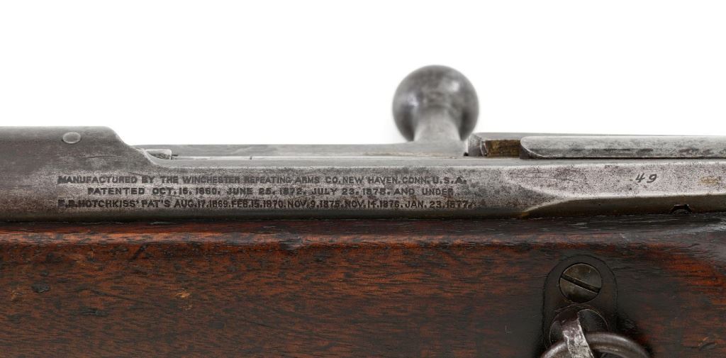 Winchester-Hotchkiss First Model 1879 Bolt Action Saddle Ring Carbine, #49, .45-70 cal., 24" round barrel, blue finish, straight grip walnut 3/4 length stock, pinned blade front sight, with flip-up adjustable rear sight. This carbine also features a 5-round tubular magazine located inside the stock, saddle ring, and magazine cut-off switch (missing) on the right side of the stock so the carbine could be used as a single shot or a repeater. Left side of the receiver with serial number and Winchester/Hotchkiss maker and patent information, marked in three-lines. Mfgd circa 1879. This carbine is in overall fair condition, displaying approx. 15%-20% thinning and toning blue finish, primarily to the buttplate, with the balance of the guns parts gone to a gray/brown patina. As noted previously, the magazine cut-off switch is missing. Factory lettering is legible. The hardwood stock is fair, with a 1.5" break at the top right side of the wrist, which has been repaired with a small pin. There is another 2" crack at the bottom of the wrist, behind the rear trigger guard tang. Otherwise, wood displays numerous old dents and scratches throughout. Action is crisp. Bore is mostly bright with very good, clearly defined rifling, surface with some scattered light erosion, primarily near the muzzle. Est.: $1,000-$1,500. (Antique)