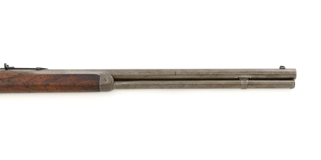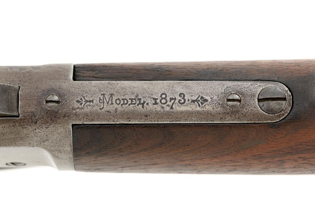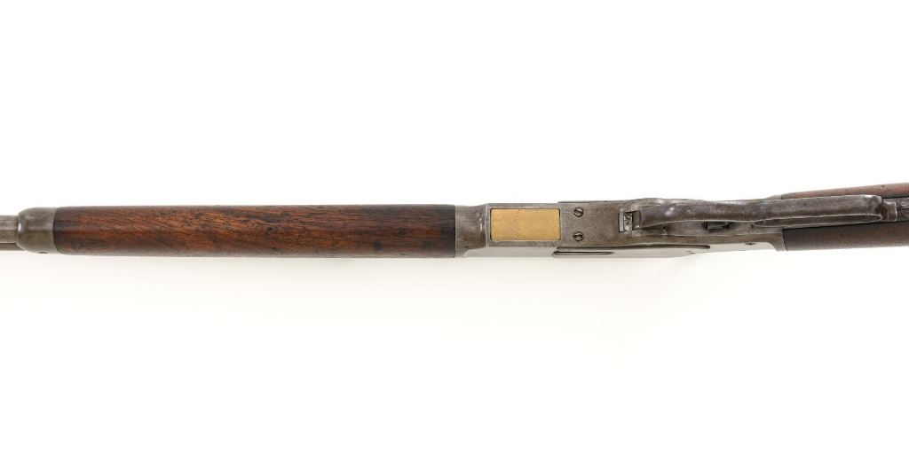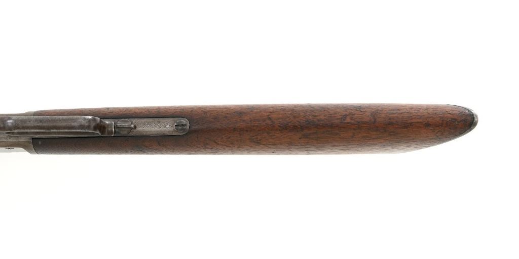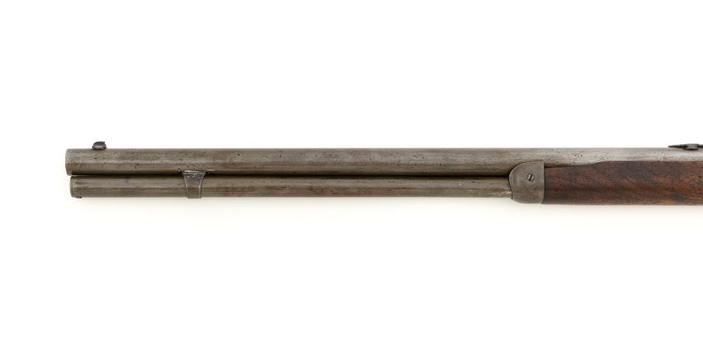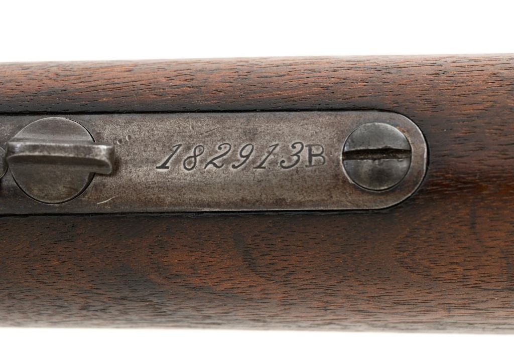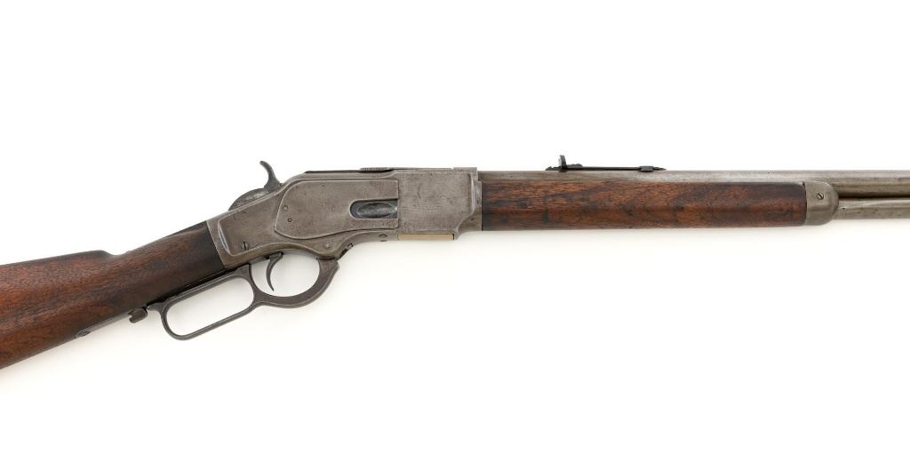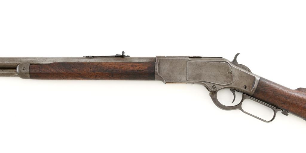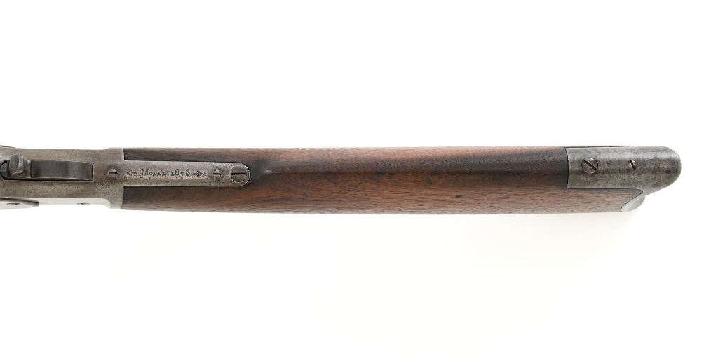 Antique Winchester Model 1873 3rd Model Lever Action Rifle, #182913, .44 W.C.F. cal., 24" round barrel, originally with a blue finish, smooth walnut straight grip stock and forend, crescent steel buttplate, replacement dovetailed Marble No.2 blade front sight, and replacement semi-buckhorn rear sight with elevator. Factory markings are clear with legible caliber marking on the base of the brass cartridge elevator. Mfgd 1885. Rifle is in good overall condition, with the metal surfaces having gone to a mostly even gray patina, with areas of light brown patina, and intermittent spots of mild pitting. Magazine tube with scattered shallow dings and mars. Receiver with small indentations and light erosion, particularly on the right side. Loading gate retains a significant amount of blue finish. Hammer and lever show traces of silvered color case hardened finish in the protected areas; balance is mostly dark. There is a piece missing from the upper left edge of the forend. Wood is otherwise very good, with scattered light dents and scratches, and the wood to metal fit is very good. Action functions well. Bore is fair with moderate erosion, deeper near the breech, showing visible rifling. Est.: $1,600-$2,200. (Antique)