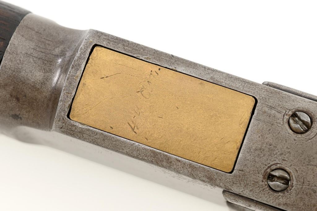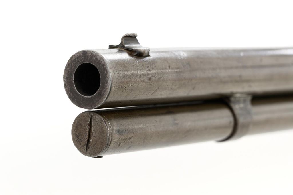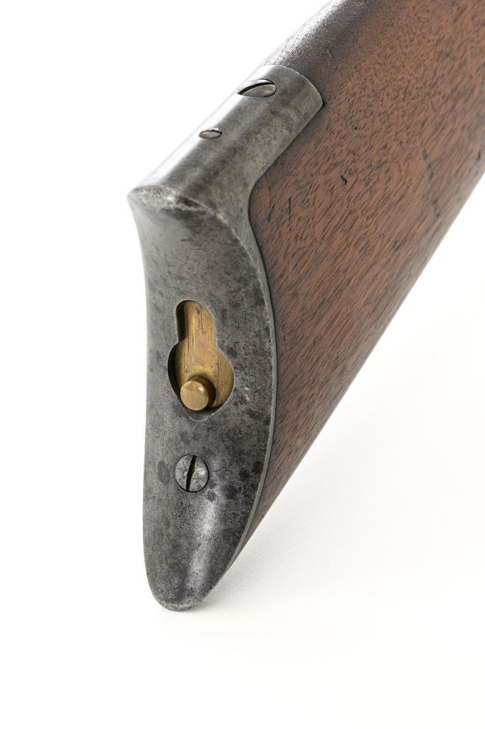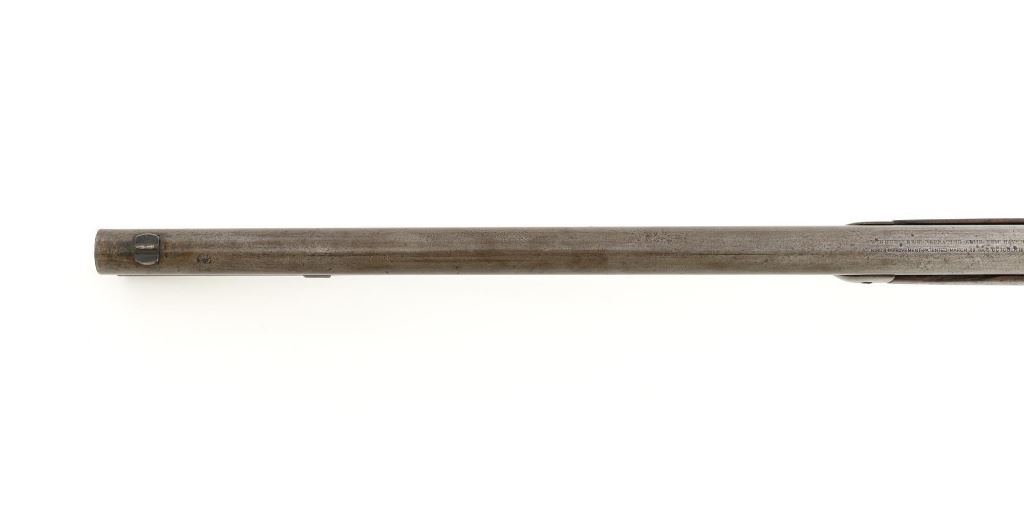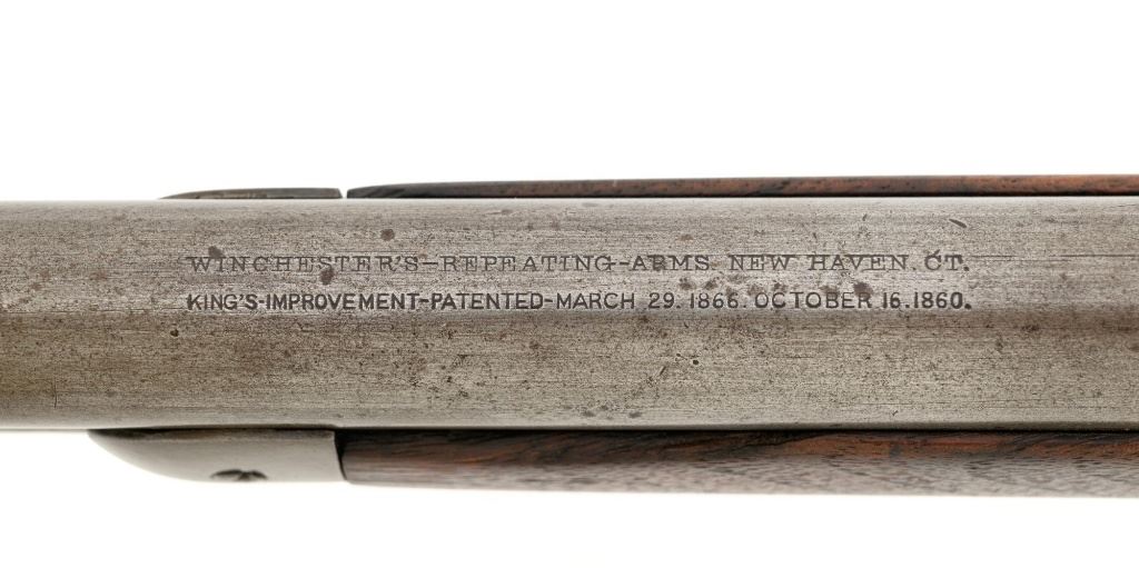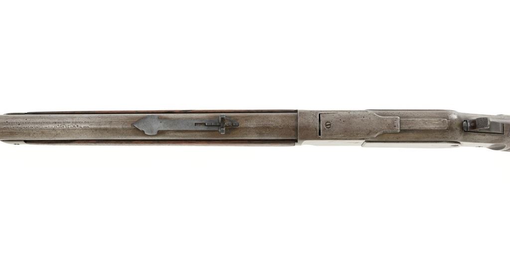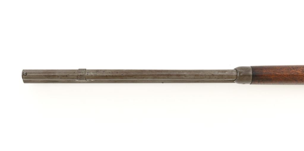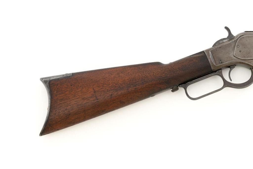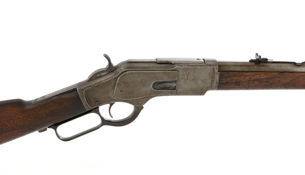 Antique Winchester Model 1873 3rd Model Lever Action Rifle, #182913, .44 W.C.F. cal., 24" round barrel, originally with a blue finish, smooth walnut straight grip stock and forend, crescent steel buttplate, replacement dovetailed Marble No.2 blade front sight, and replacement semi-buckhorn rear sight with elevator. Factory markings are clear with legible caliber marking on the base of the brass cartridge elevator. Mfgd 1885. Rifle is in good overall condition, with the metal surfaces having gone to a mostly even gray patina, with areas of light brown patina, and intermittent spots of mild pitting. Magazine tube with scattered shallow dings and mars. Receiver with small indentations and light erosion, particularly on the right side. Loading gate retains a significant amount of blue finish. Hammer and lever show traces of silvered color case hardened finish in the protected areas; balance is mostly dark. There is a piece missing from the upper left edge of the forend. Wood is otherwise very good, with scattered light dents and scratches, and the wood to metal fit is very good. Action functions well. Bore is fair with moderate erosion, deeper near the breech, showing visible rifling. Est.: $1,600-$2,200. (Antique)