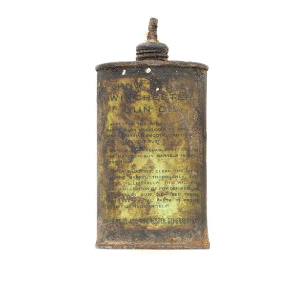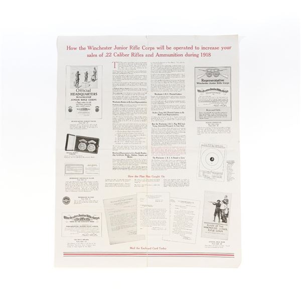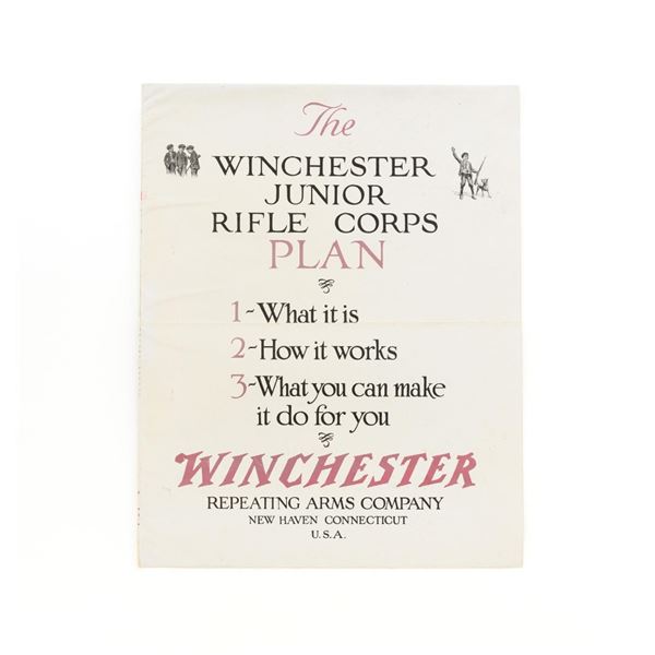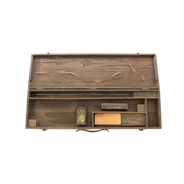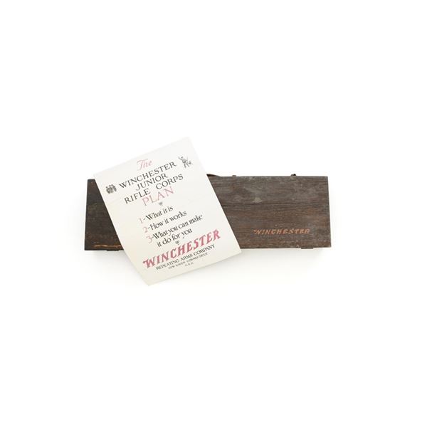 Scarce Winchester Junior Rifle Corps Range Kit Wooden Case with Accessories, wooden case measures 26.75" in length, 8" in width, and 3" in depth, and is in good overall condition. Exterior shows typical weathering and wear to the edges. There are two full-length cracks spanning the length of the lid. The red Winchester marking is clearly visible. Case shows dovetailed construction with brass hardware and leather handle. Brass hardware has gone to a dark patina with age. Interior consists of bare wood partitions, configured for a takedown rifle, with original retention straps in the lid. The case includes a vintage Winchester heavy gun oil can, tube of Winchester gun grease in the original box, and nickel cleaning rod with a brass cap. Interior is in very good condition, showing age, with scrapes and soiling. Beginning in 1918, the Winchester Junior Rifle Corps (WJRC) offered young shooters not only membership in the Corps, but the option to purchase one of two range kits. Kit #1 included a Model 1902 single shot .22 takedown rifle. Kit #2 included a Model 1904 .22 takedown rifle. Each kit included a "Handsome mission-finished wood case fitted with leather handle". The wood case included the range kit of gun oil, grease, cartridge pouch, belt, targets, cartridges and additional accessories. The WJRC operated into the 1930s, including over 100,000 youth worldwide at its peak. The lot includes a copy of a Winchester advertiser explaining the WJRC plan. A rarely encountered piece that should be completed and displayed. Est.: $1,000-$2,000.