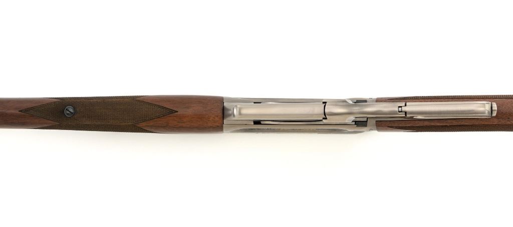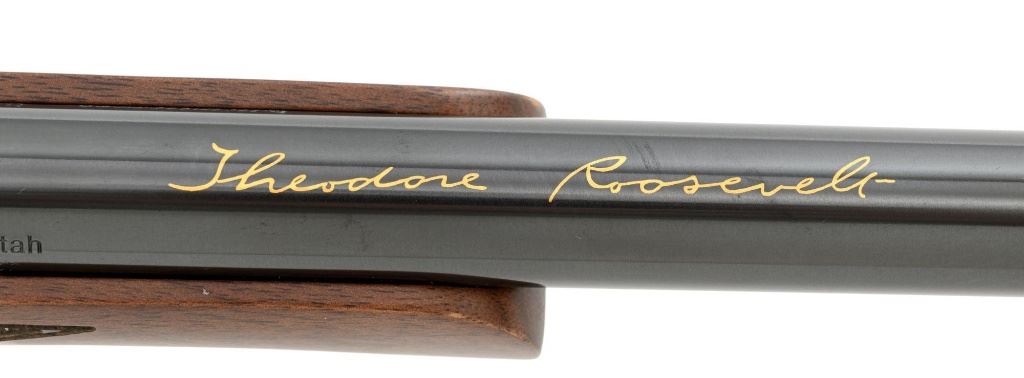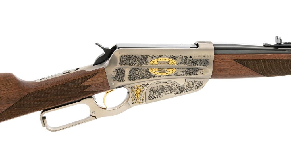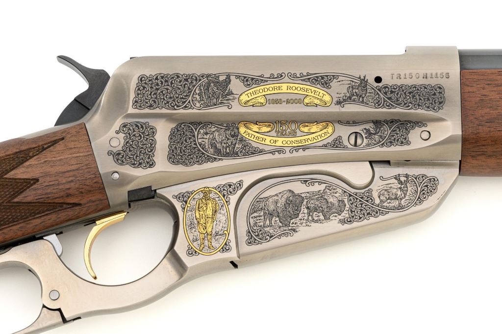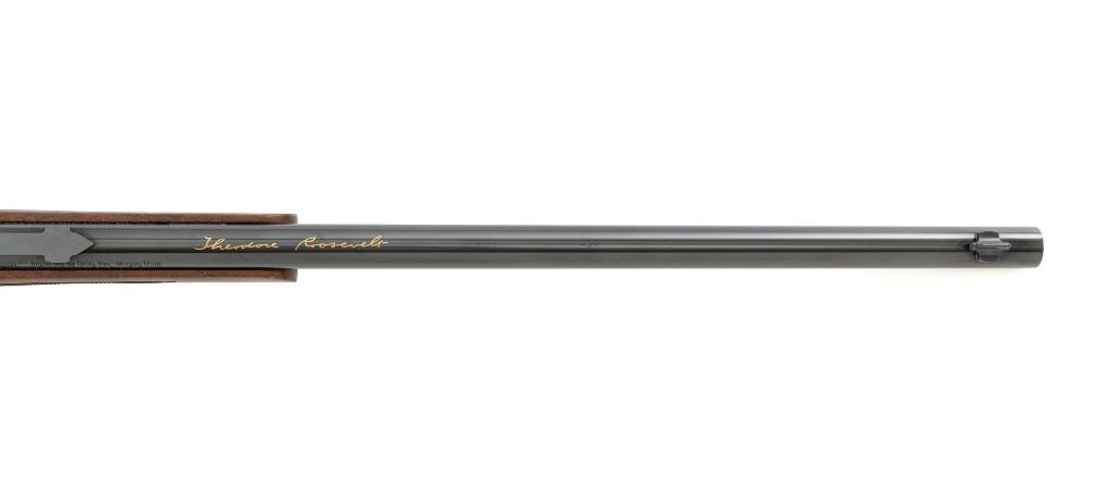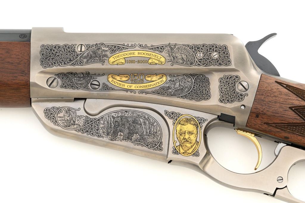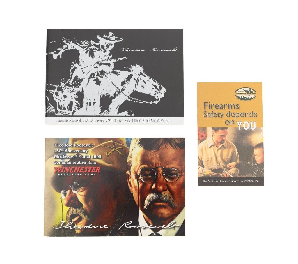 Winchester Model 1895 Theodore Roosevelt 150th Anniversary High Grade Lever Action Rifle, #TR150H1156, .405 Win. cal., 24" barrel, blued barrel and Nitride finished receiver with intricate engraving and gold inlays. Finely checkered deluxe walnut straight grip stock with a Schnabel forend. Right side of the buttstock is inlaid with a gold tone Roosevelt medallion and ends with a smooth blue steel shotgun style buttplate, providing a 13.25" LOP. Sights include a dovetailed brass tipped blade front and semi-buckhorn rear. Factory markings are clear, with sharp Winchester "WP" proof on the left side of the barrel at the breech. Nitride finished engraved receiver displays intricate game scenes on both sides with gold inlay, marked "THEODORE ROOSEVELT 1858-2008 / 150 YEARS FATHER OF CONSERVATION". Includes factory instruction manual, brochure, and associated literature. Mfgd 2008. Rifle is in excellent condition with only modest handling marks to the wood and metal. Action is crisp. Bore is mirror bright with excellent rifling, and appears unfired. Limited in production to 1,000 rifles, featured as a 2008 SHOT Show Special and chambered in Teddys favorite "Big Medicine" caliber. Est.: $1,500-$2,500. (Modern)